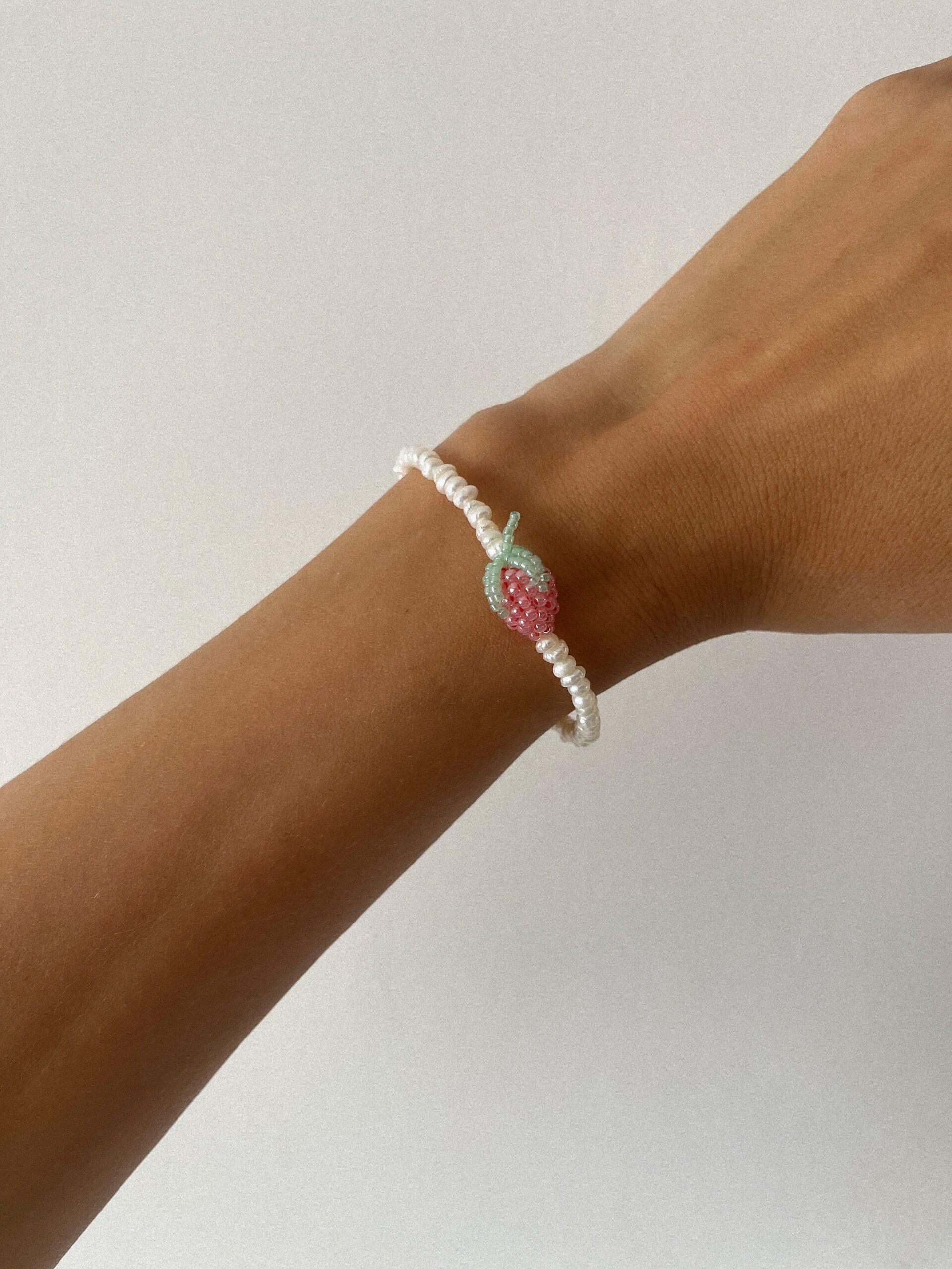 Delikatna, ręcznie wykonana bransoletka z drobnych, naturalnych pereł, ozdobiona uroczą różową maliną z koralików. To słodki akcent w subtelnym wydaniu – idealny na lato, do sukienek, lnianych koszul i codziennych stylizacji z nutką vintage.