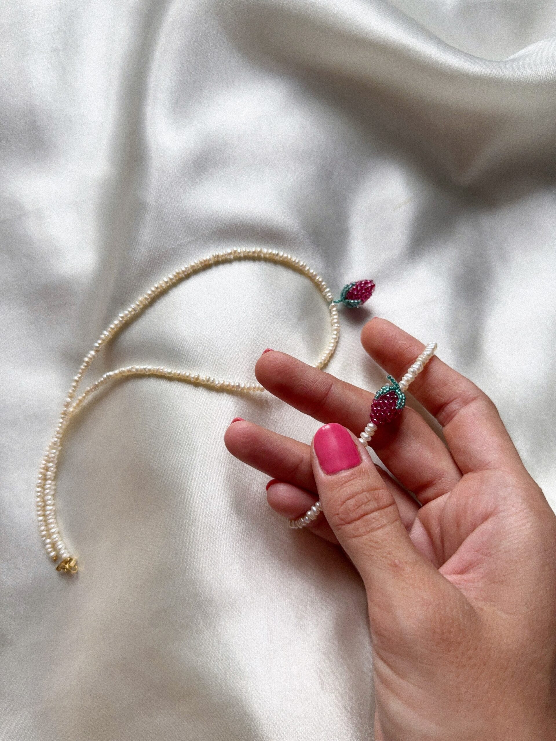 Chcesz cały zestaw? Do bransoletki możesz dobrać naszyjnik z drobnych pereł z tą samą soczystą maliną – razem tworzą słodką, letnią parę.