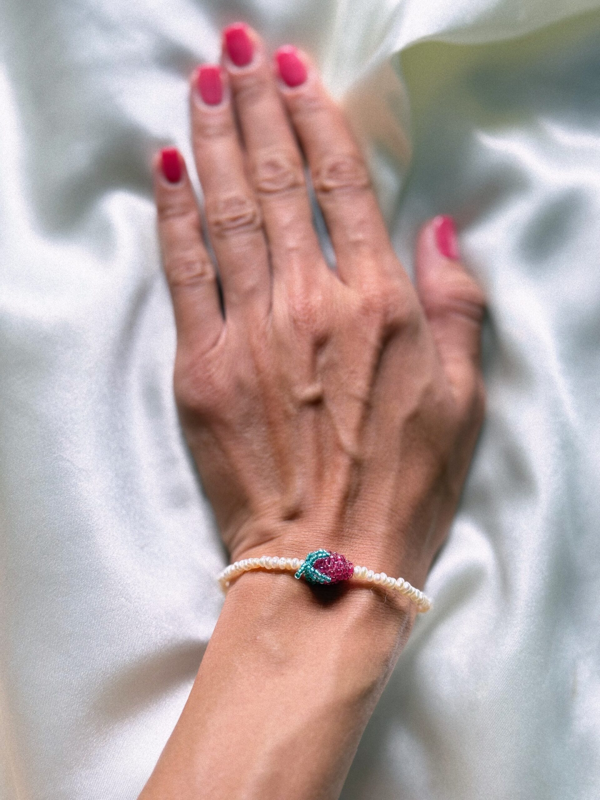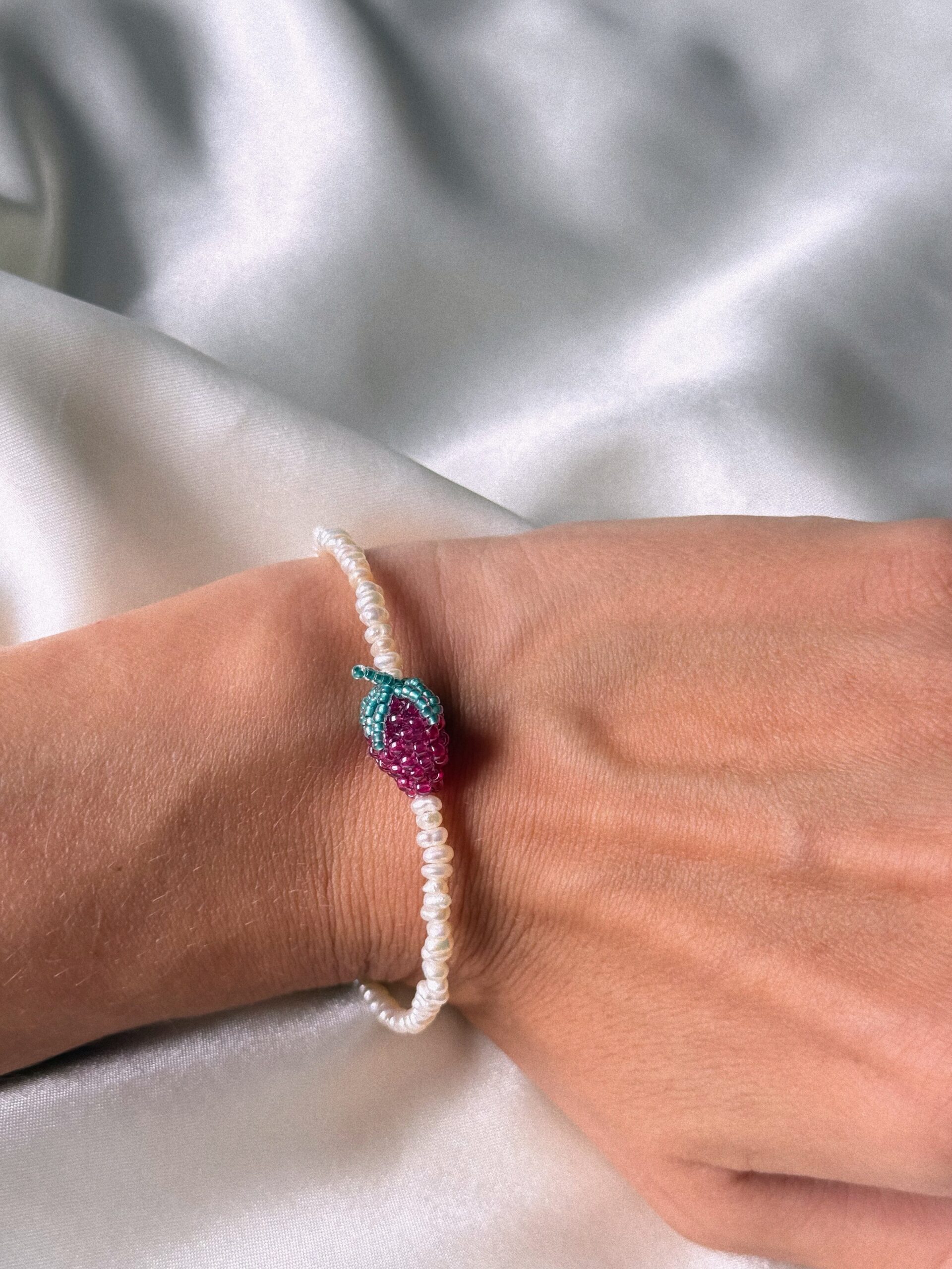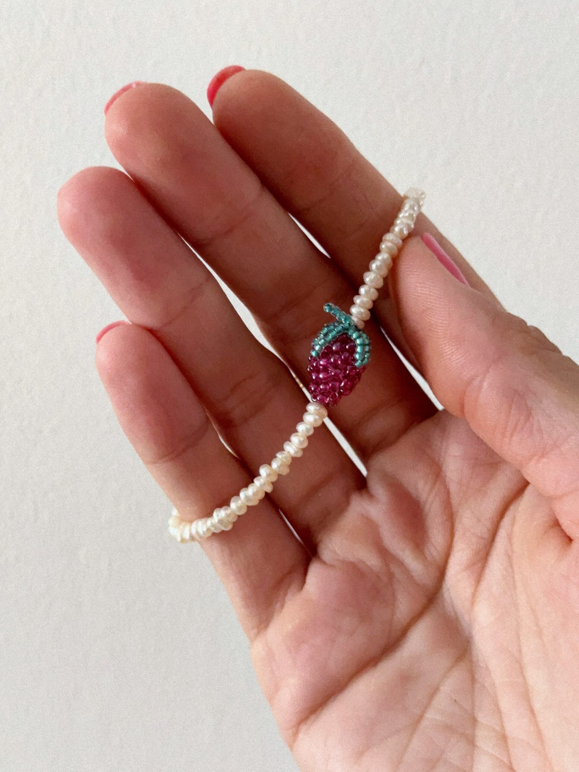 Delikatna, ręcznie wykonana bransoletka z drobnych, naturalnych pereł, ozdobiona zawieszką w kształcie soczystej maliny z koralików. To wyrazisty akcent w letnim wydaniu – idealny do lnianych stylizacji, prostych sukienek i codziennego looku z nutką vintage.