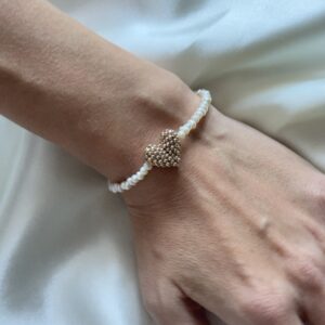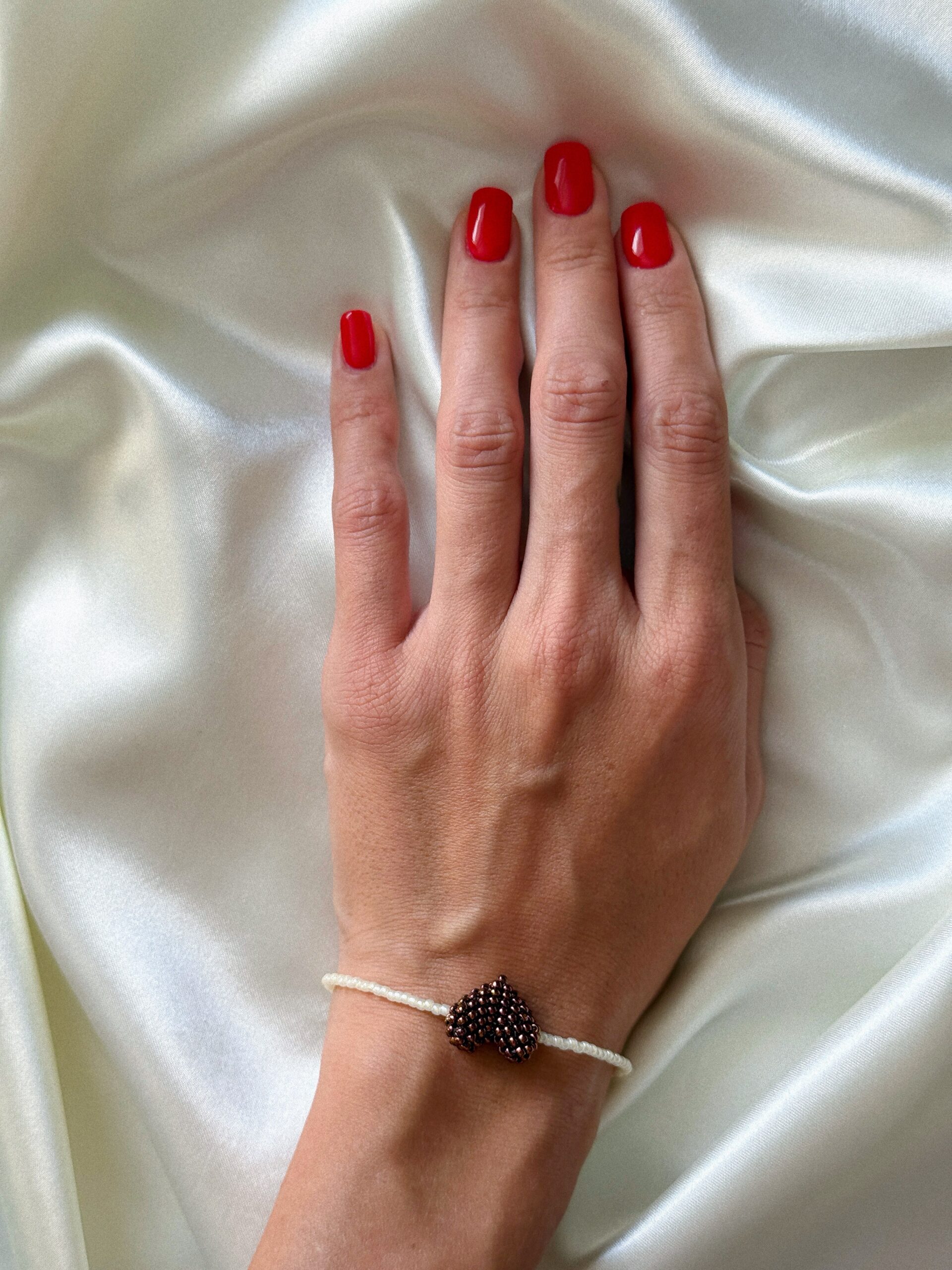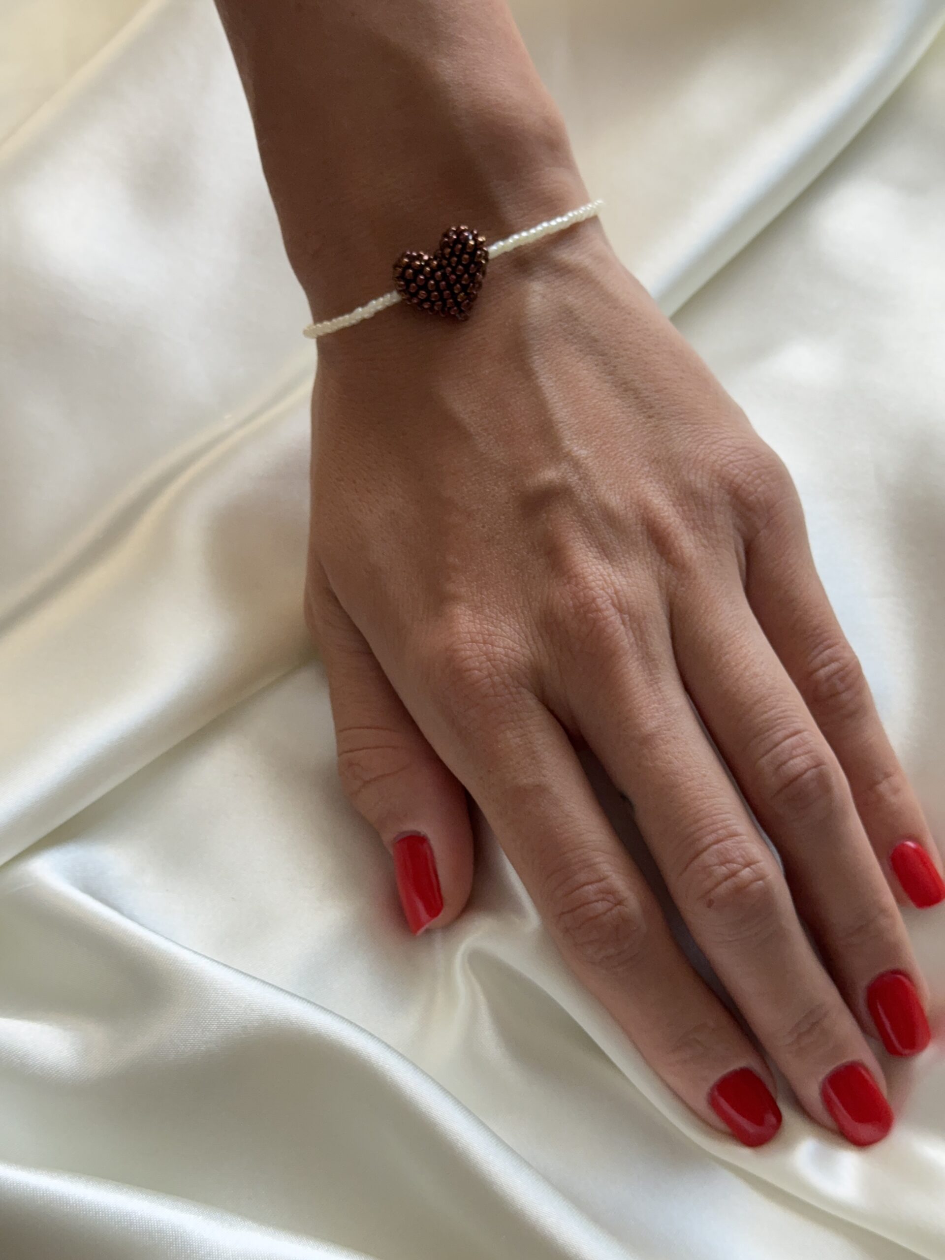 Ręcznie robiona bransoletka z wysokiej jakości koralików, ozdobiona zawieszką w kształcie brązowego serduszka.