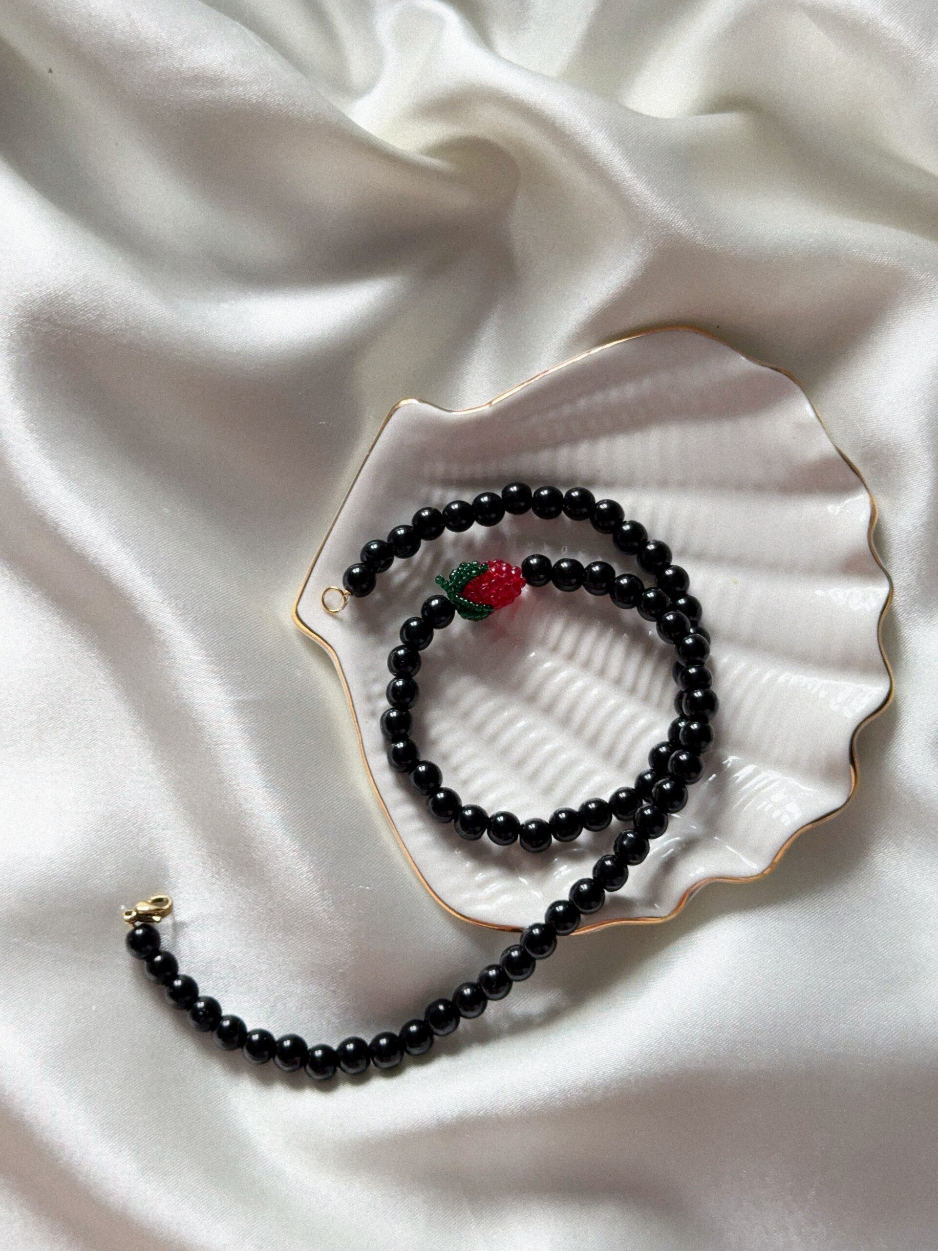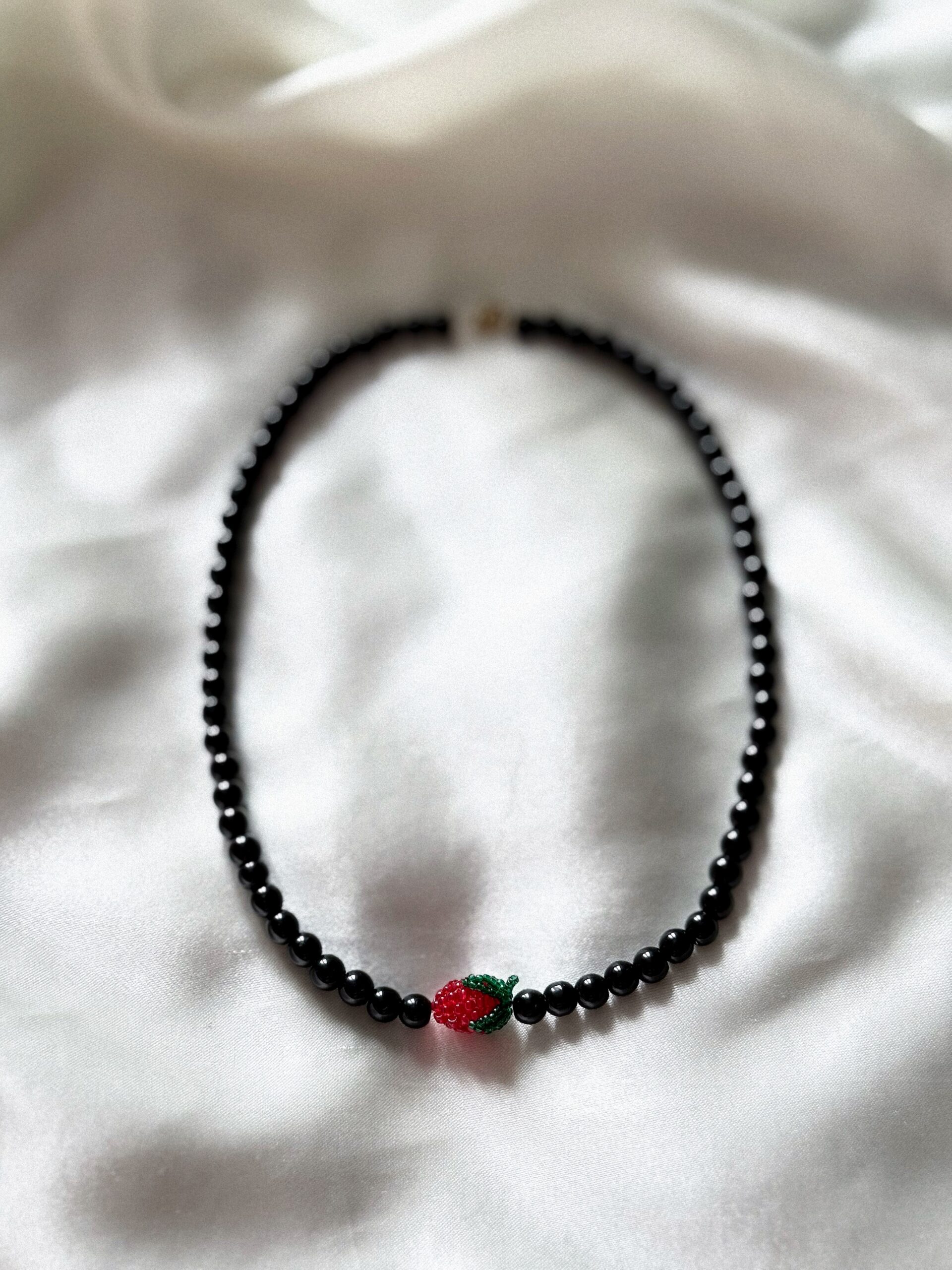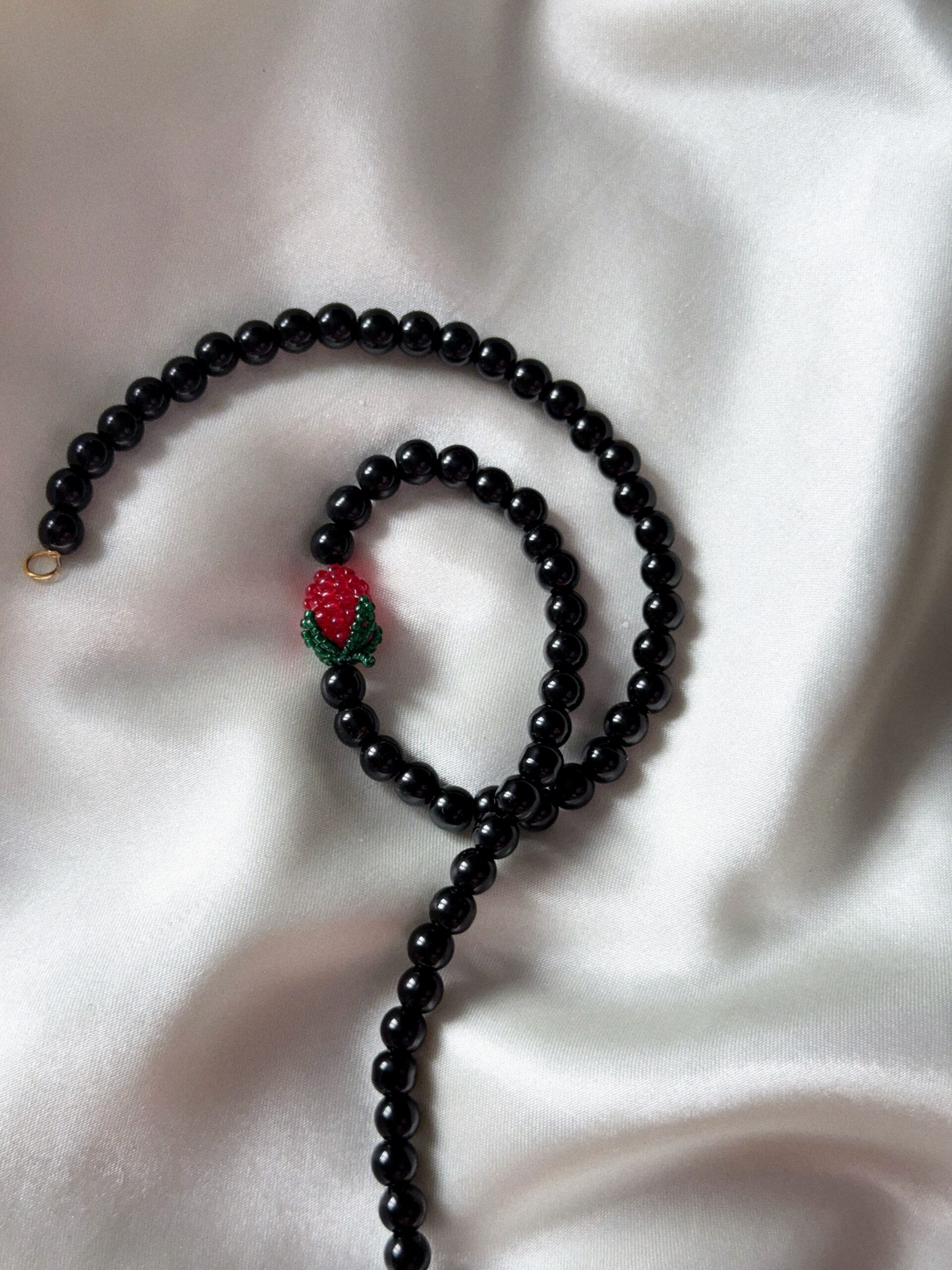 Elegancki, ręcznie robiony naszyjnik z dużych, czarnych koralików, ozdobiony zawieszką w kształcie soczystej, czerwonej truskawki. Połączenie głębokiej czerni z energetycznym akcentem owocu sprawia, że naszyjnik ma wyjątkowy charakter – klasyczny, ale z nutą odważnej świeżości.