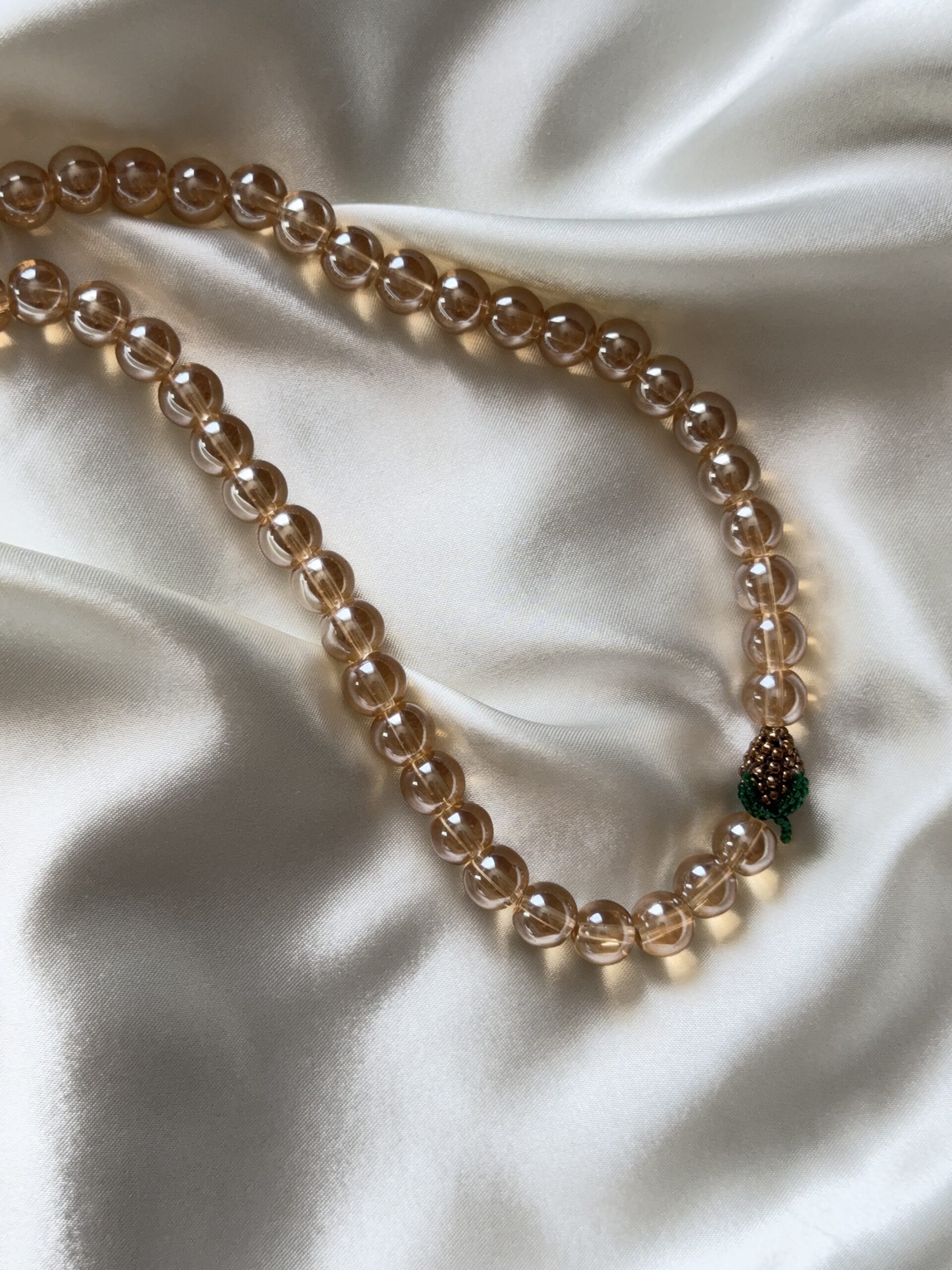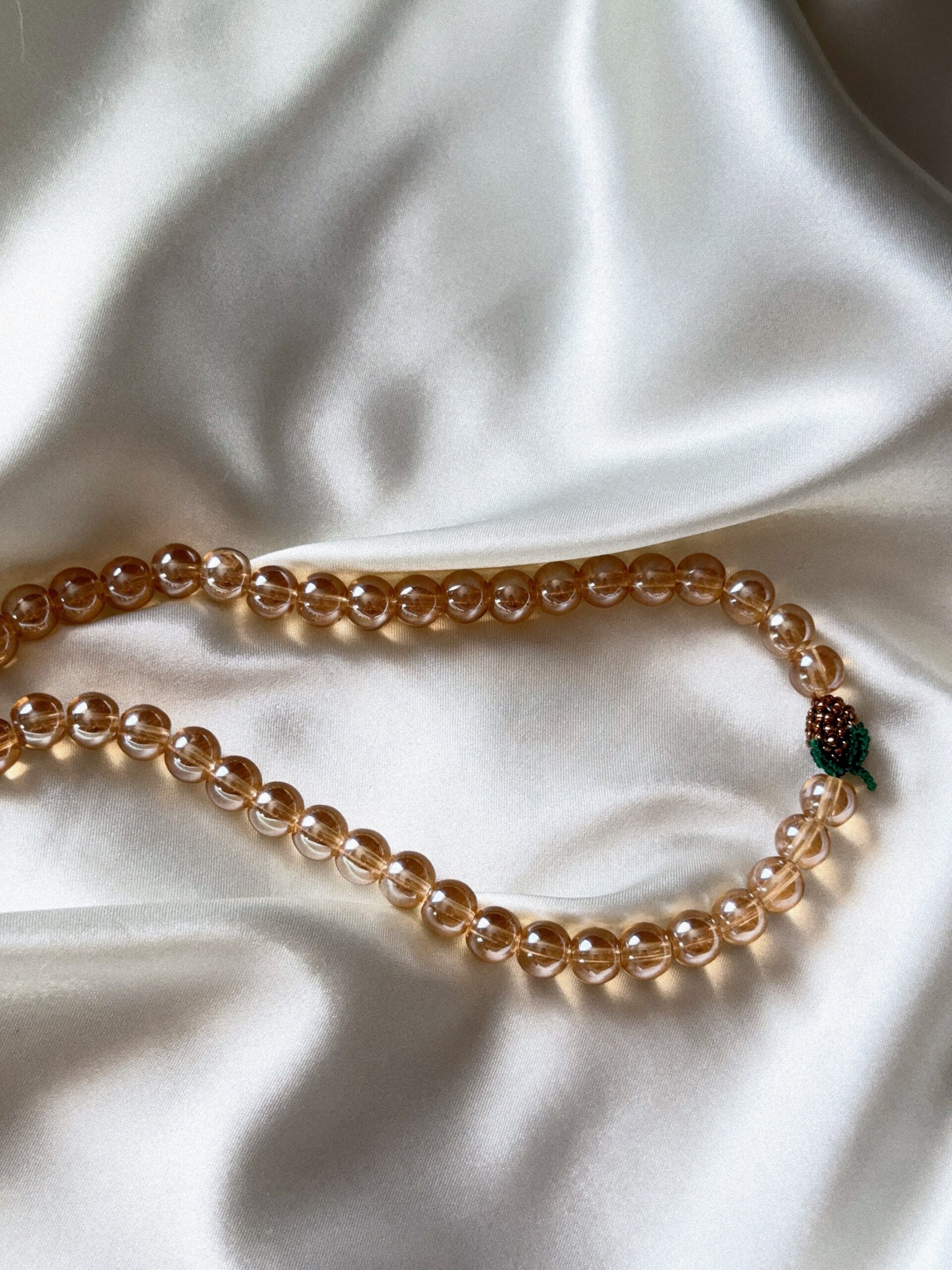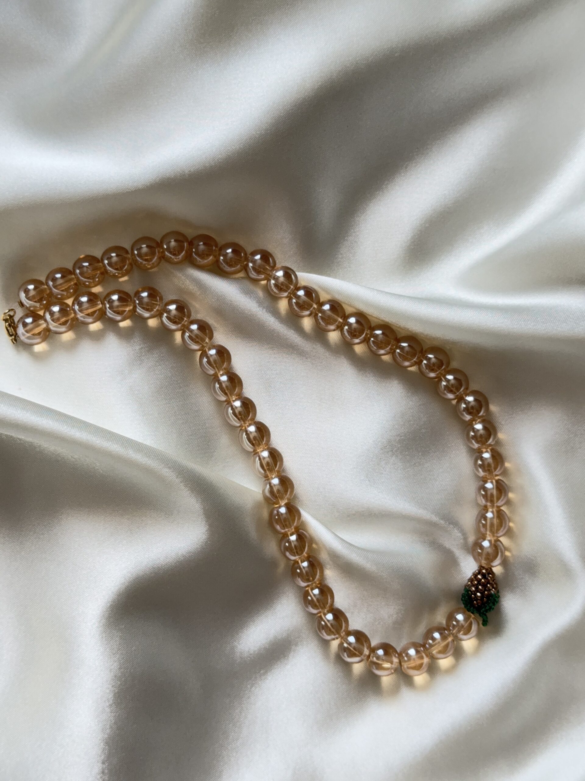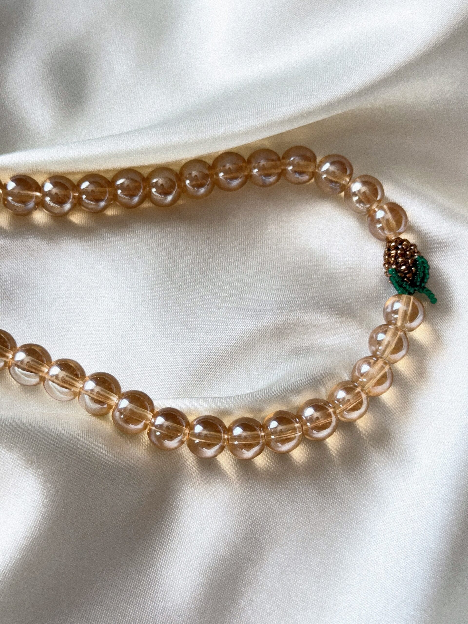 Elegancki, ręcznie robiony naszyjnik z przezroczystych, większych koralików w ciepłym brązowym odcieniu, ozdobiony zawieszką w kształcie brązowego owocka.