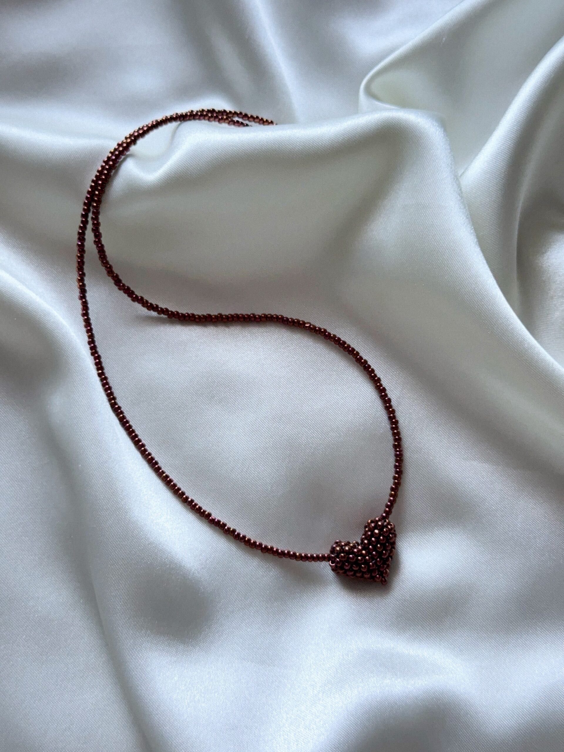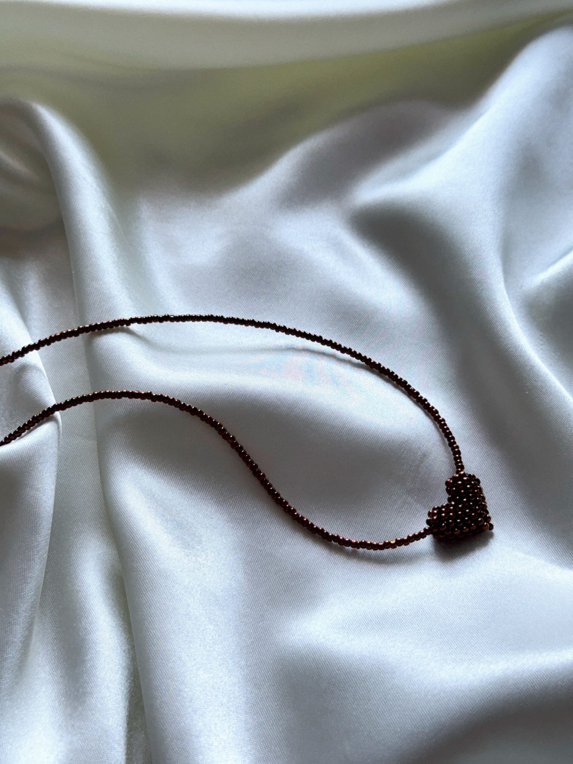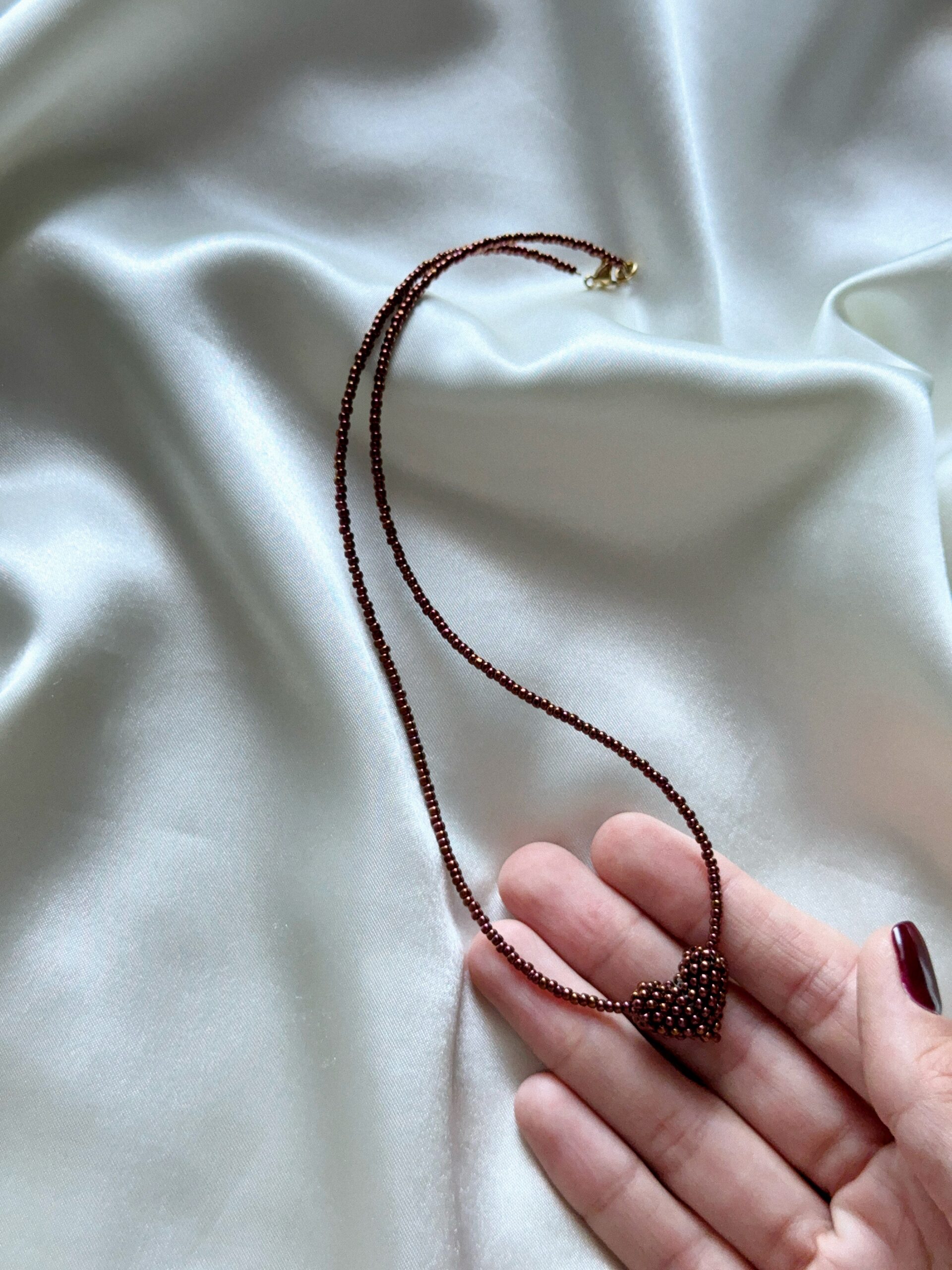 Unikatowy, ręcznie robiony naszyjnik z drobnych brązowych koralików, ozdobiony małym serduszkiem w ciepłym, karmelowo-brązowym odcieniu. Subtelny, ale wyrazisty dodatek, który pięknie prezentuje się solo lub w duecie z innymi naszyjnikami z kolekcji Perelka_mi.