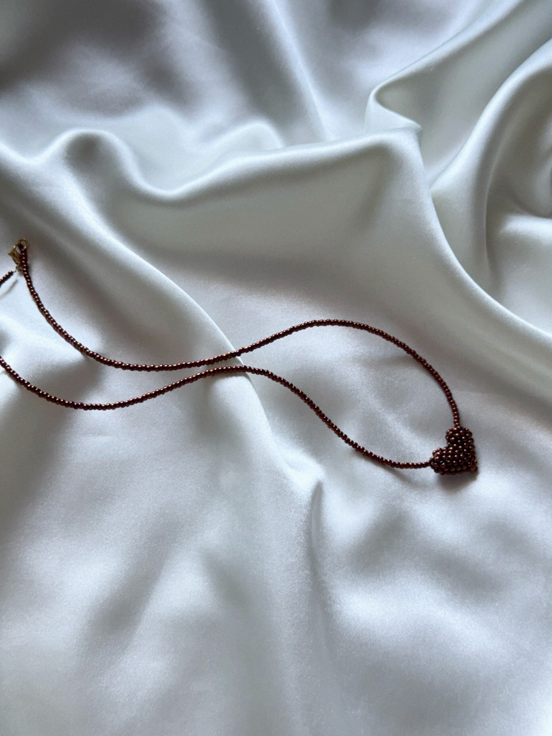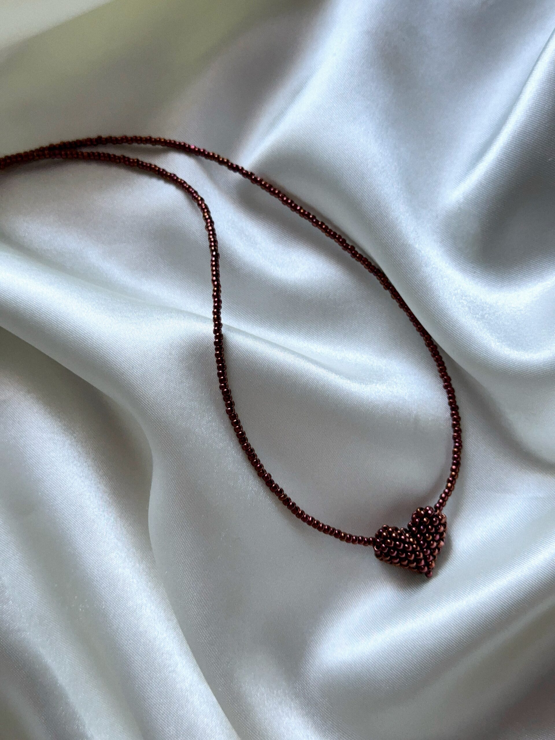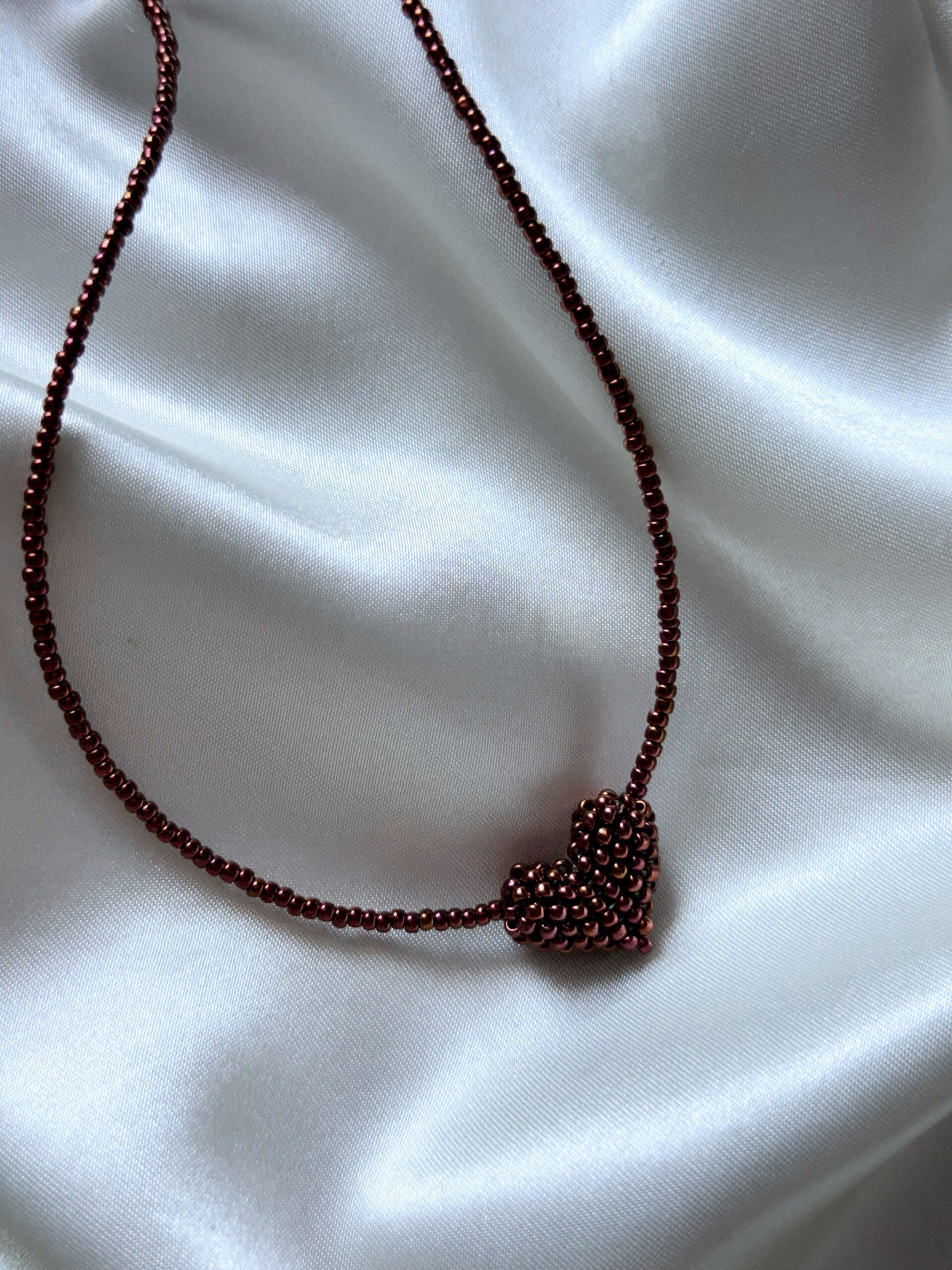 Unikatowy, ręcznie robiony naszyjnik z drobnych brązowych koralików, ozdobiony małym serduszkiem w ciepłym, karmelowo-brązowym odcieniu. Subtelny, ale wyrazisty dodatek, który pięknie prezentuje się solo lub w duecie z innymi naszyjnikami z kolekcji Perelka_mi.