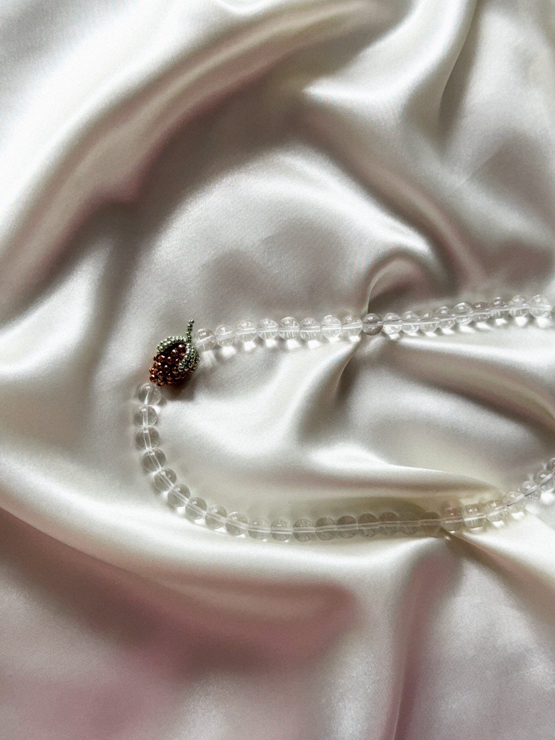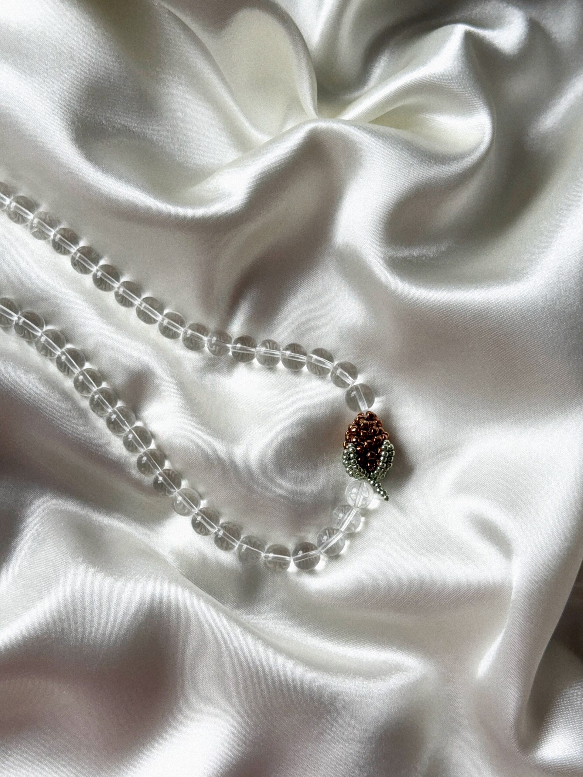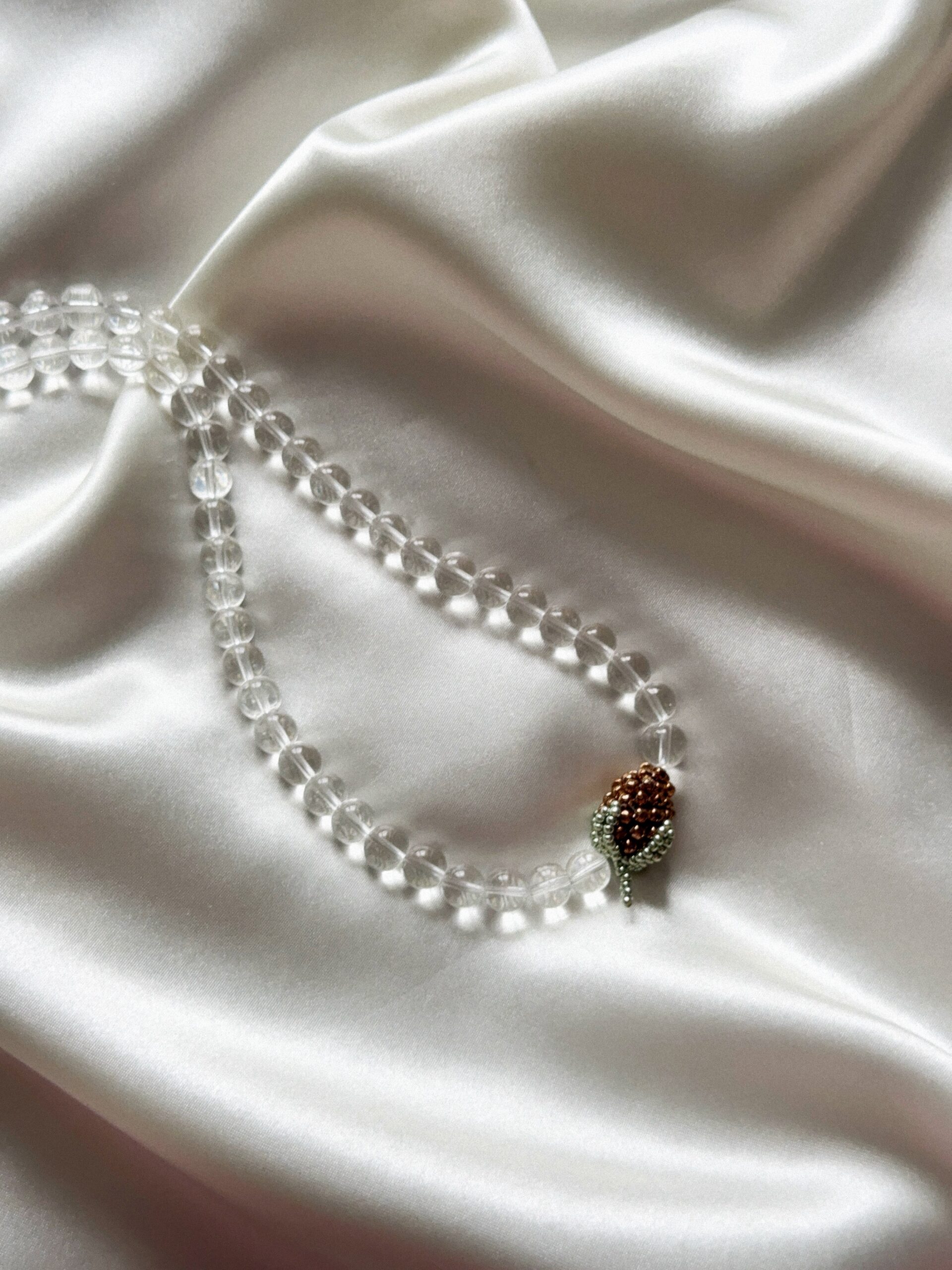 Ręcznie robiony naszyjnik ze szklanych, przezroczystych koralików, ozdobiony większym brązowym owocem.