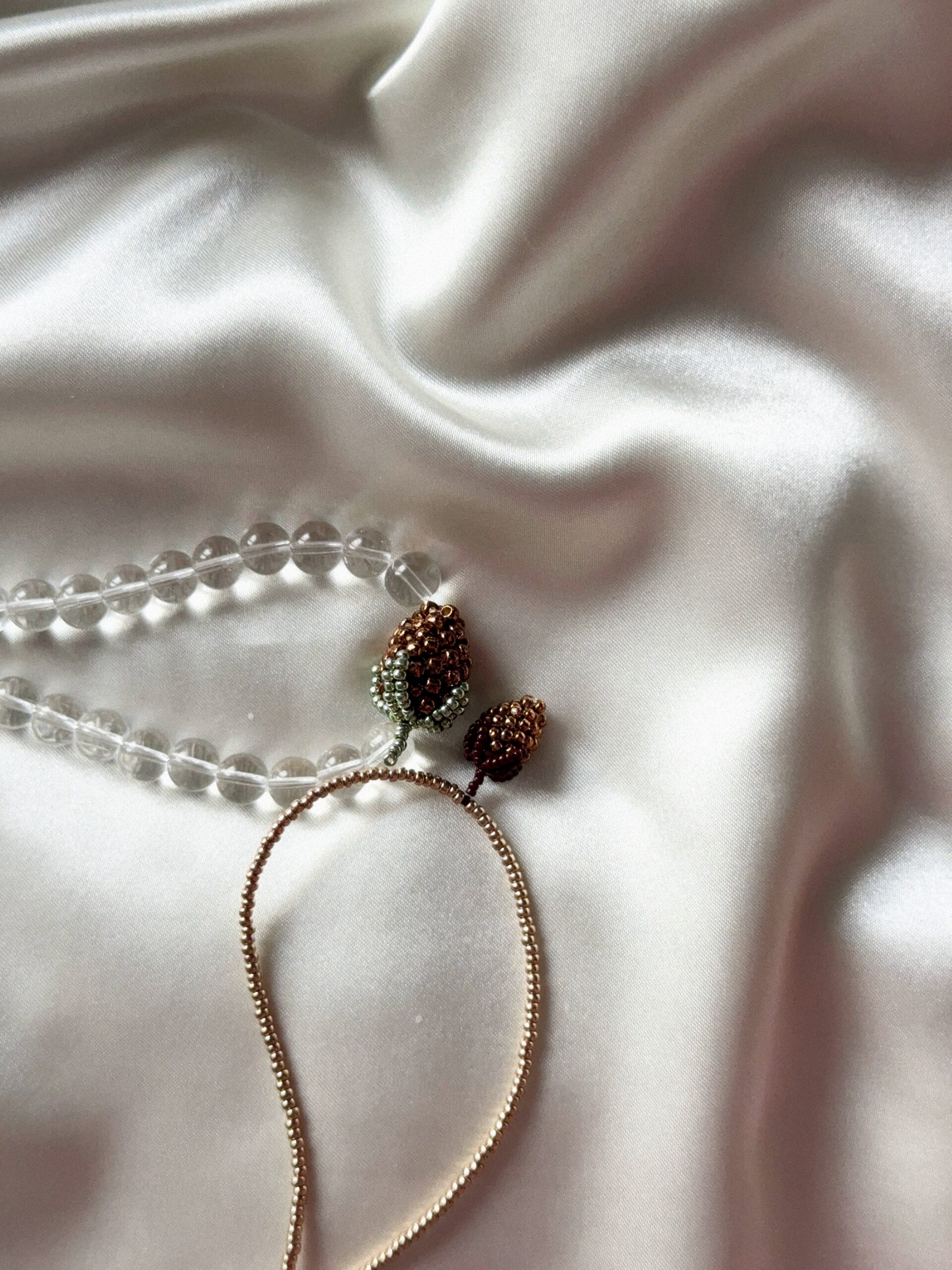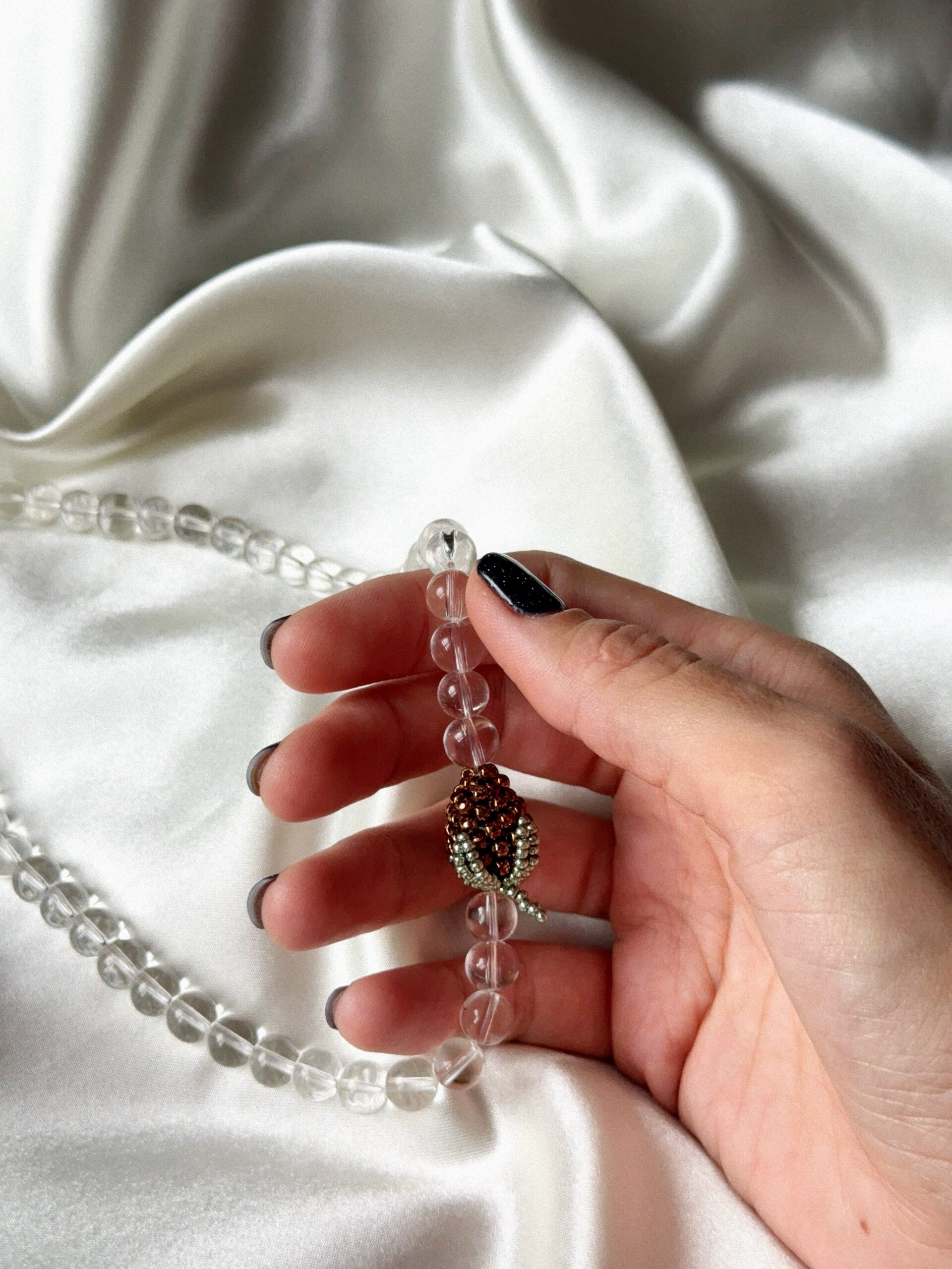 Przejrzyste koraliki pięknie łapią światło, a ciepły, brązowy akcent nadaje całości naturalnego uroku i subtelnej elegancji.
