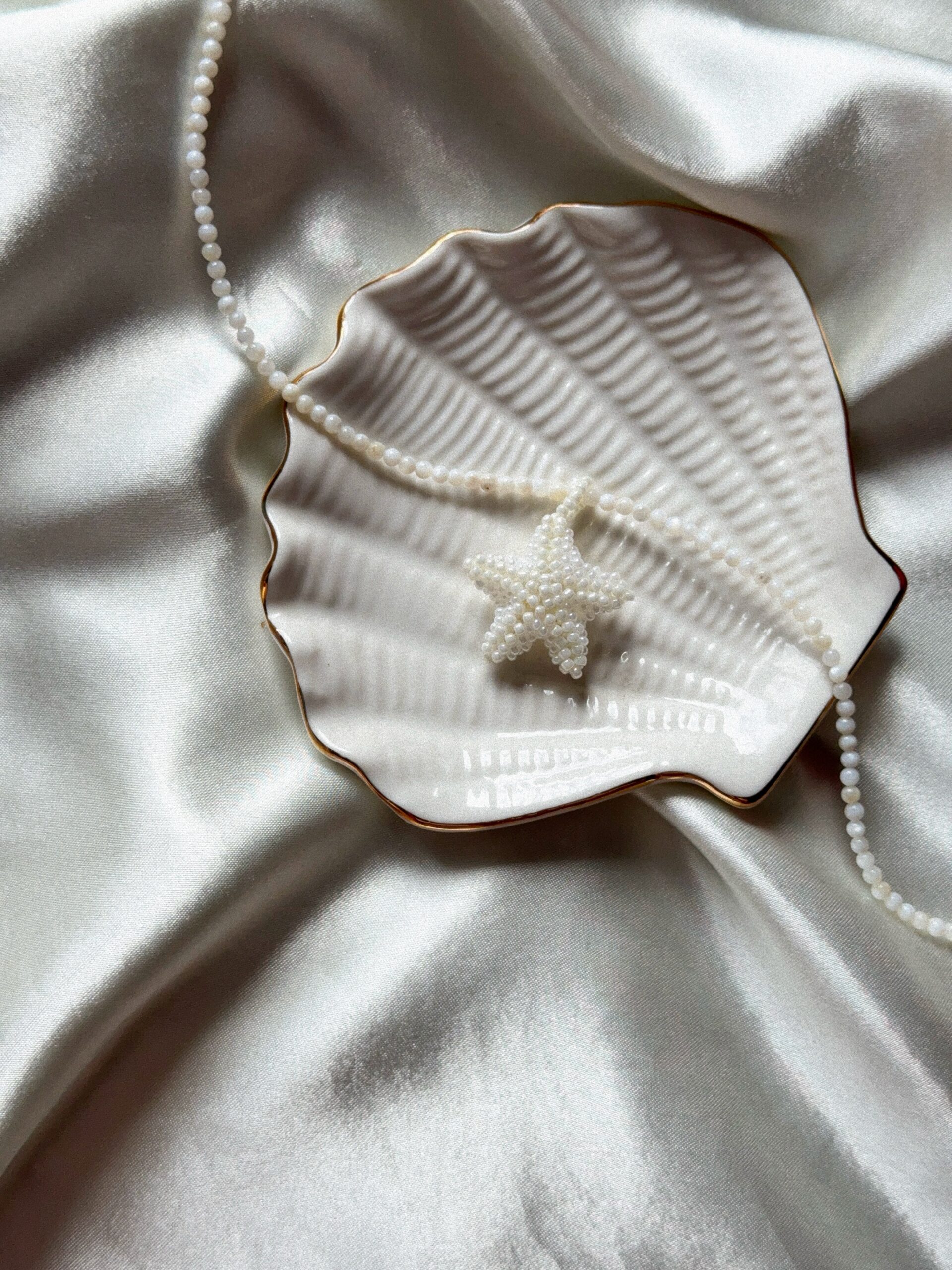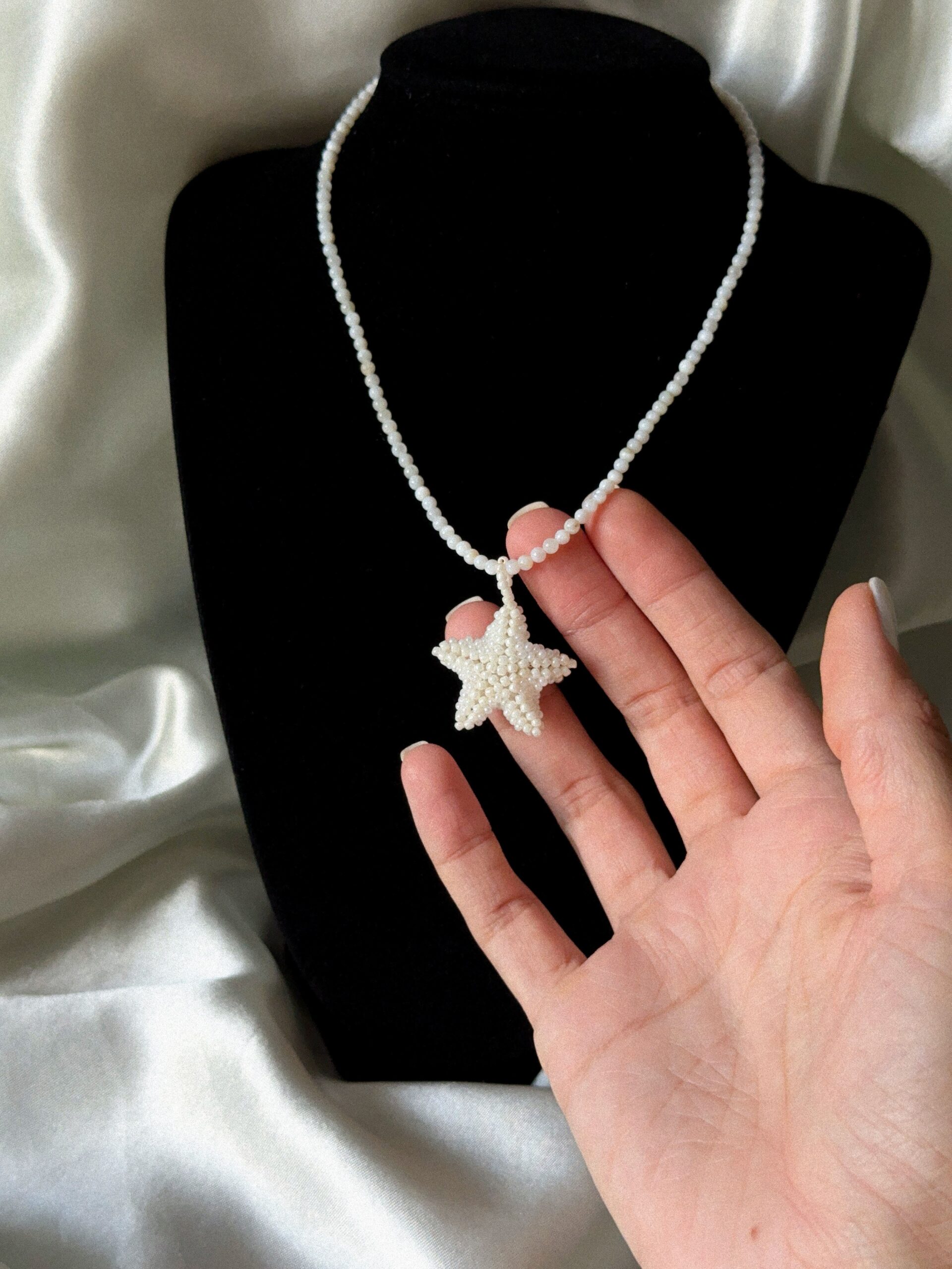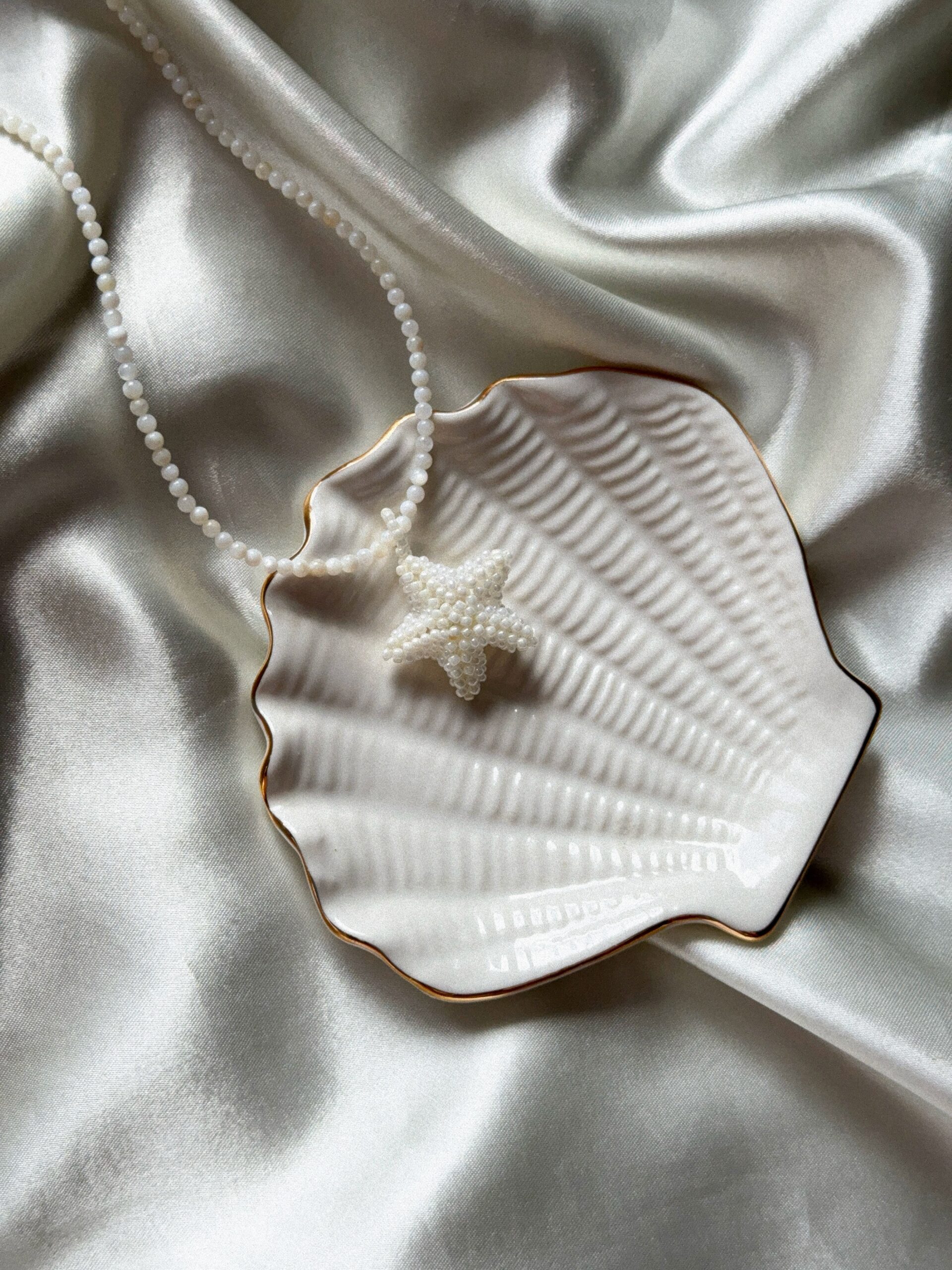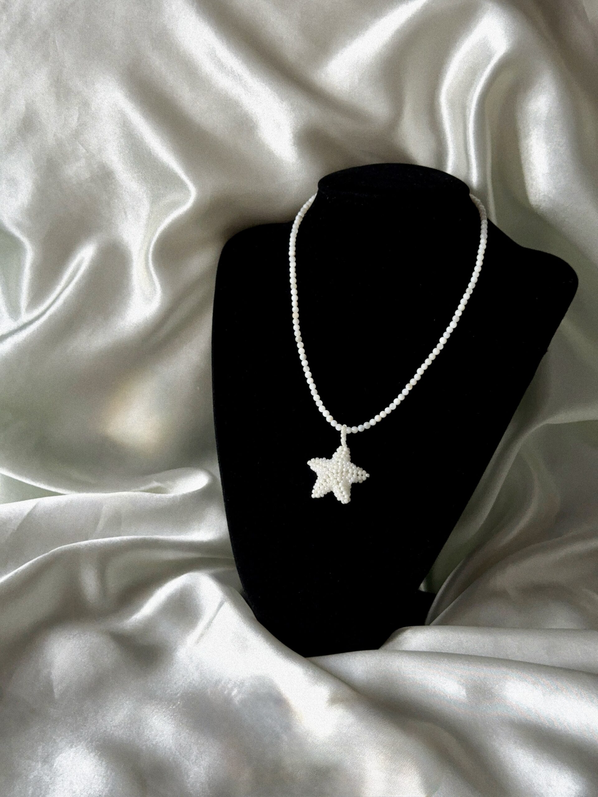 Ręcznie tworzony, delikatny naszyjnik z łańcuszkiem z masy perłowej w subtelnych, białych odcieniach. Centralnym punktem jest gwiazda wykonana z drobnych koralików, która dodaje biżuterii wyjątkowego uroku i lekkości.