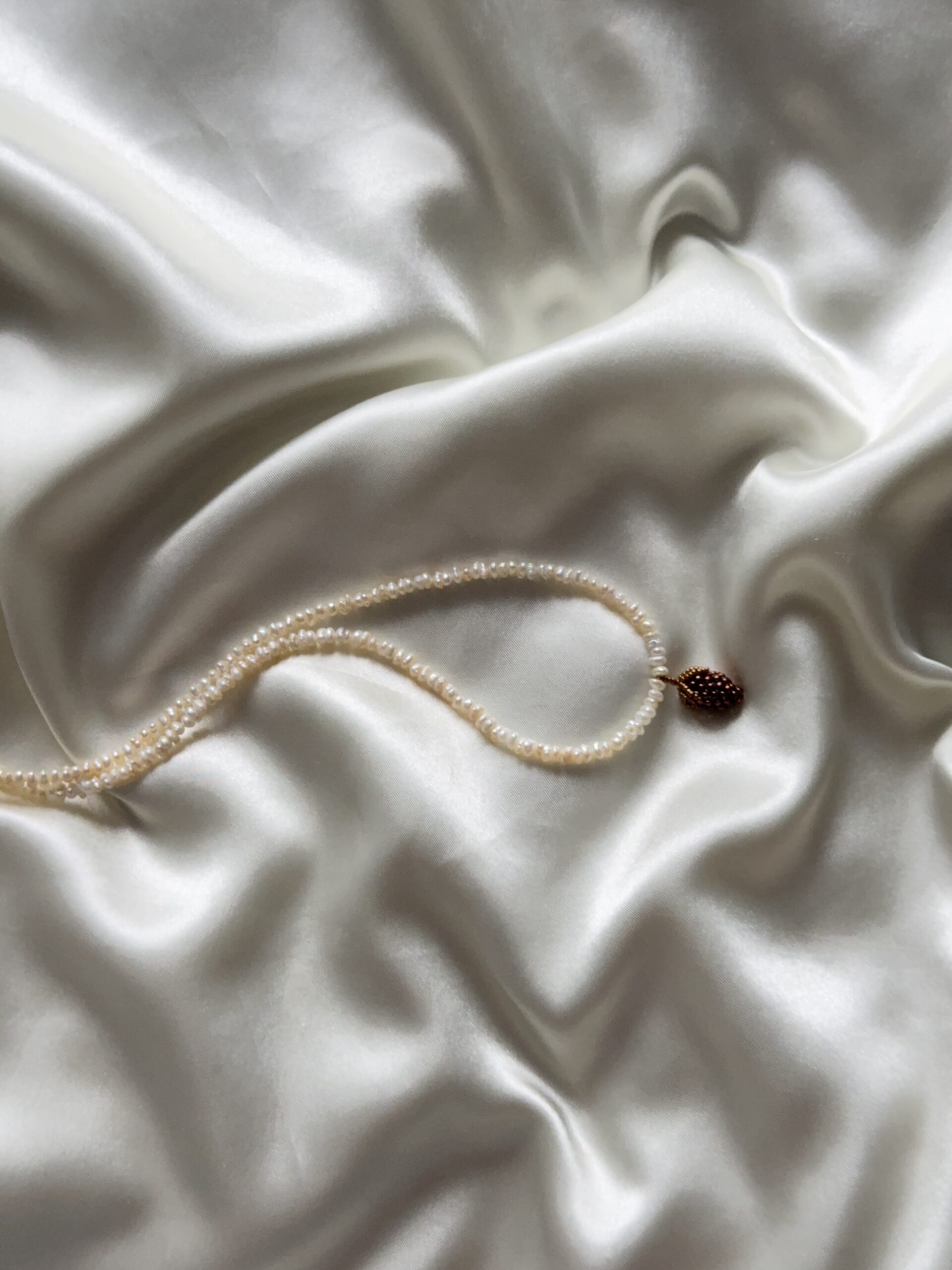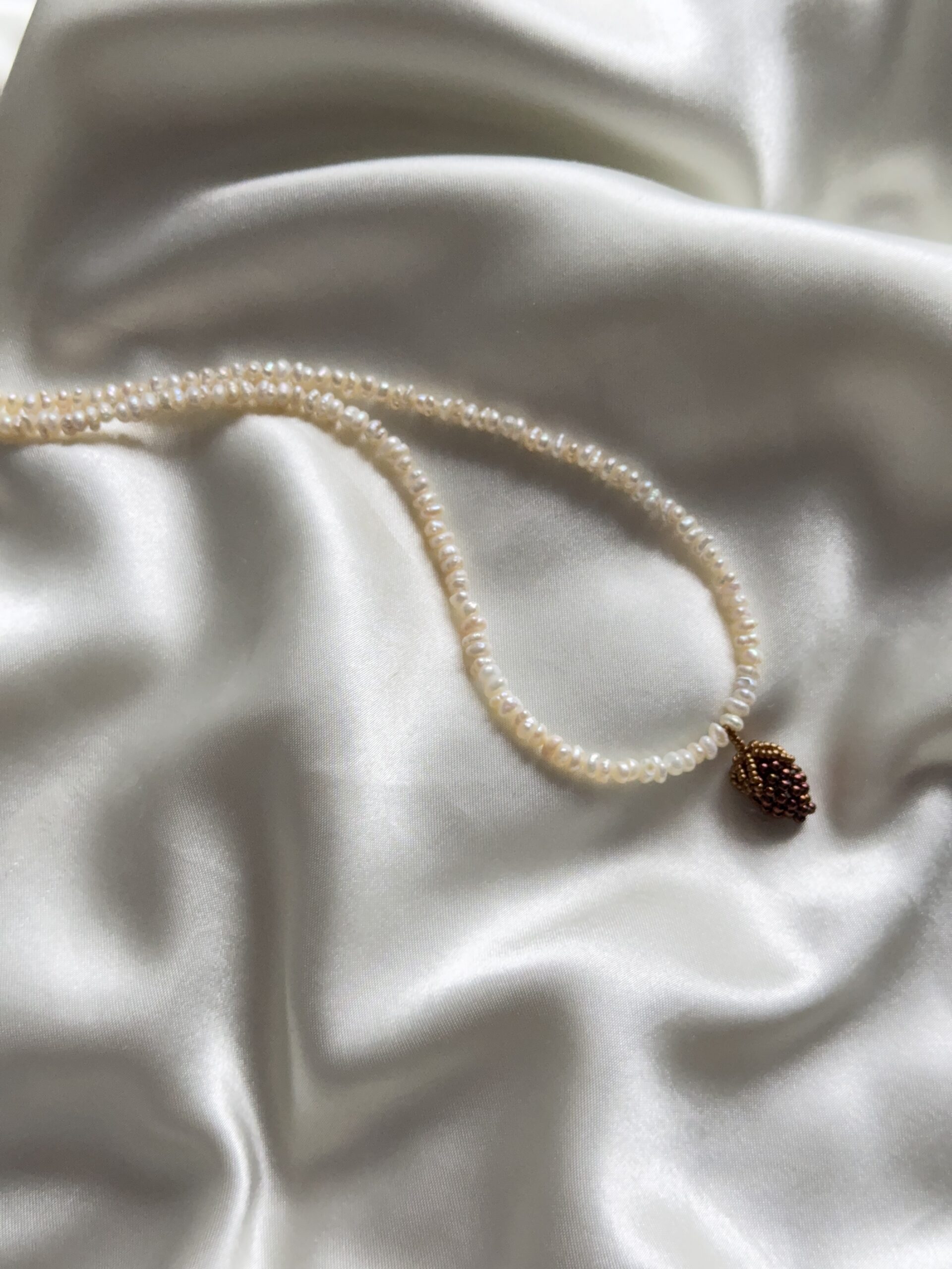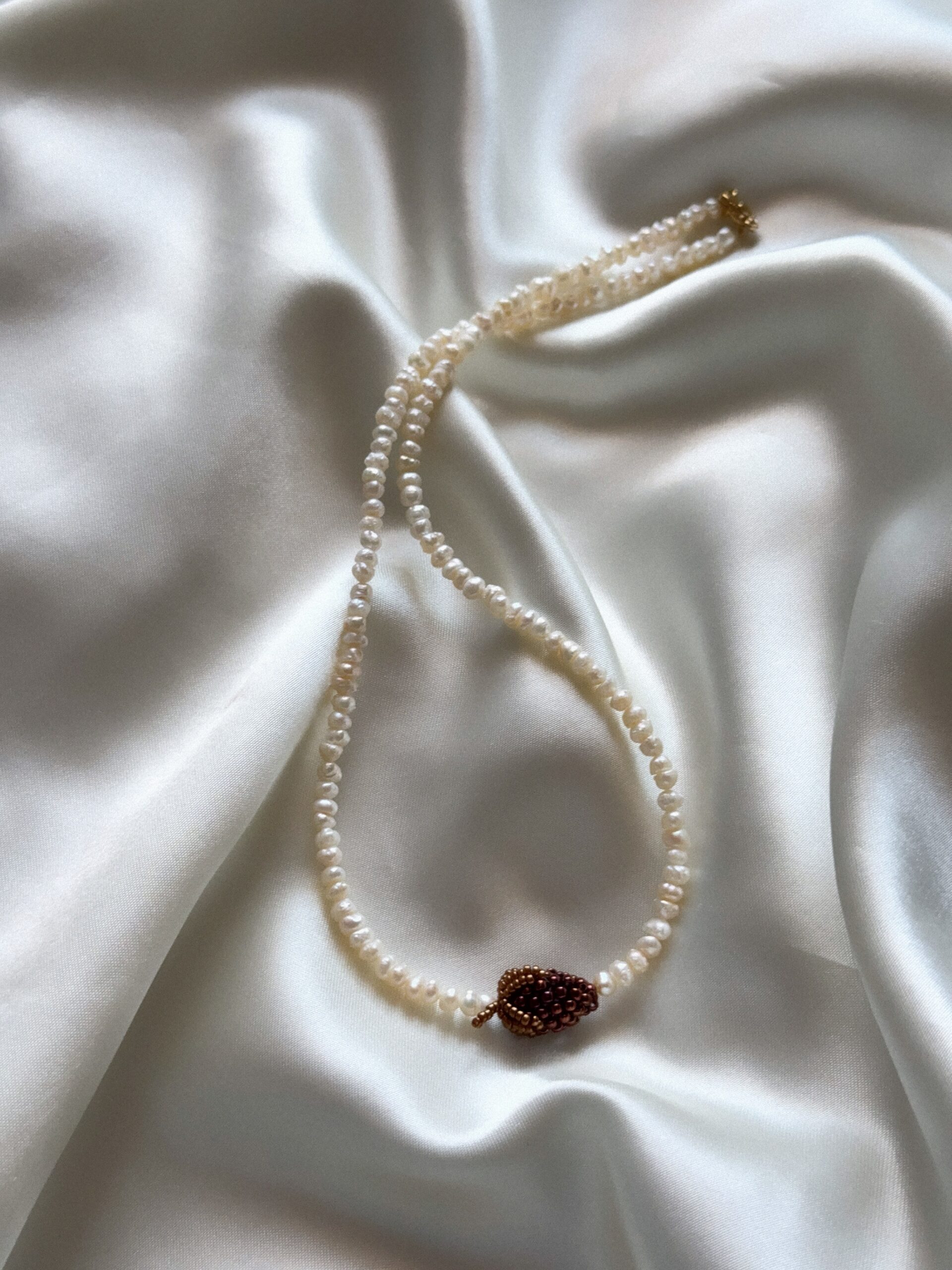 Delikatny, ręcznie robiony naszyjnik z drobnych, naturalnych pereł, ozdobiony zawieszką w kształcie brązowego owocu uplecionego z maleńkich koralików.