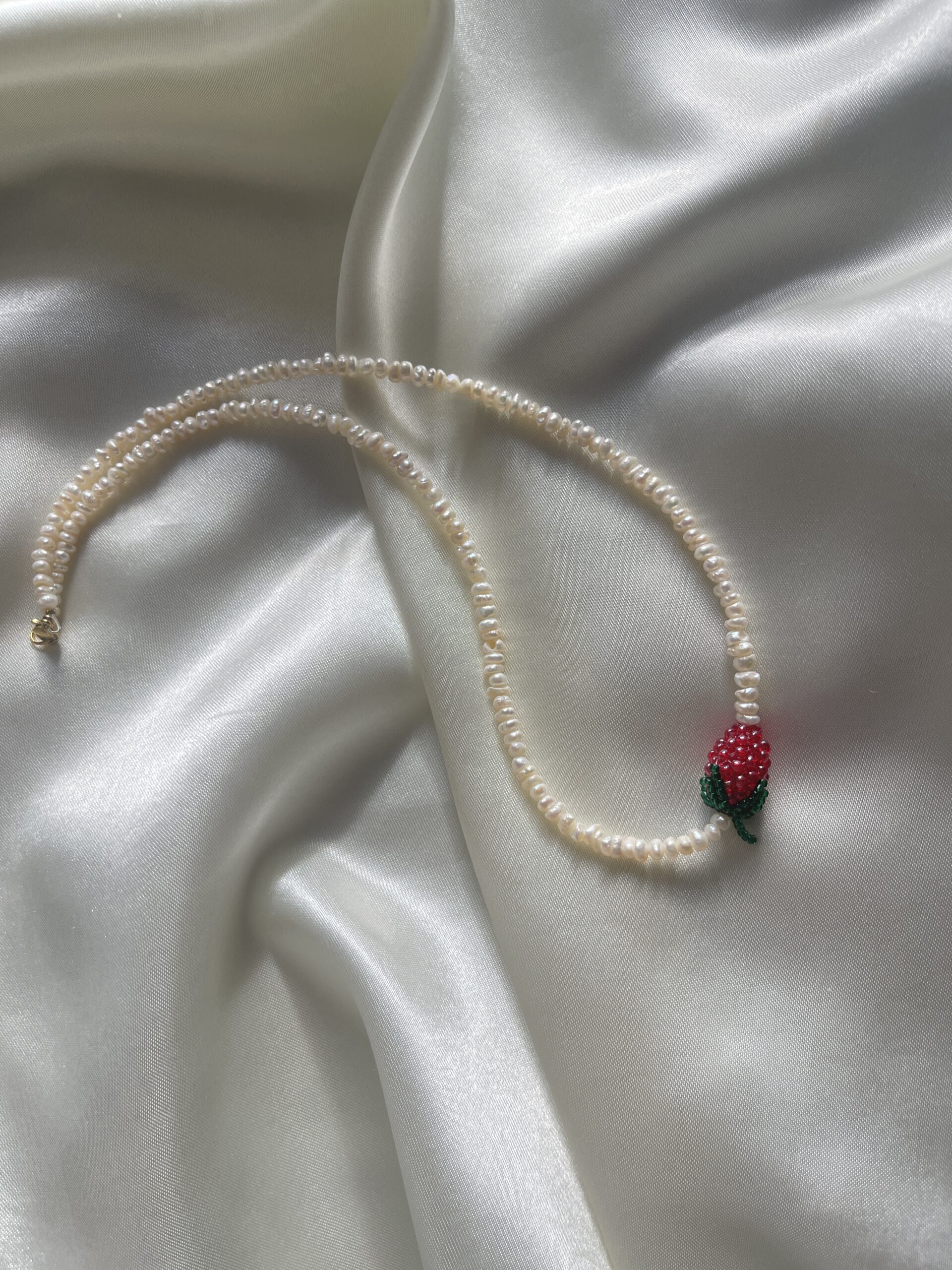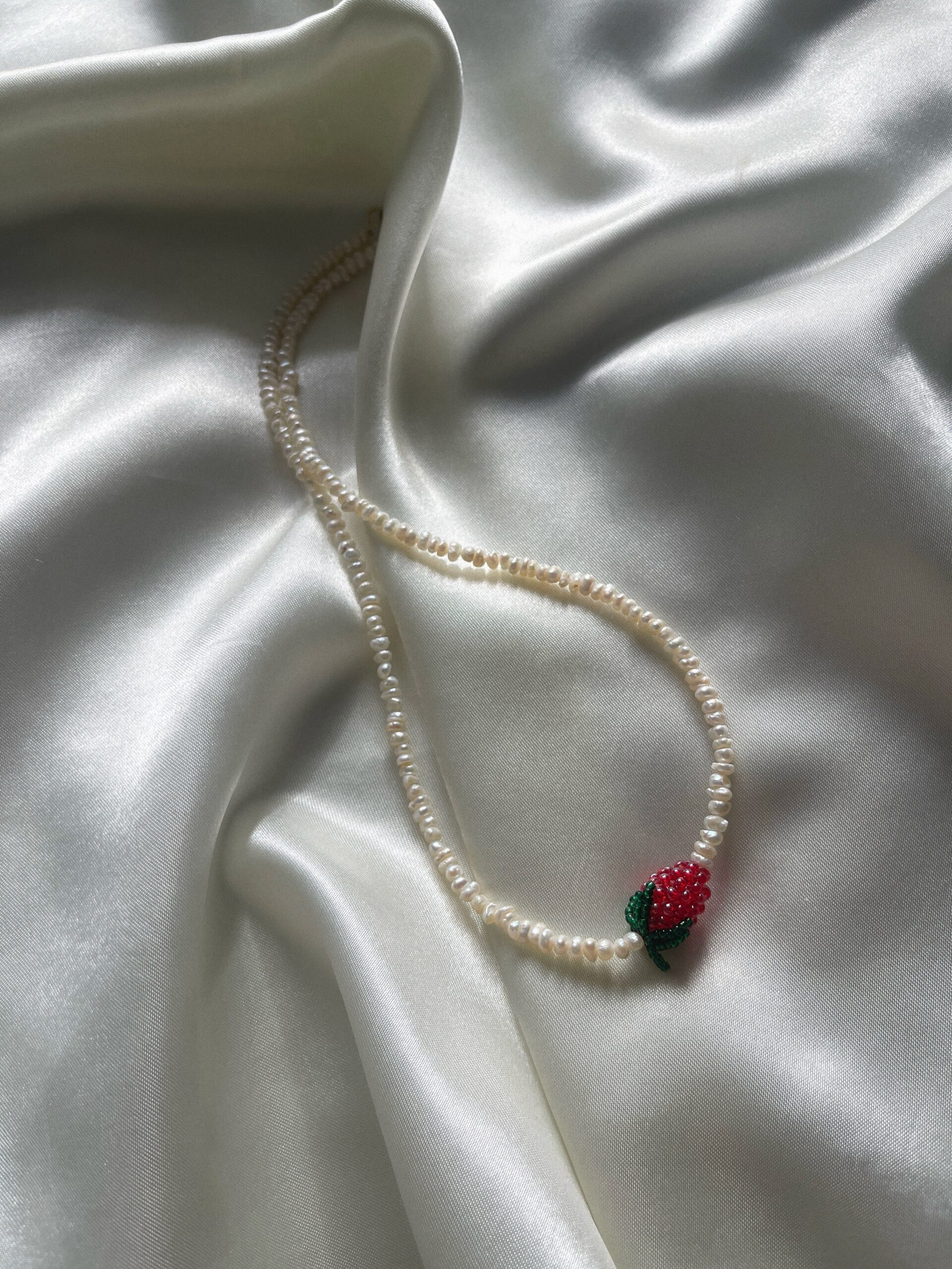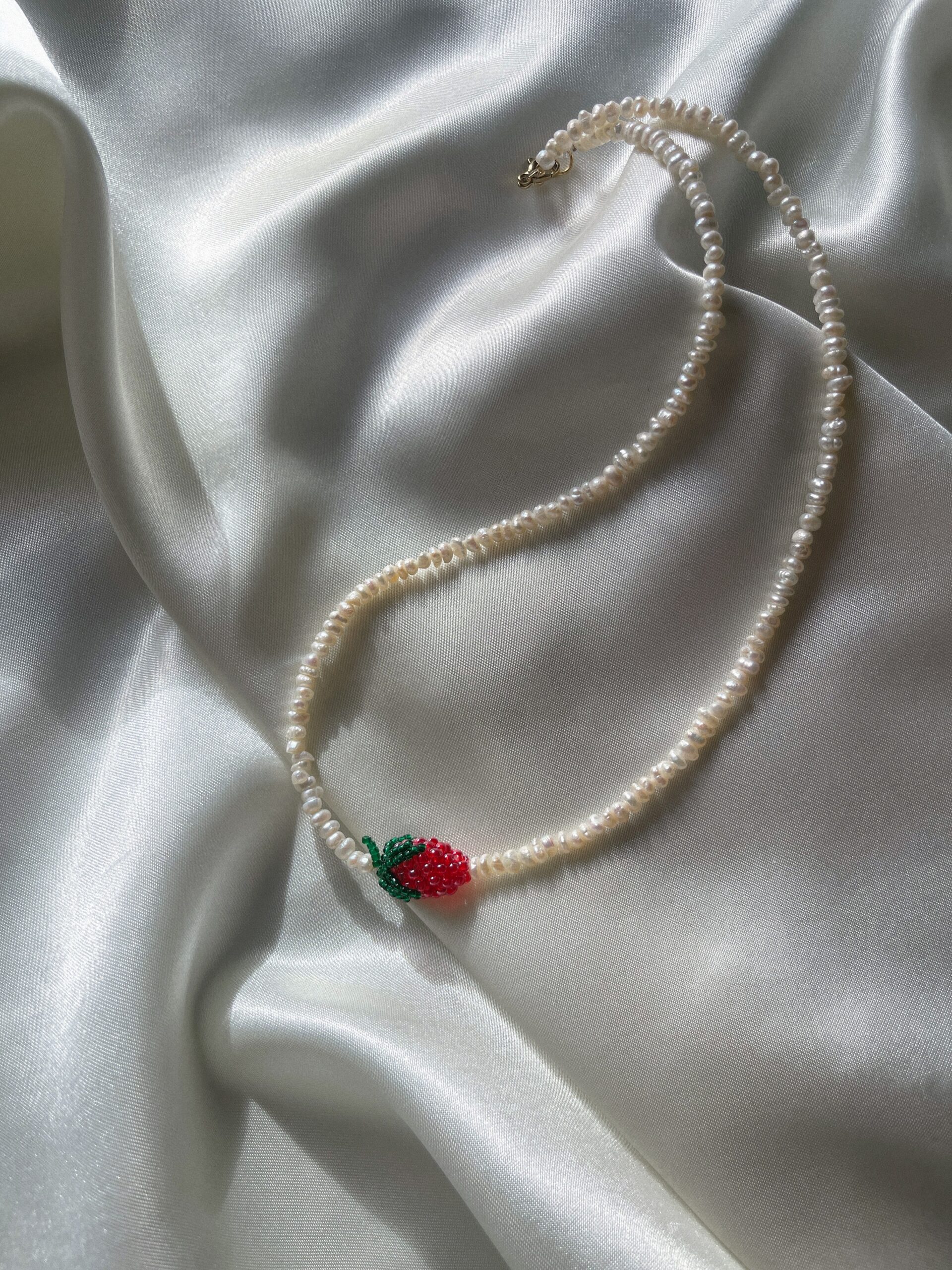 Ręcznie wykonany naszyjnik z drobnych, naturalnych pereł, ozdobiony truskawką z koralików – słodkim, letnim akcentem, który przyciąga spojrzenia, ale pozostaje delikatny i dziewczęcy. To lekka, radosna biżuteria, idealna do codziennych i wyjątkowych stylizacji.