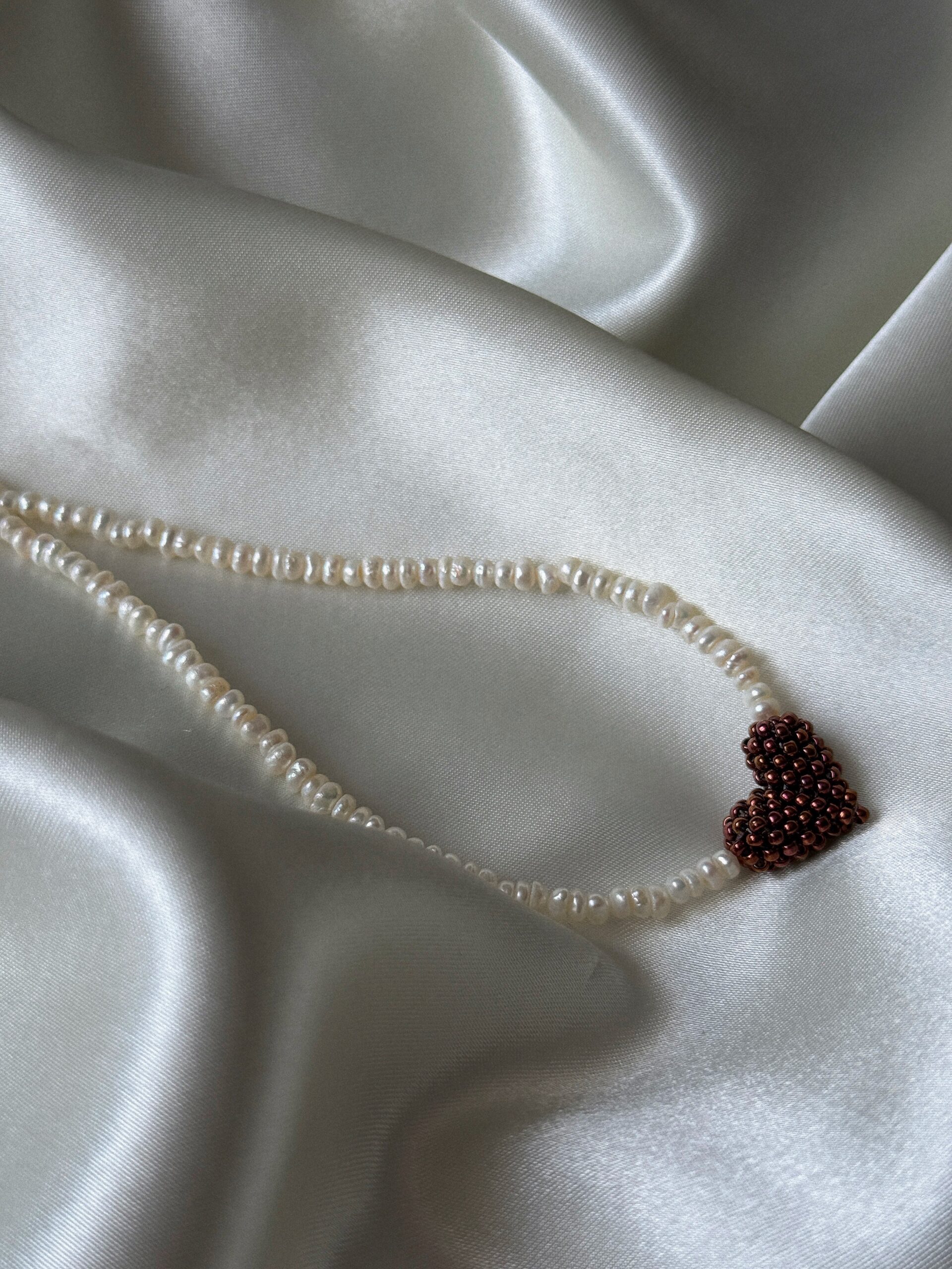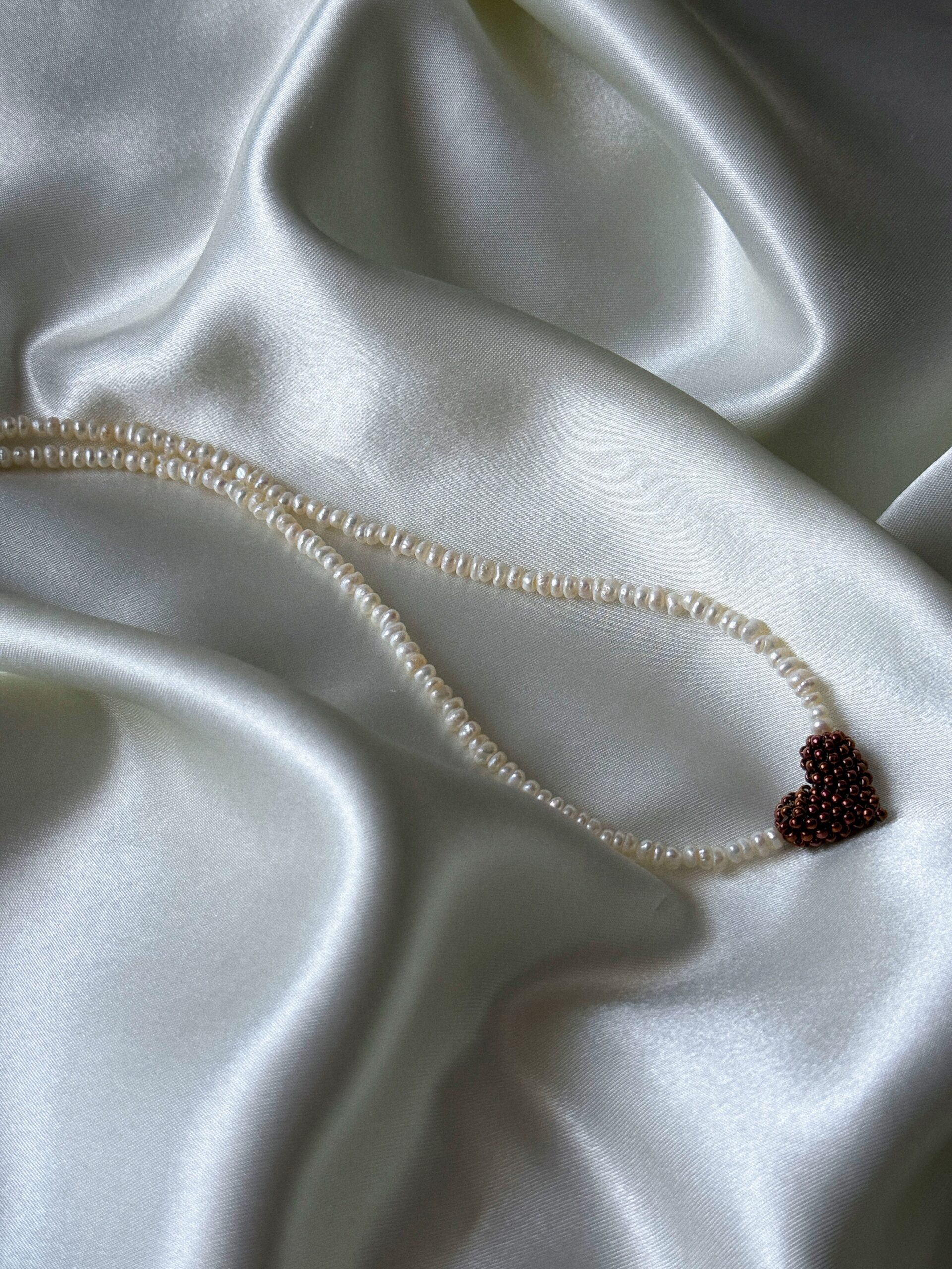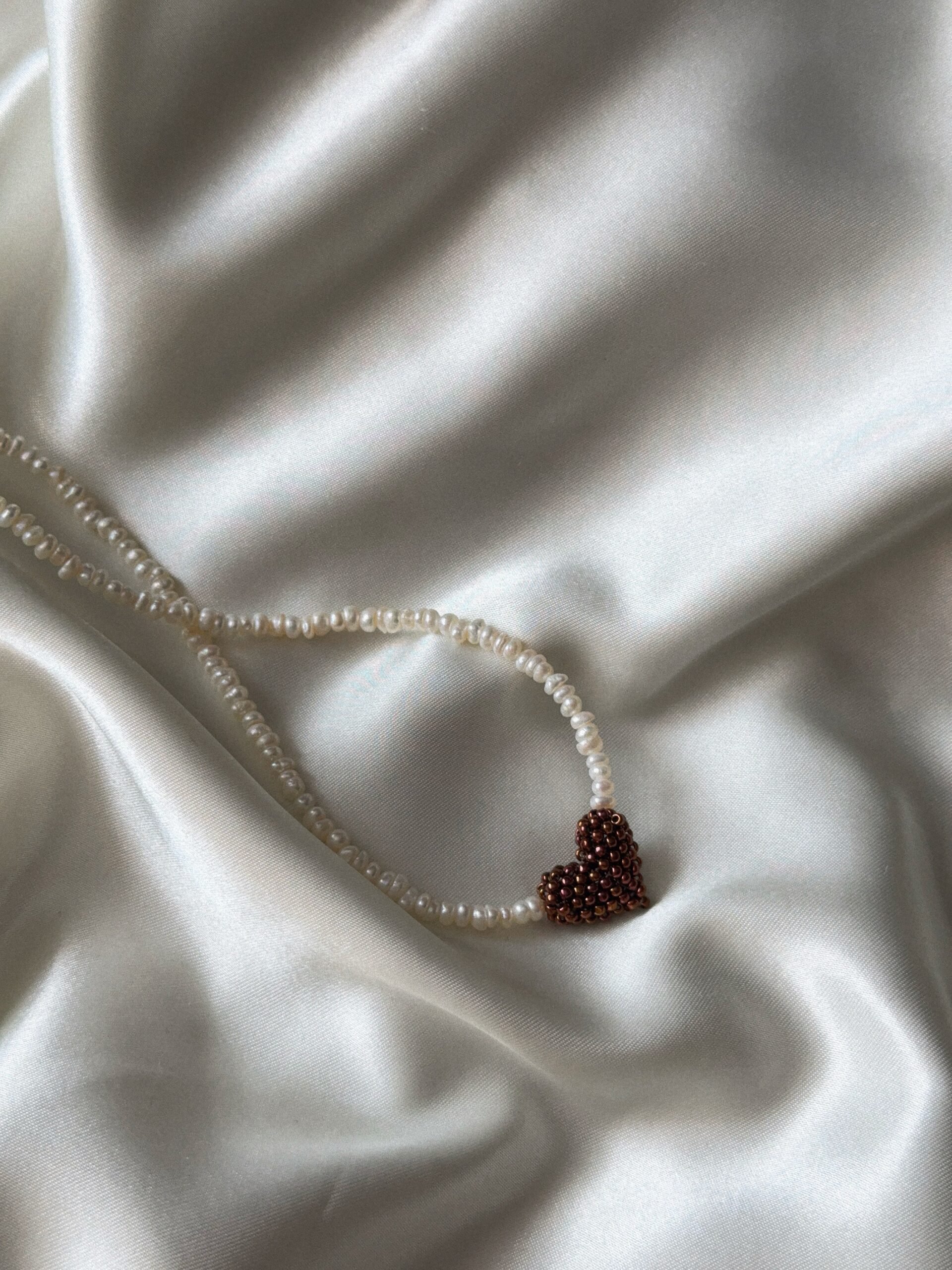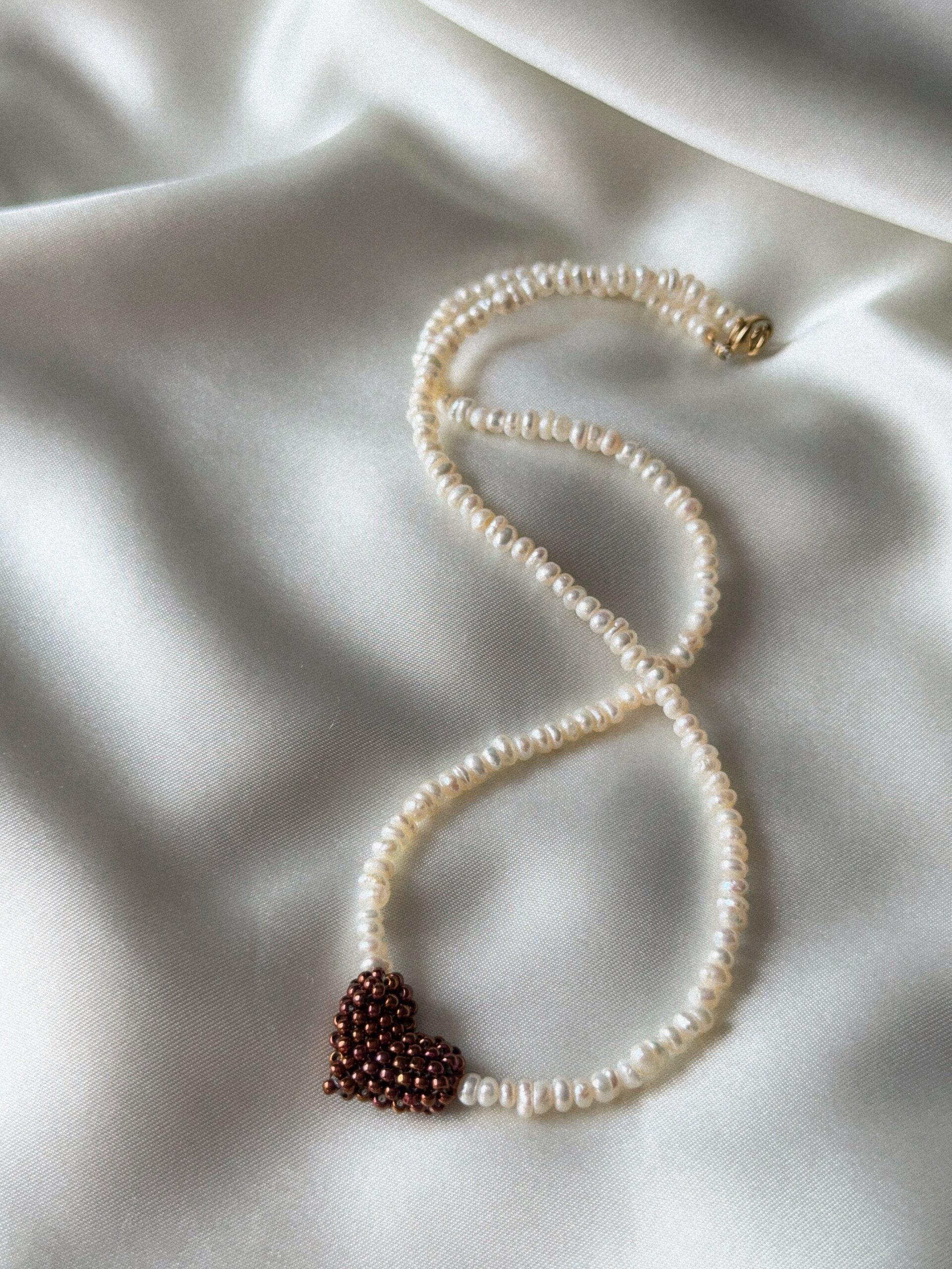 Ręcznie robiony naszyjnik z drobnych, naturalnych pereł, ozdobiony zawieszką w kształcie brązowego serca