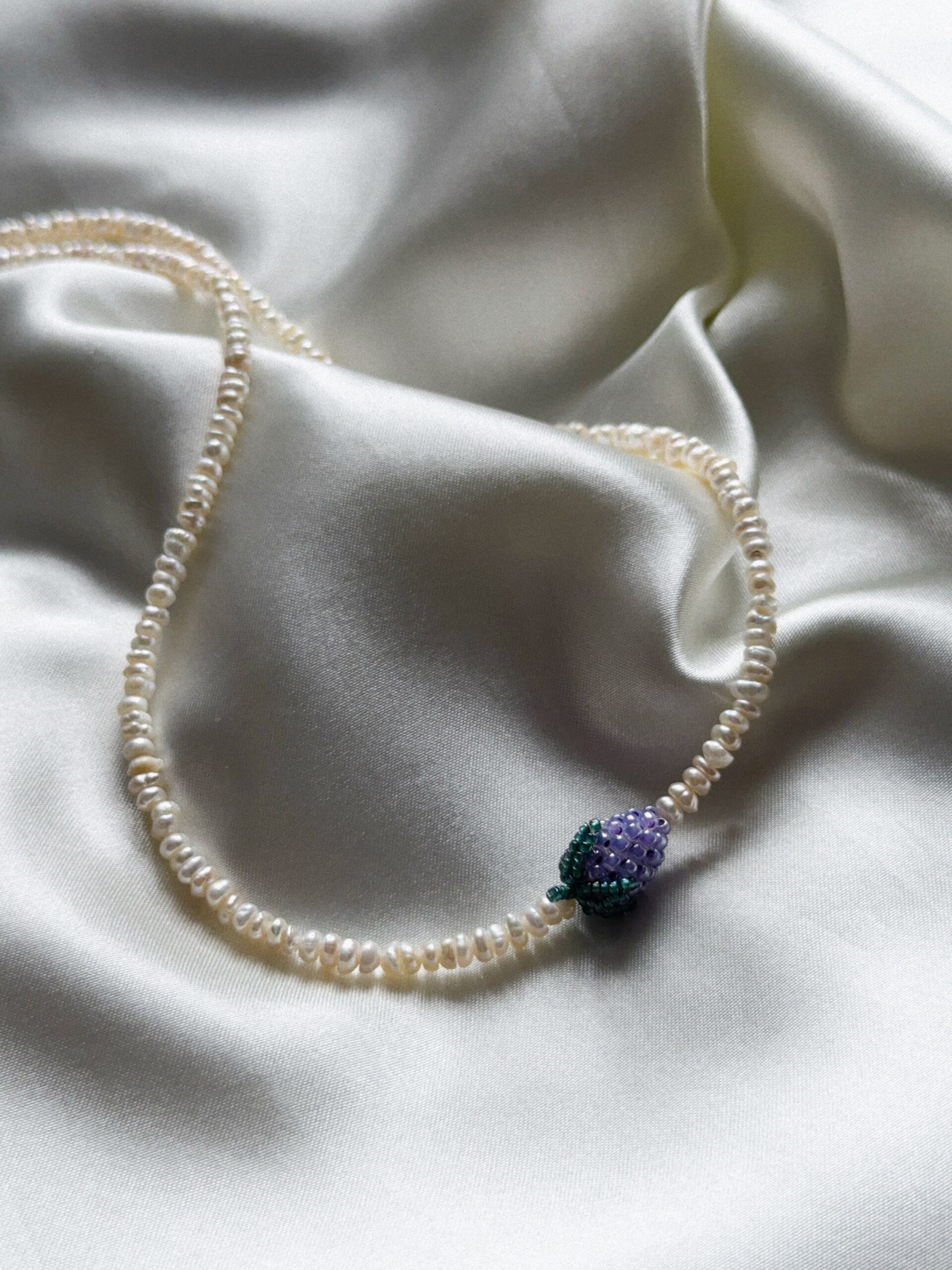 Ręcznie wykonany naszyjnik z drobnych, naturalnych pereł, ozdobiony jasną jeżyną z koralików – subtelnym, letnim akcentem o lekkim, owocowym charakterze. To propozycja dla osób, które cenią sobie delikatność z nutą oryginalności.