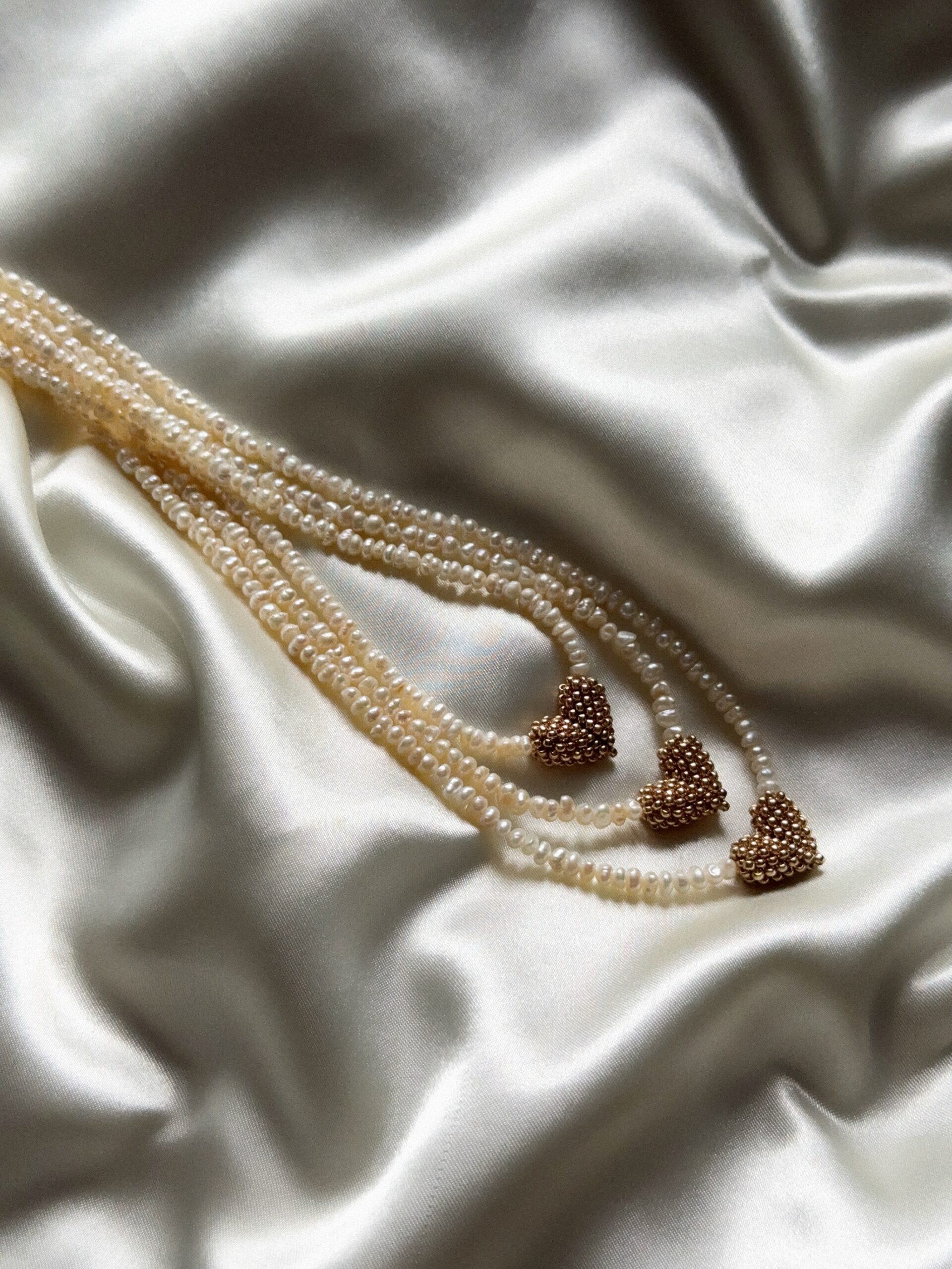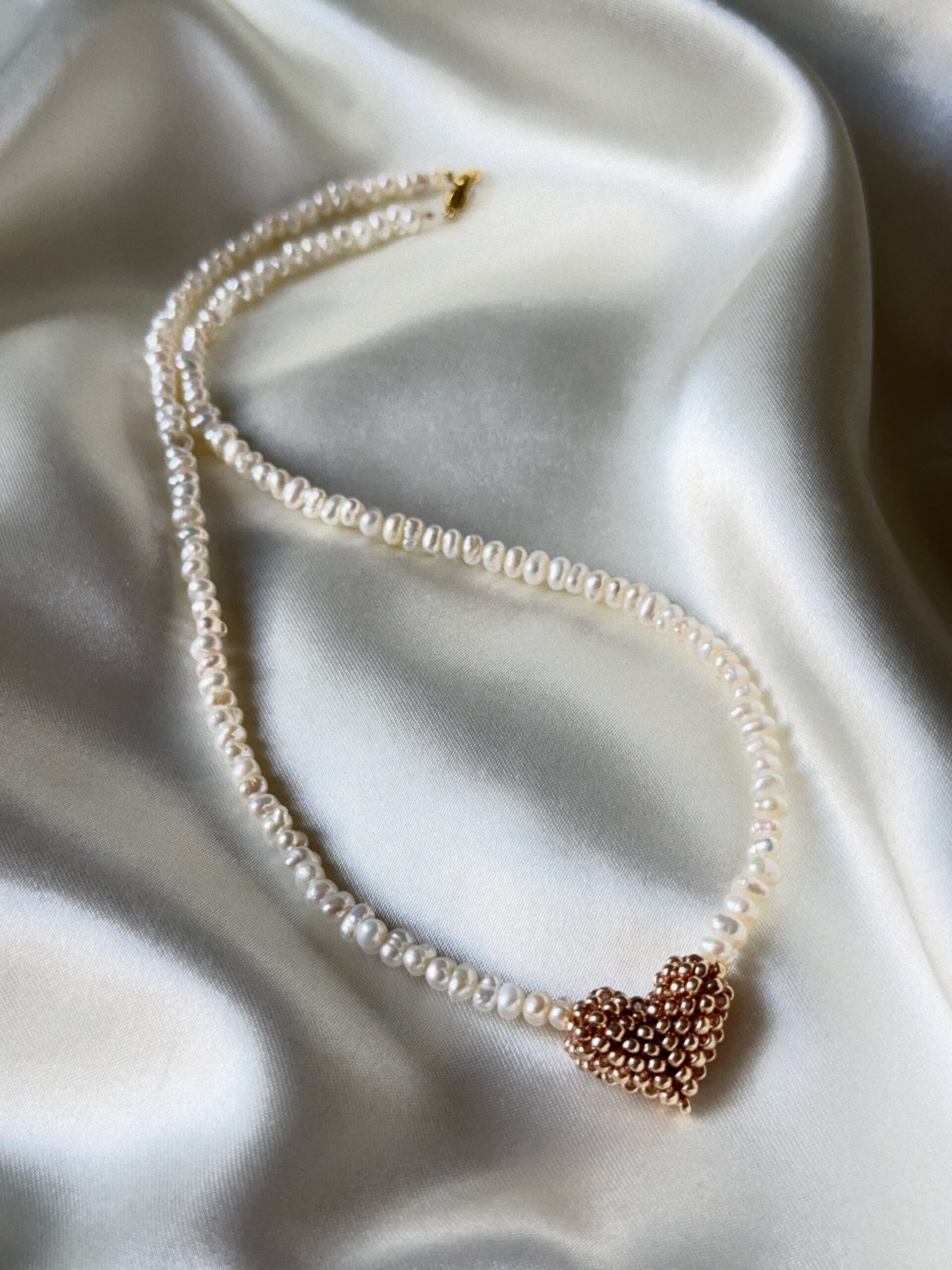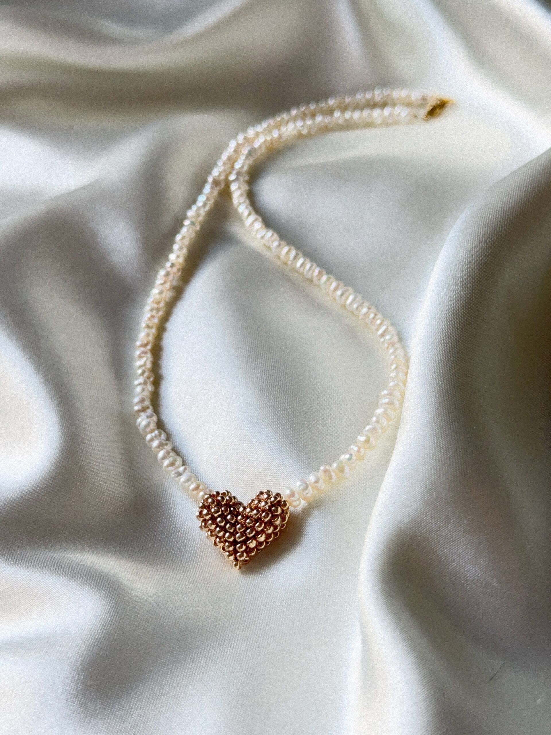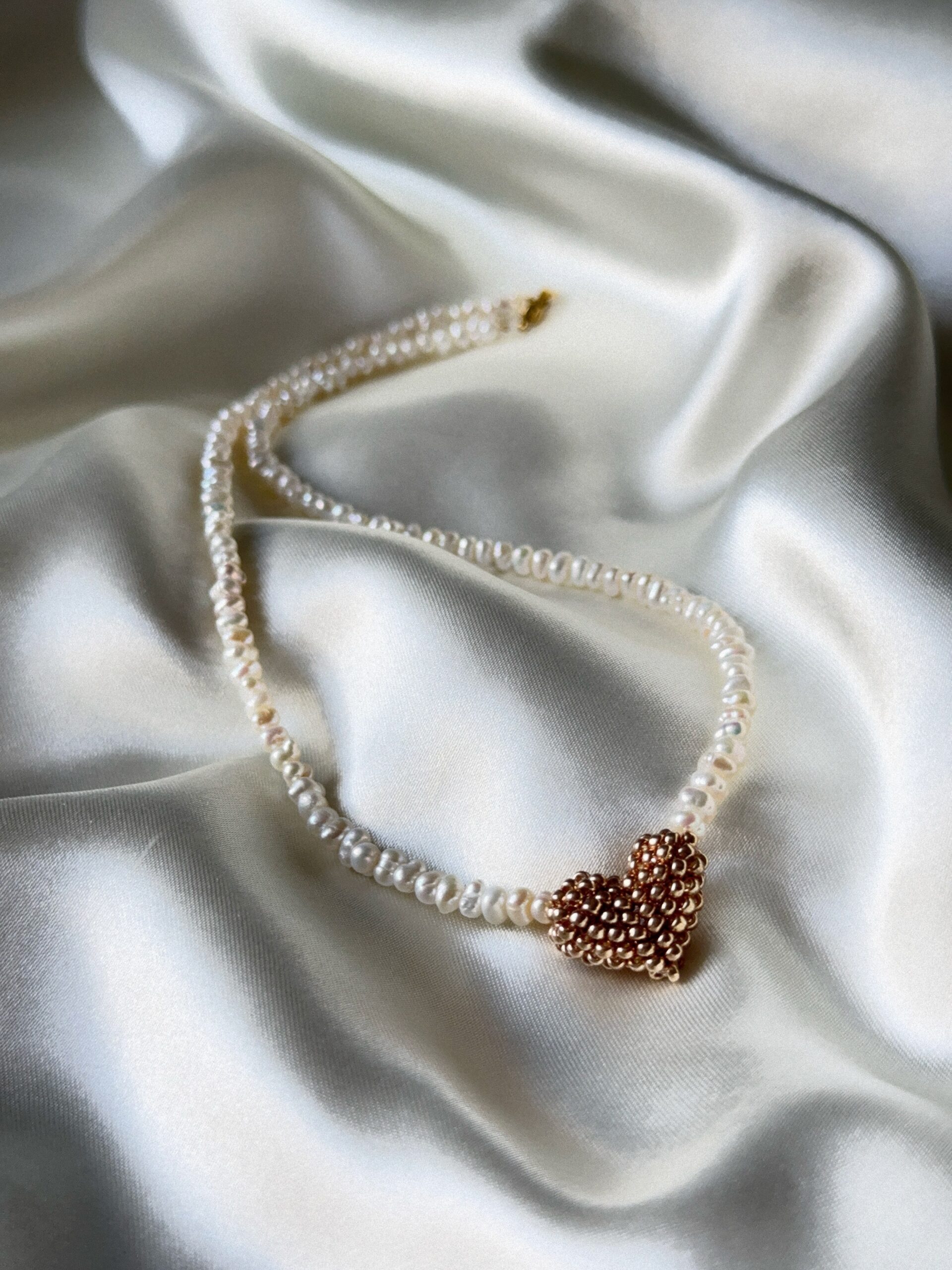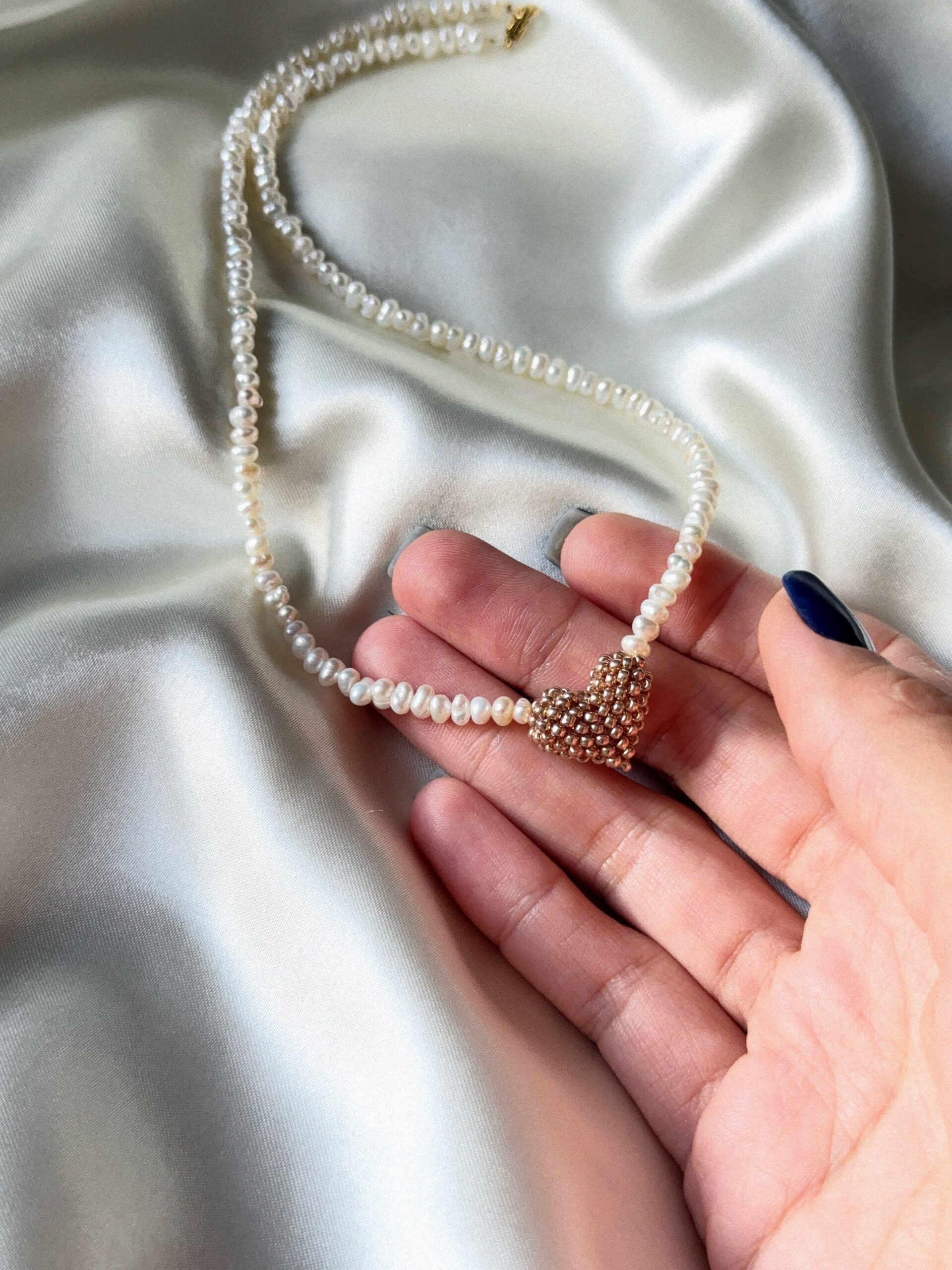 Ręcznie robiony naszyjnik z drobnych, naturalnych pereł, ozdobiony zawieszką w kształcie złotego serca.