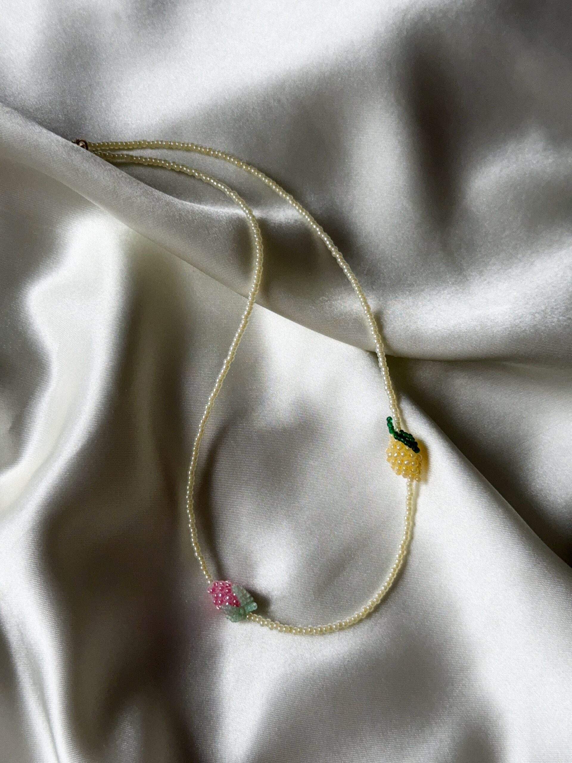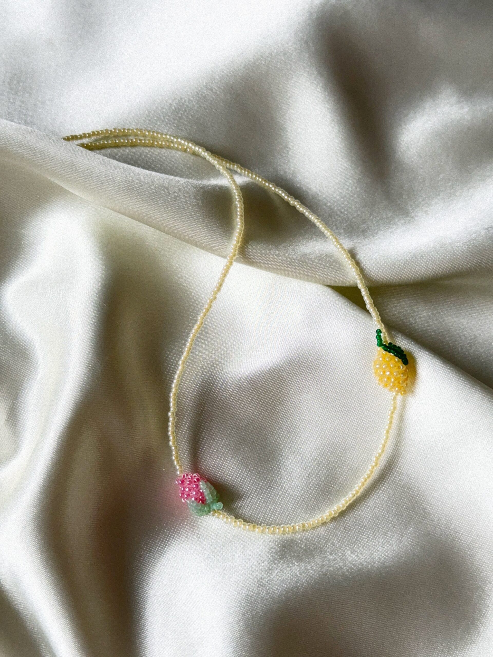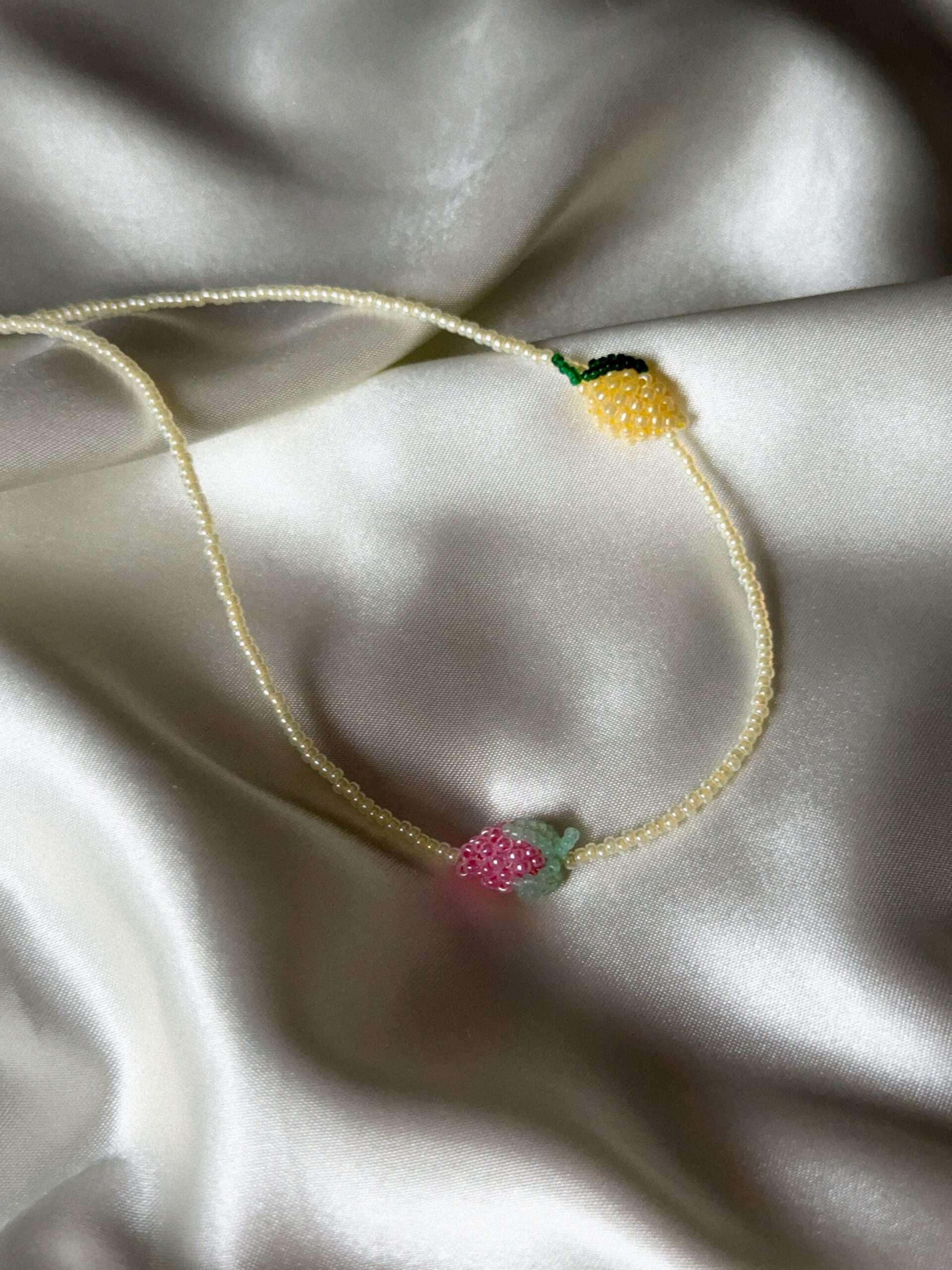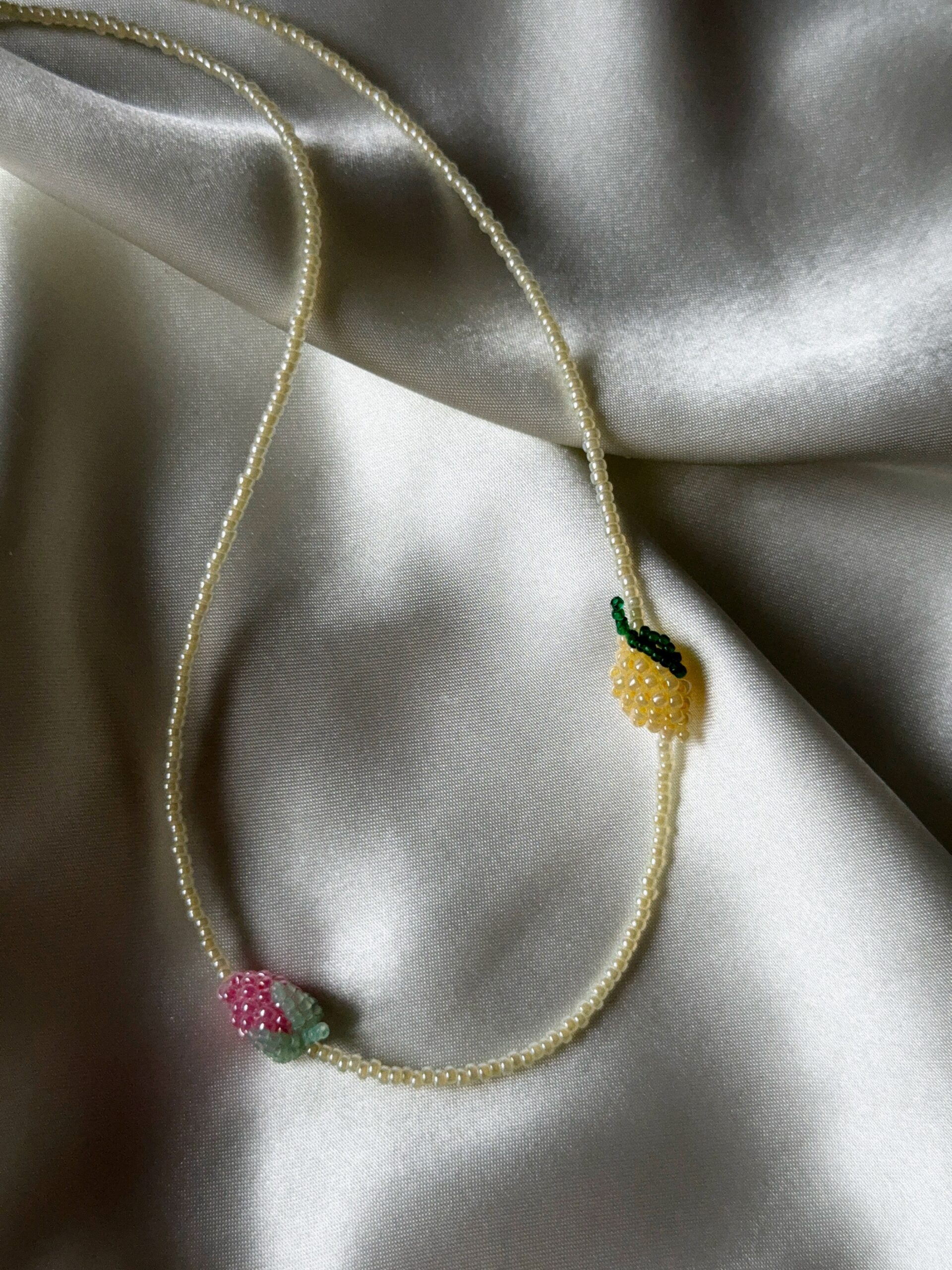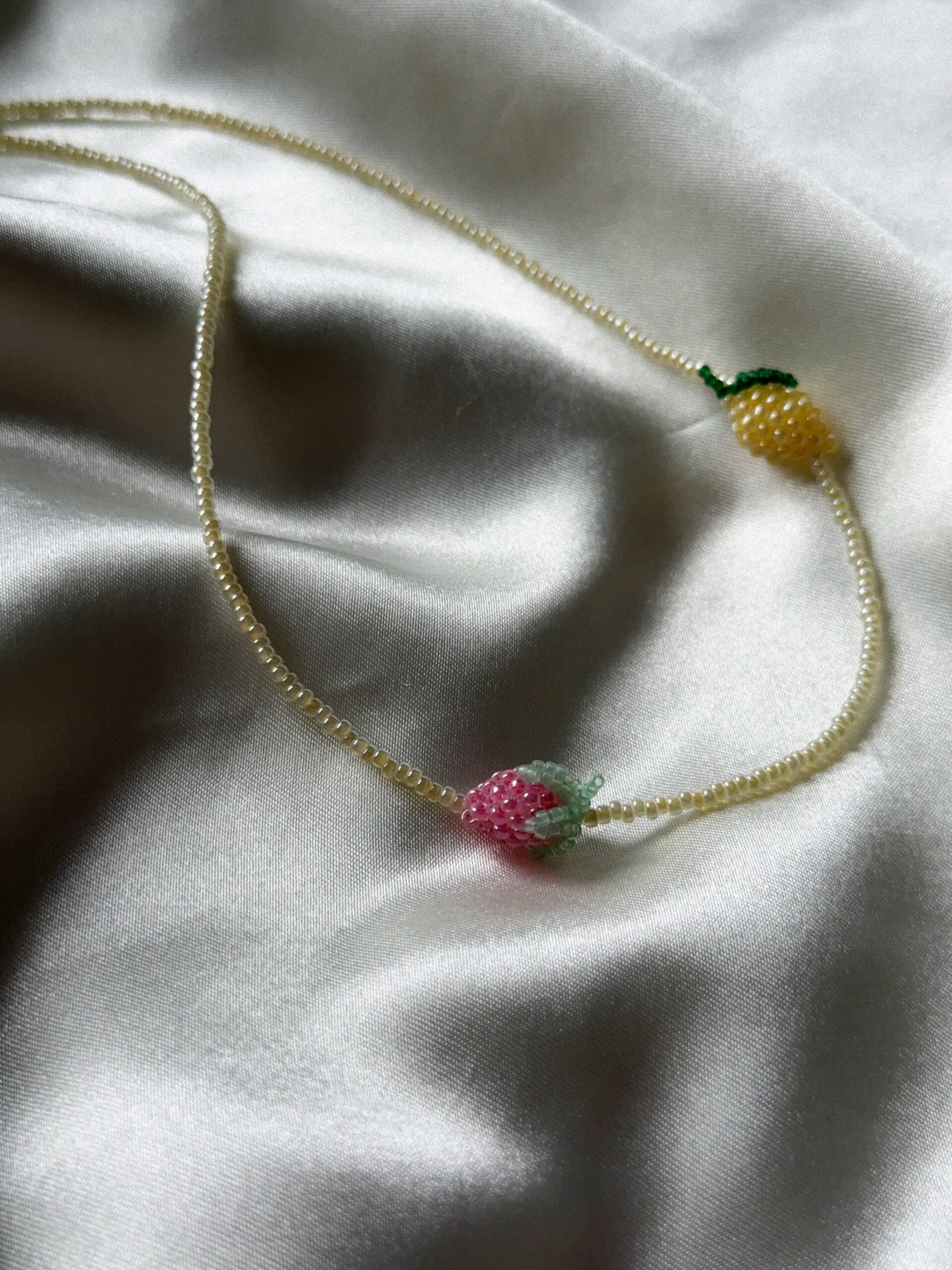 Ręcznie robiony naszyjnik z drobnych koralików, ozdobiony dwoma owocami – różową maliną i cytrynką, wykonanymi ręcznie z maleńkich koralików.