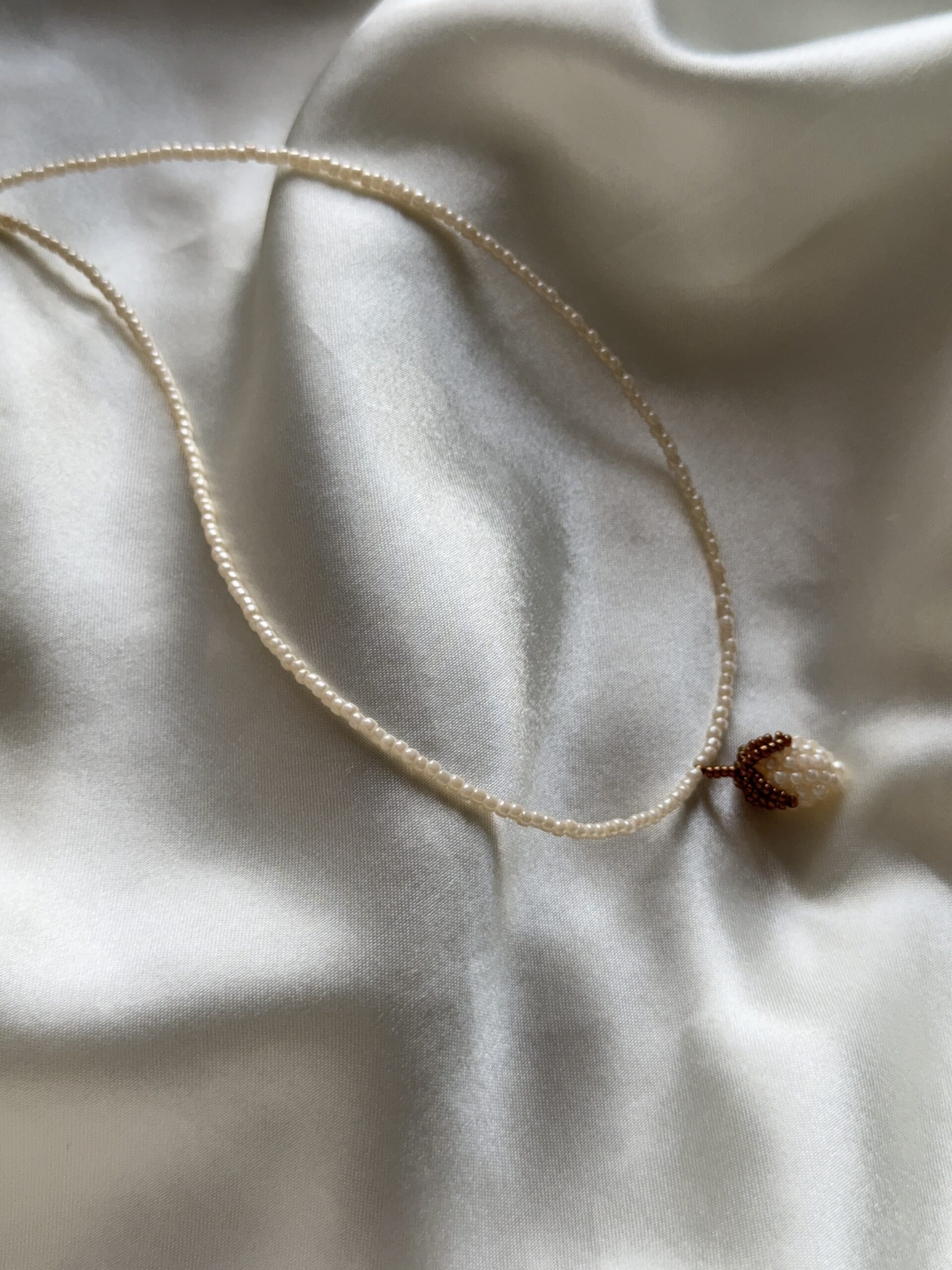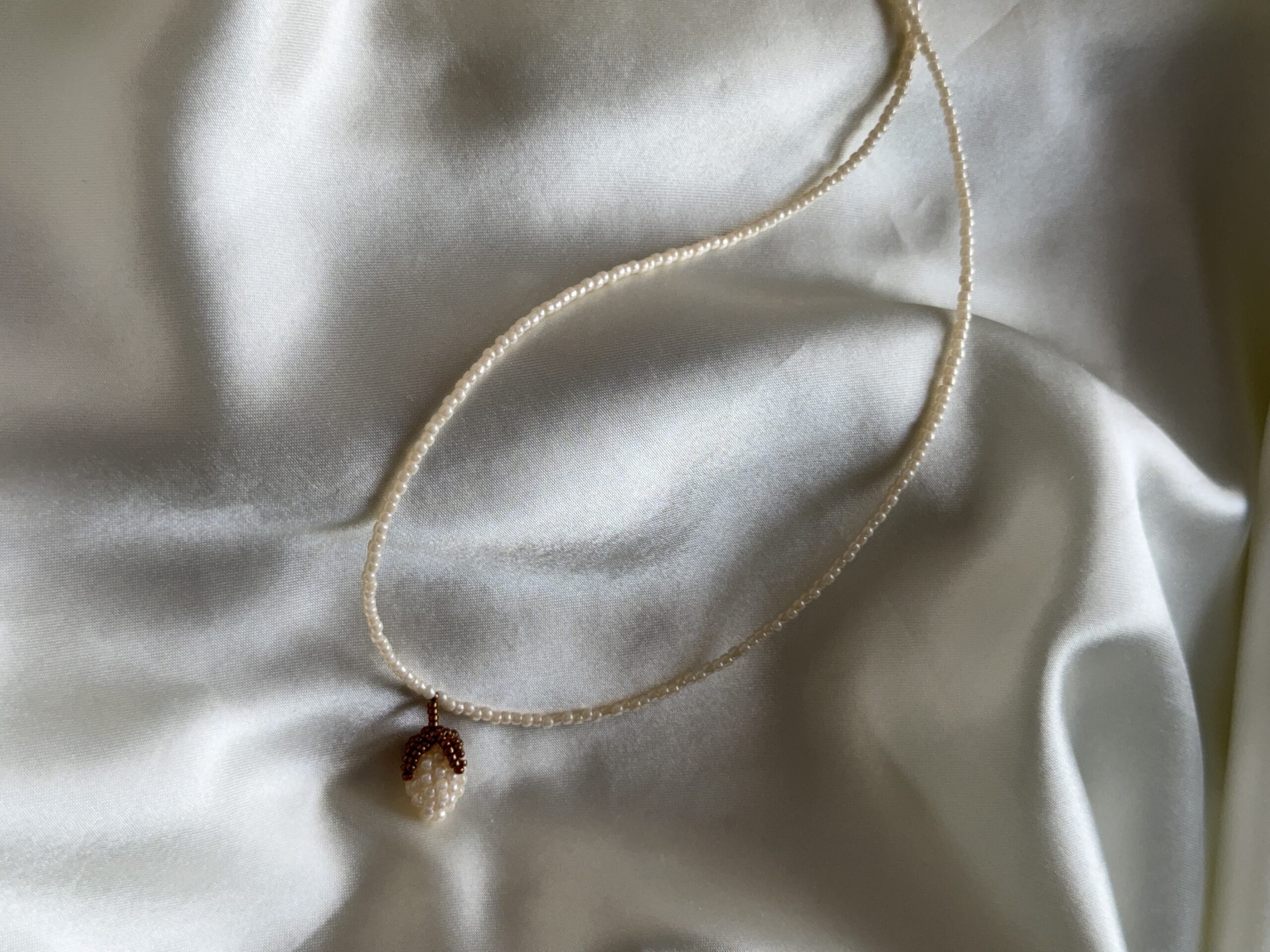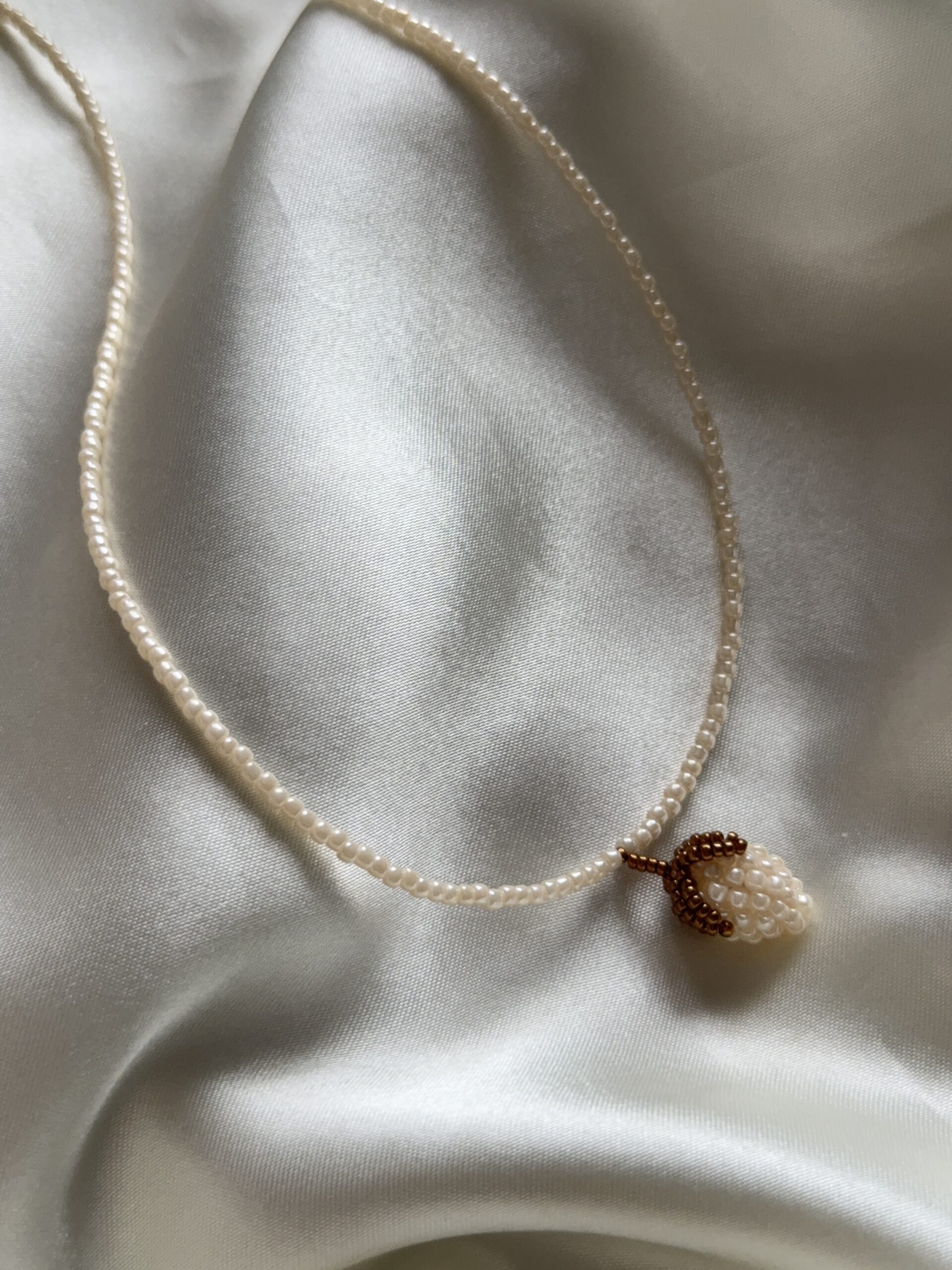 Ręcznie robiony naszyjnik z drobnych koralików, ozdobiony subtelną zawieszką w formie delikatnego, perłowego owocu w jasnobeżowym, waniliowym odcieniu. Całość tworzy lekką, harmonijną kompozycję inspirowaną naturą — ciepłą, spokojną i bardzo kobiecą.