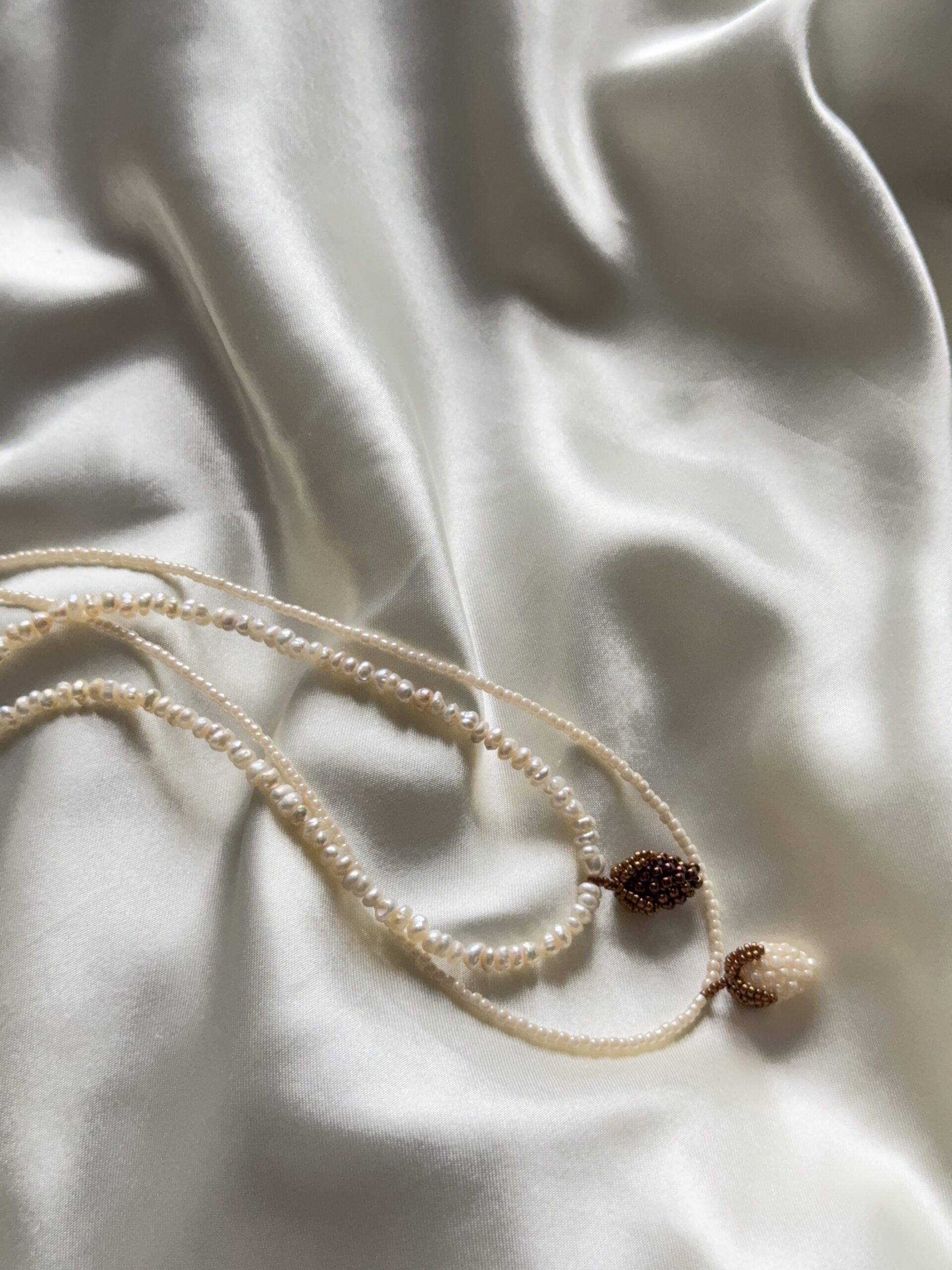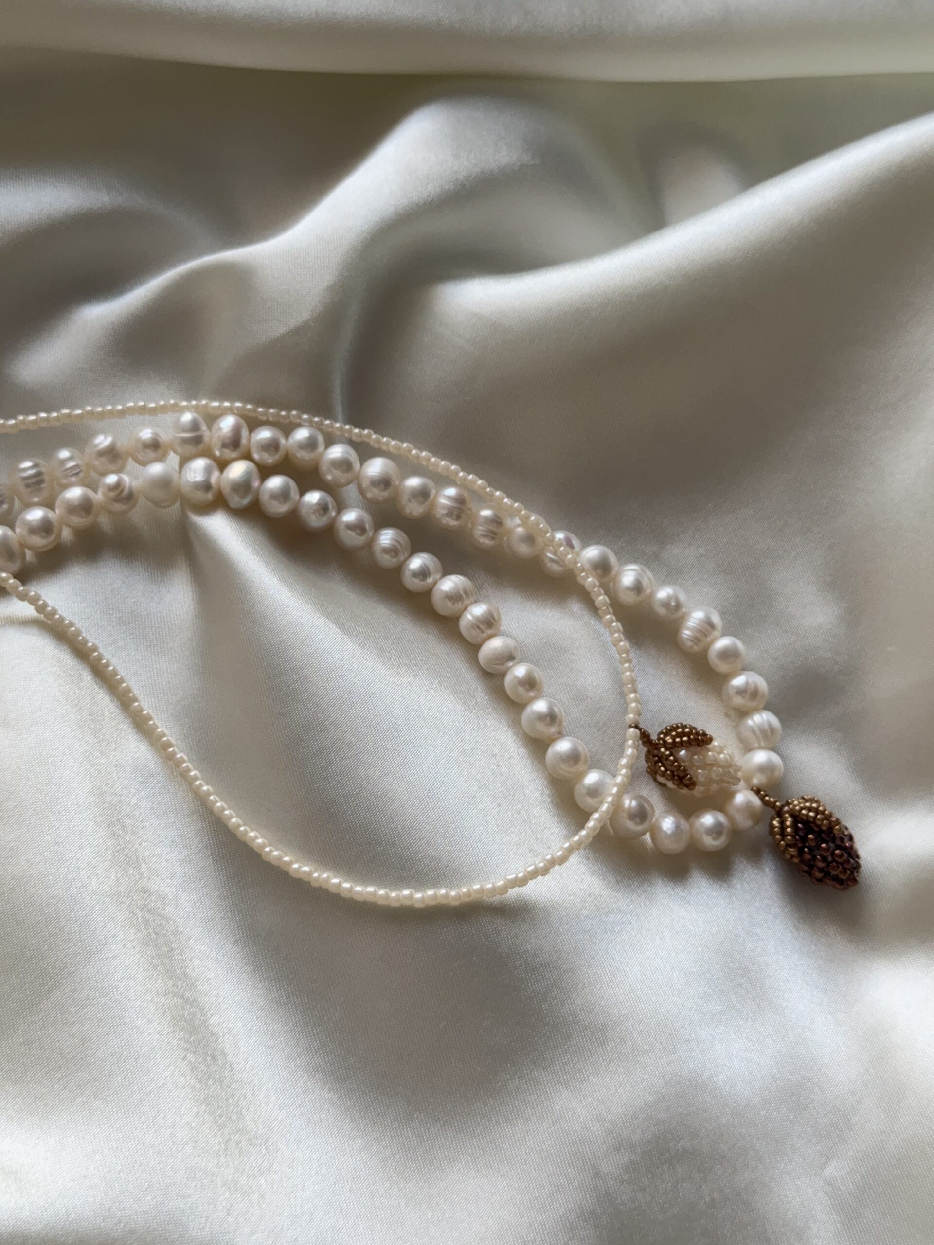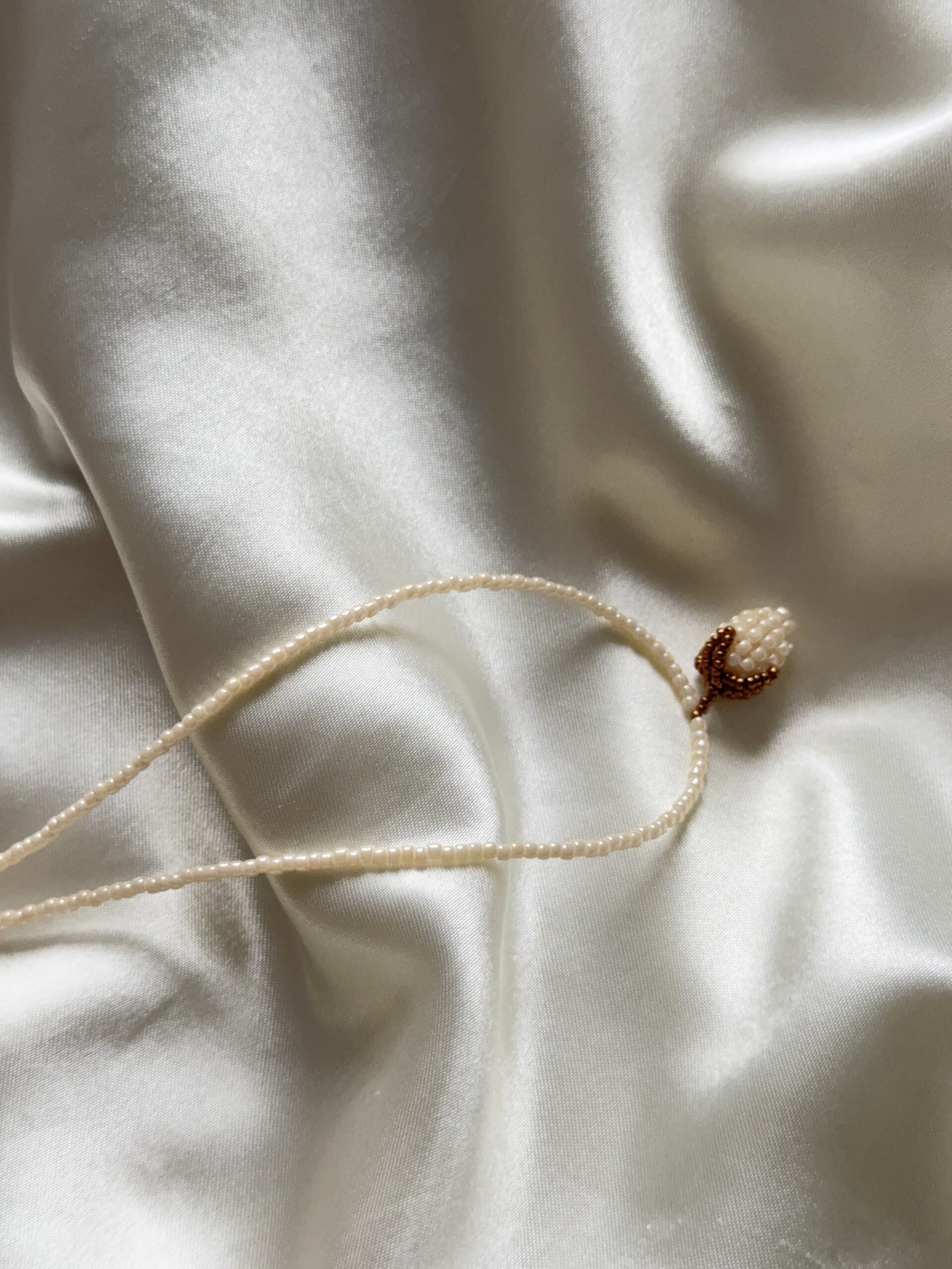 Ręcznie robiony naszyjnik z drobnych koralików, ozdobiony subtelną zawieszką w formie delikatnego, perłowego owocu w jasnobeżowym, waniliowym odcieniu. Całość tworzy lekką, harmonijną kompozycję inspirowaną naturą — ciepłą, spokojną i bardzo kobiecą.