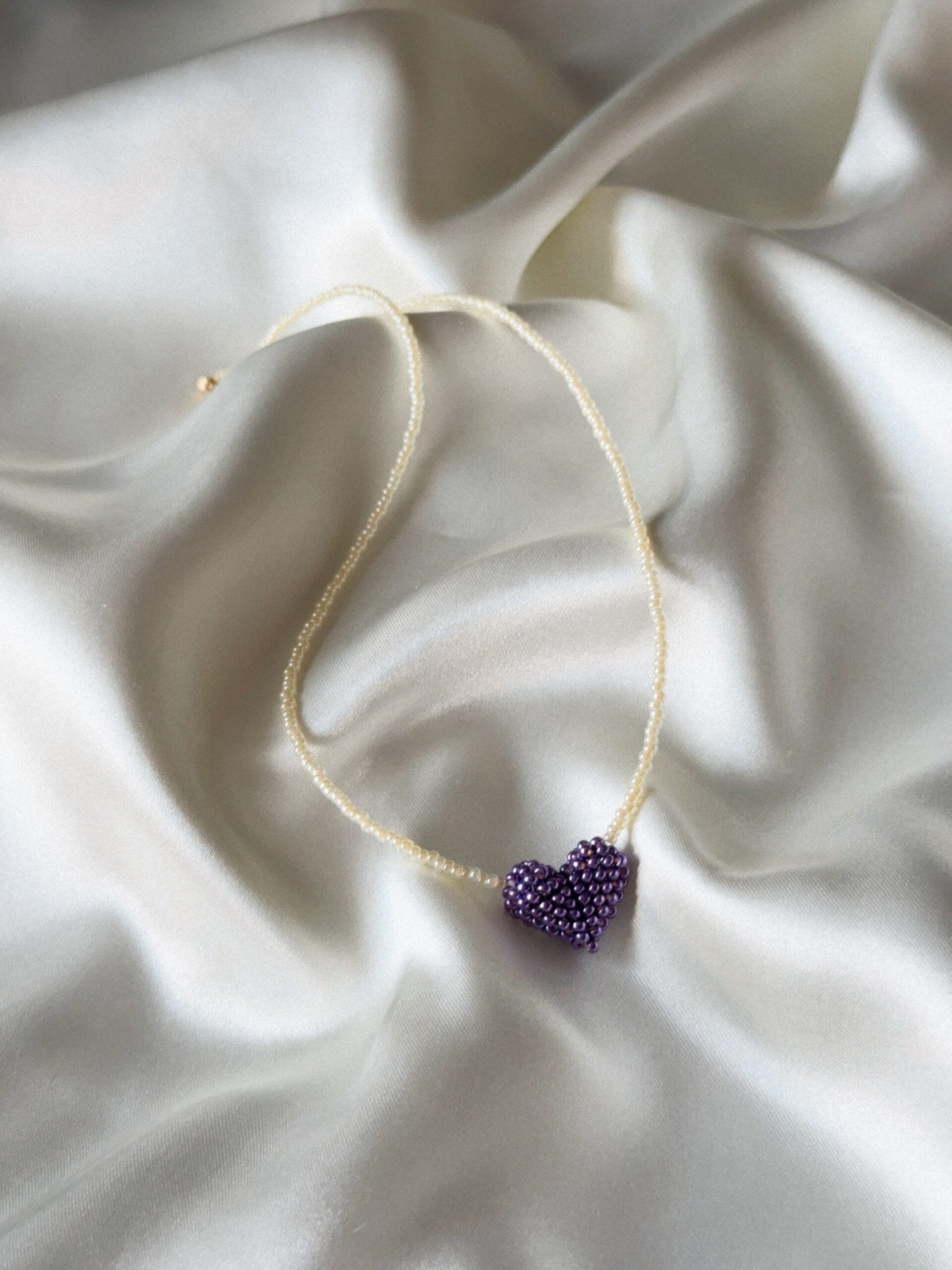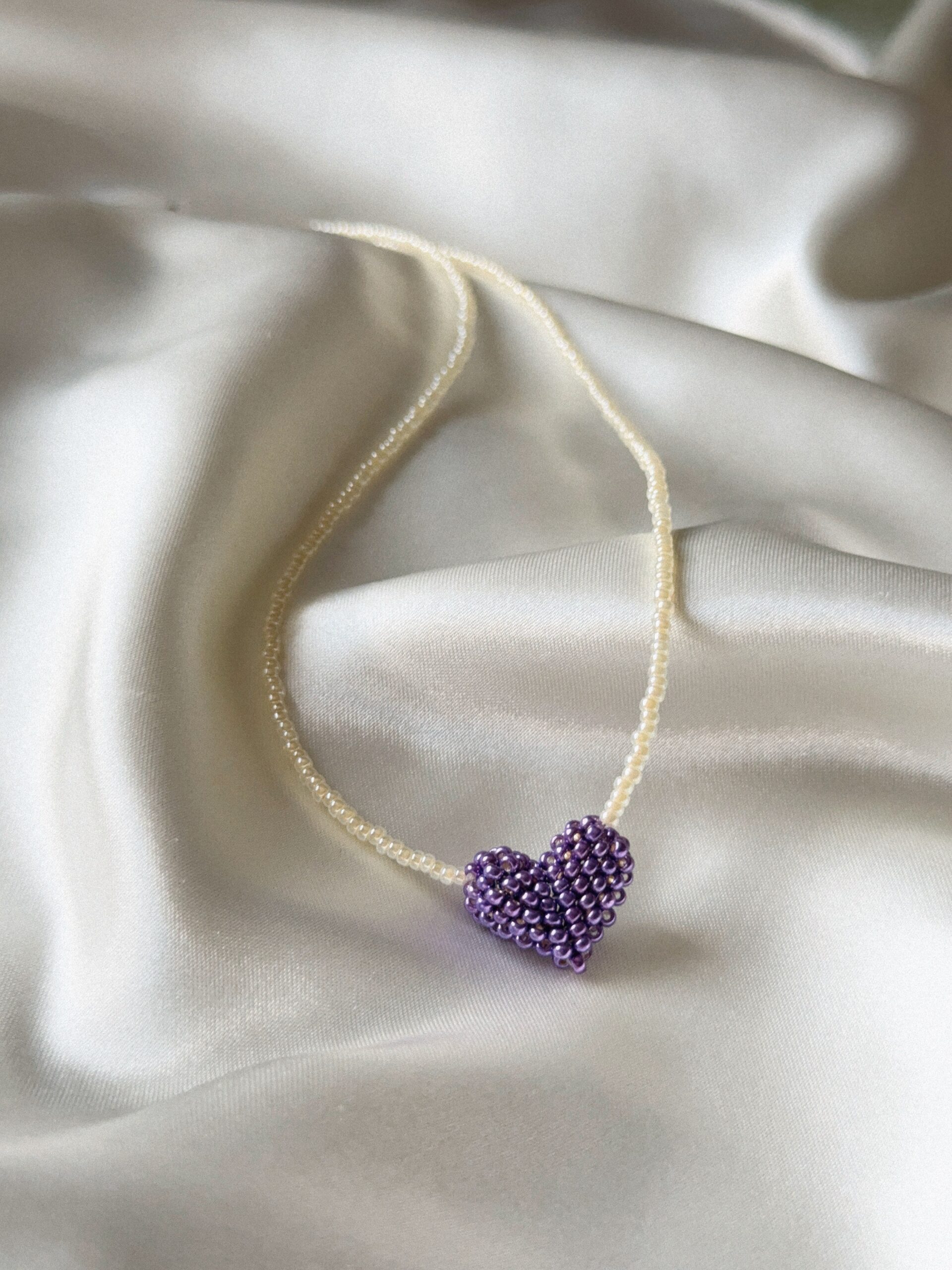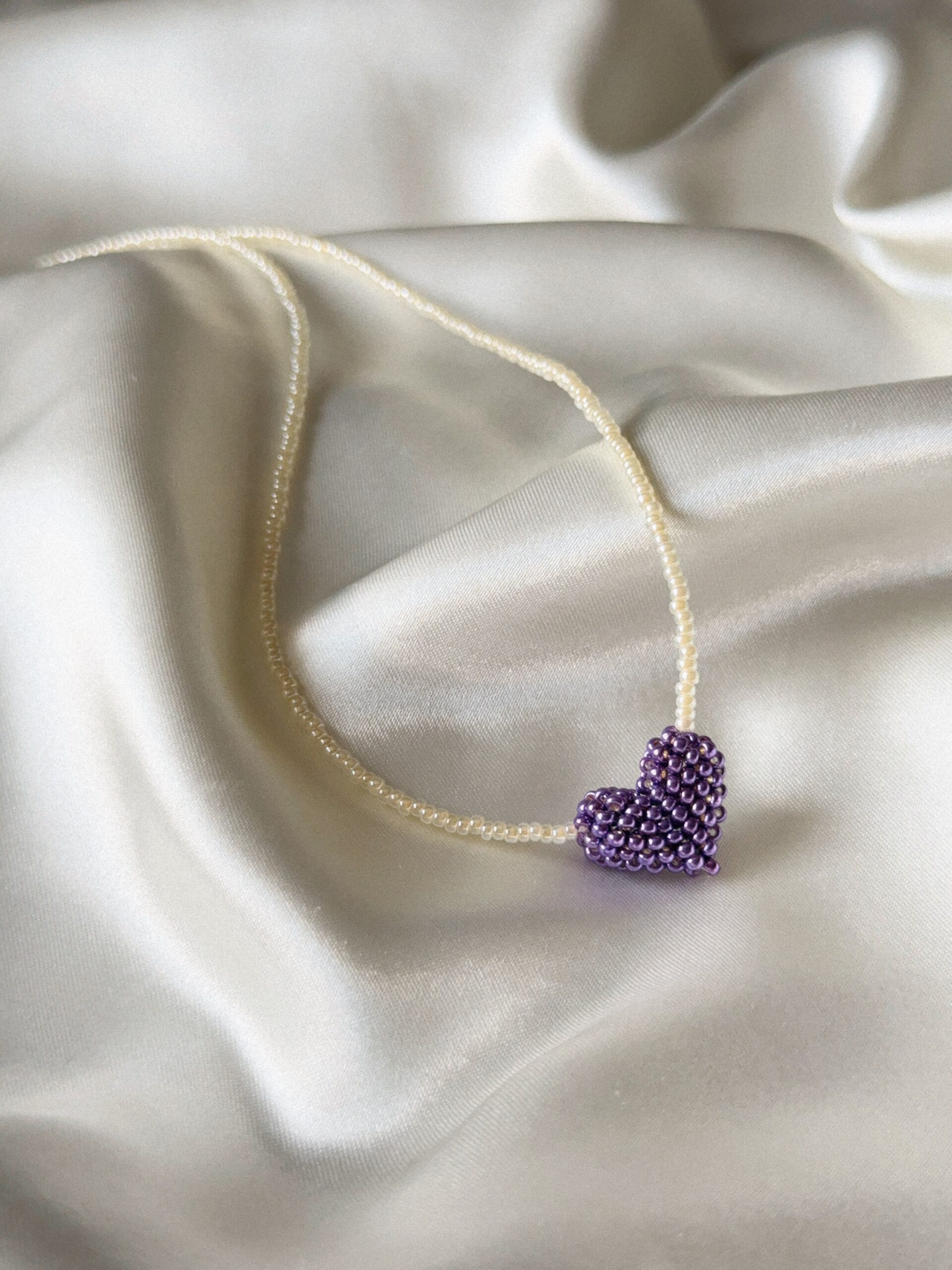Delikatny, ręcznie robiony naszyjnik wykonany z drobnych koralików, ozdobiony serduszkiem uplecionym z koralików w metalicznie fioletowym odcieniu.