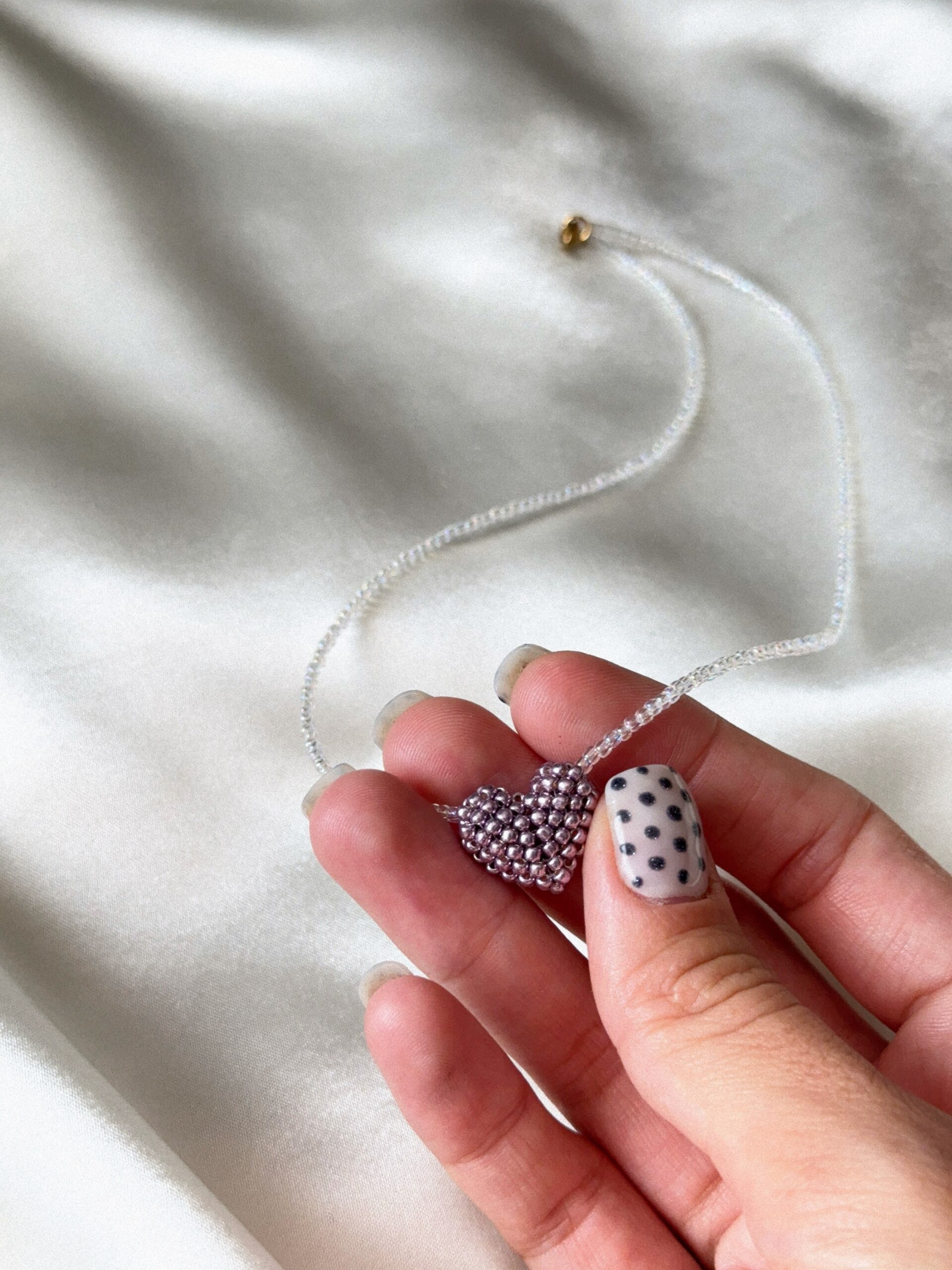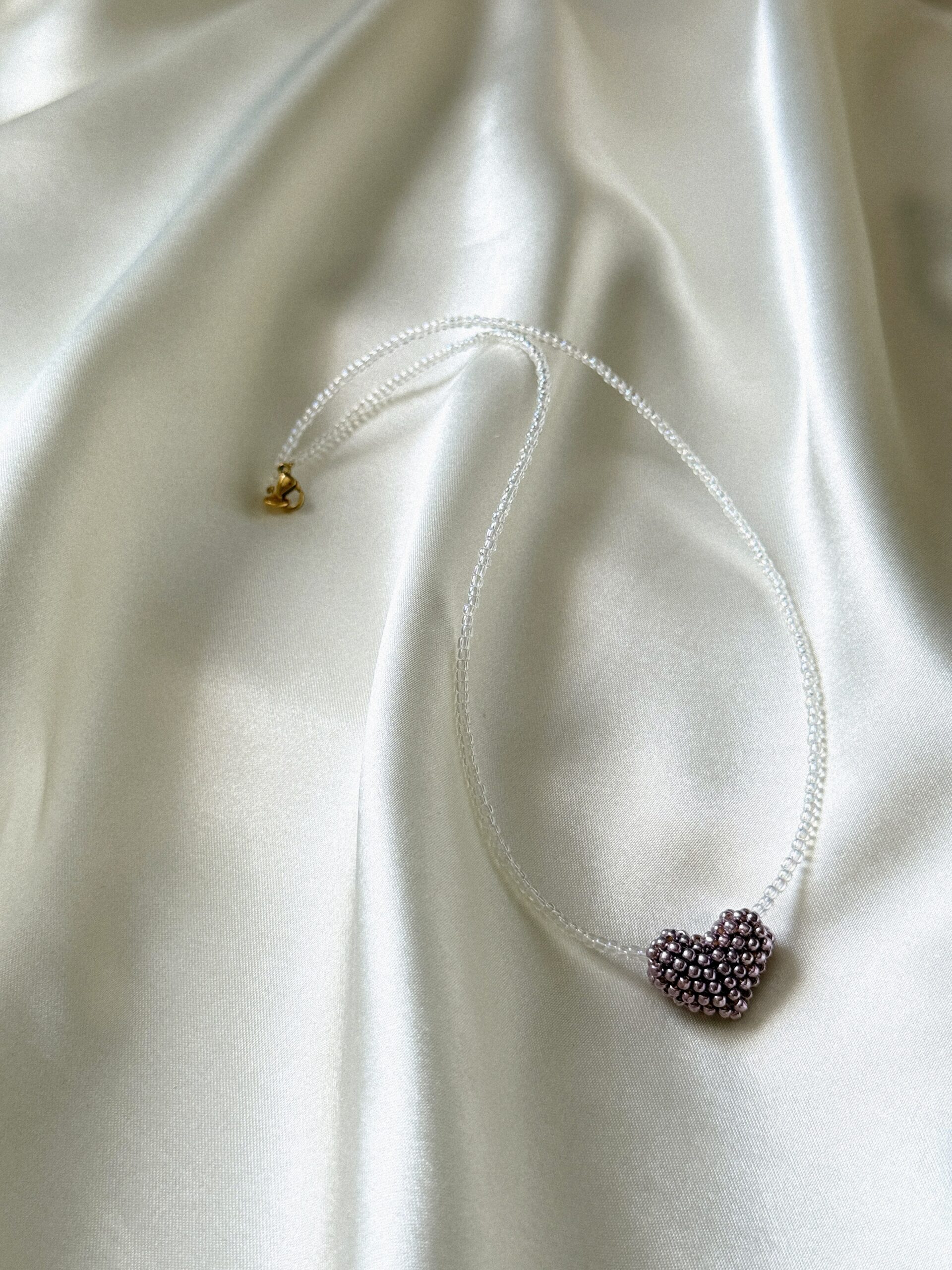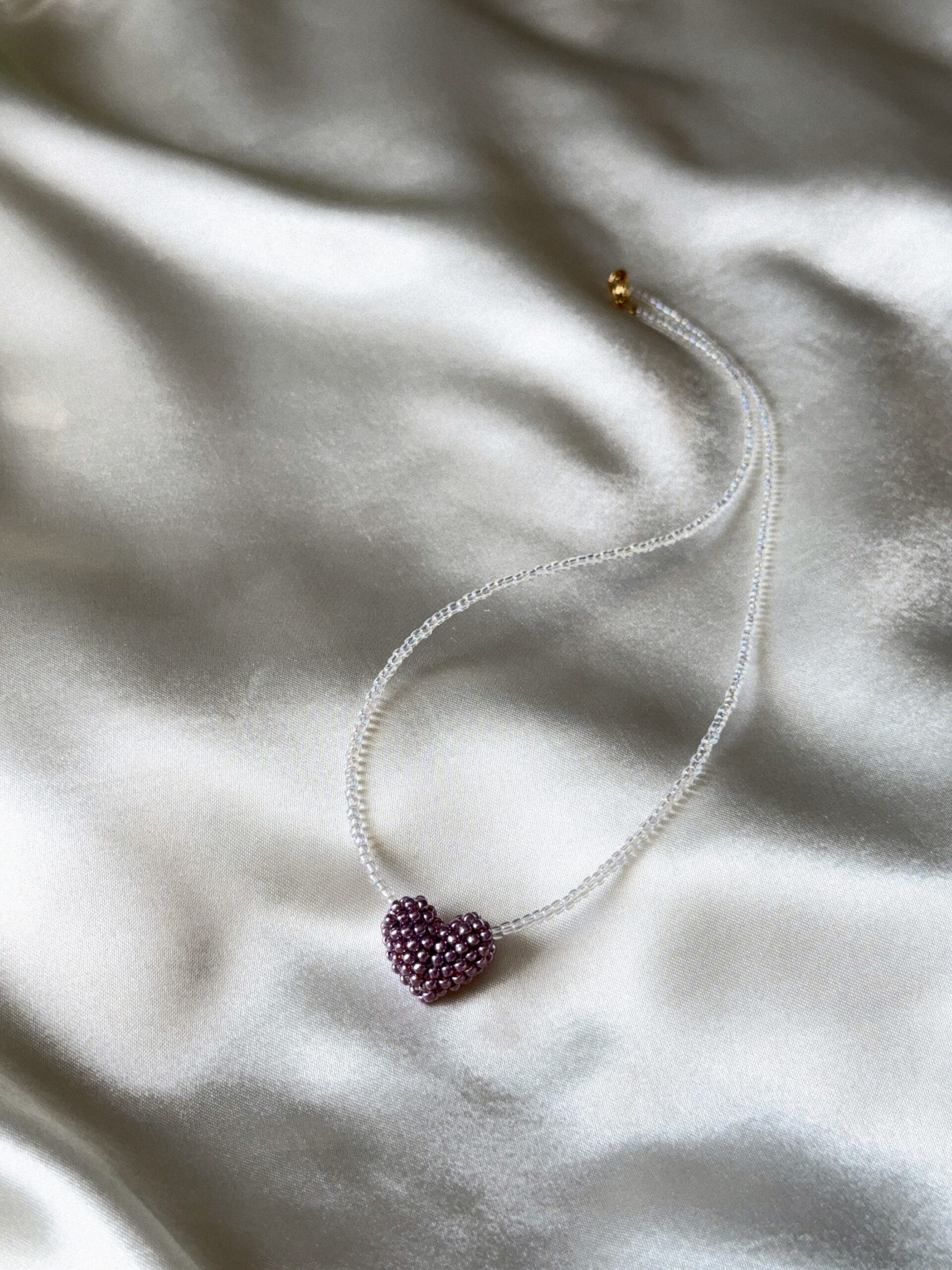 Delikatny, ręcznie robiony naszyjnik wykonany z drobnych koralików, ozdobiony serduszkiem uplecionym z koralików w subtelnym, metalicznym odcieniu fioletu.