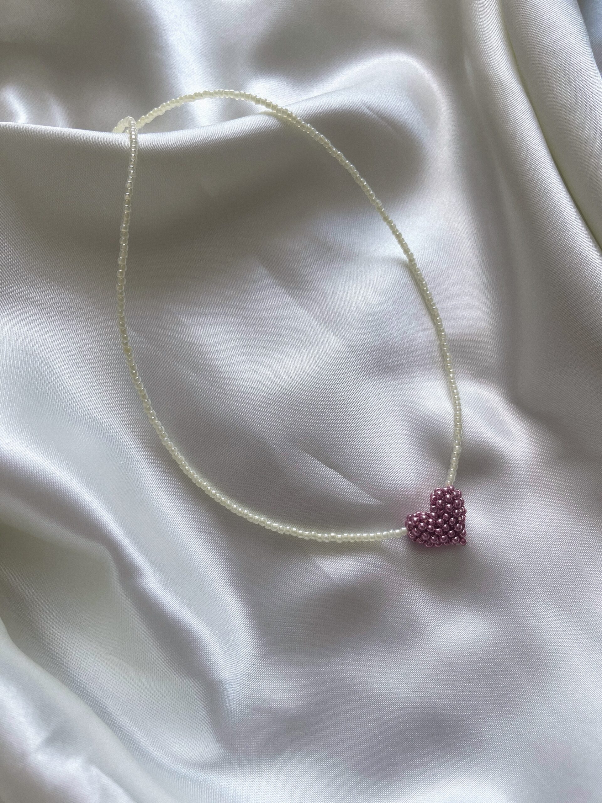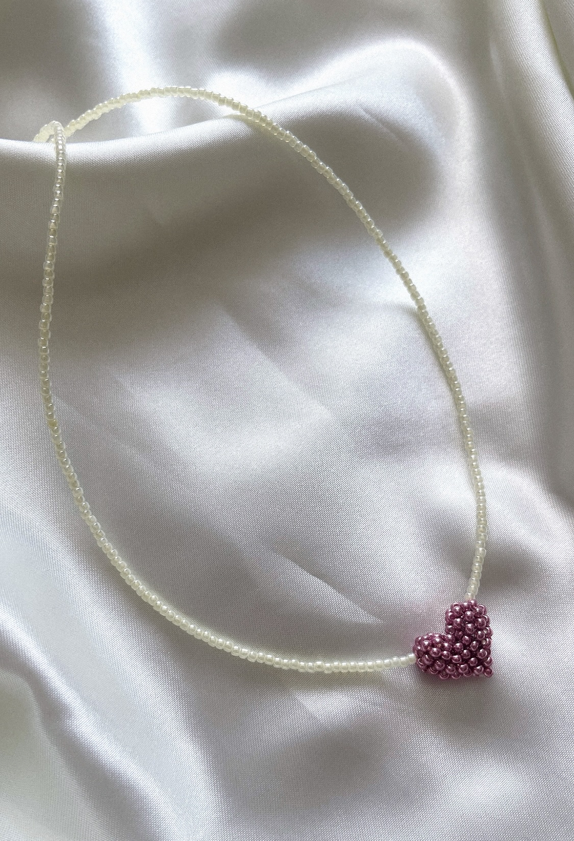 Delikatny, ręcznie robiony naszyjnik wykonany z drobnych koralików, ozdobiony serduszkiem uplecionym z koralików w metalicznym różowym odcieniu.