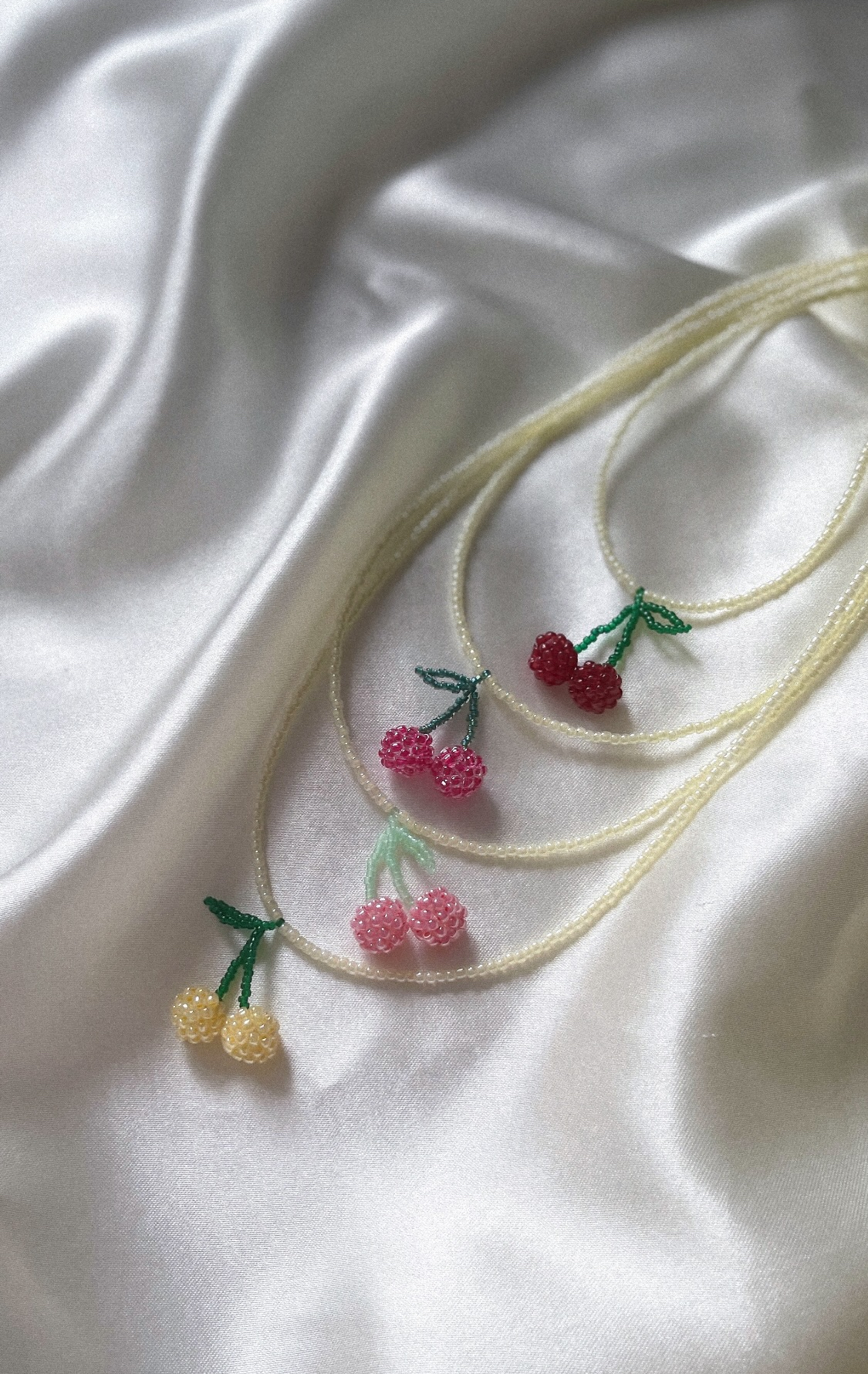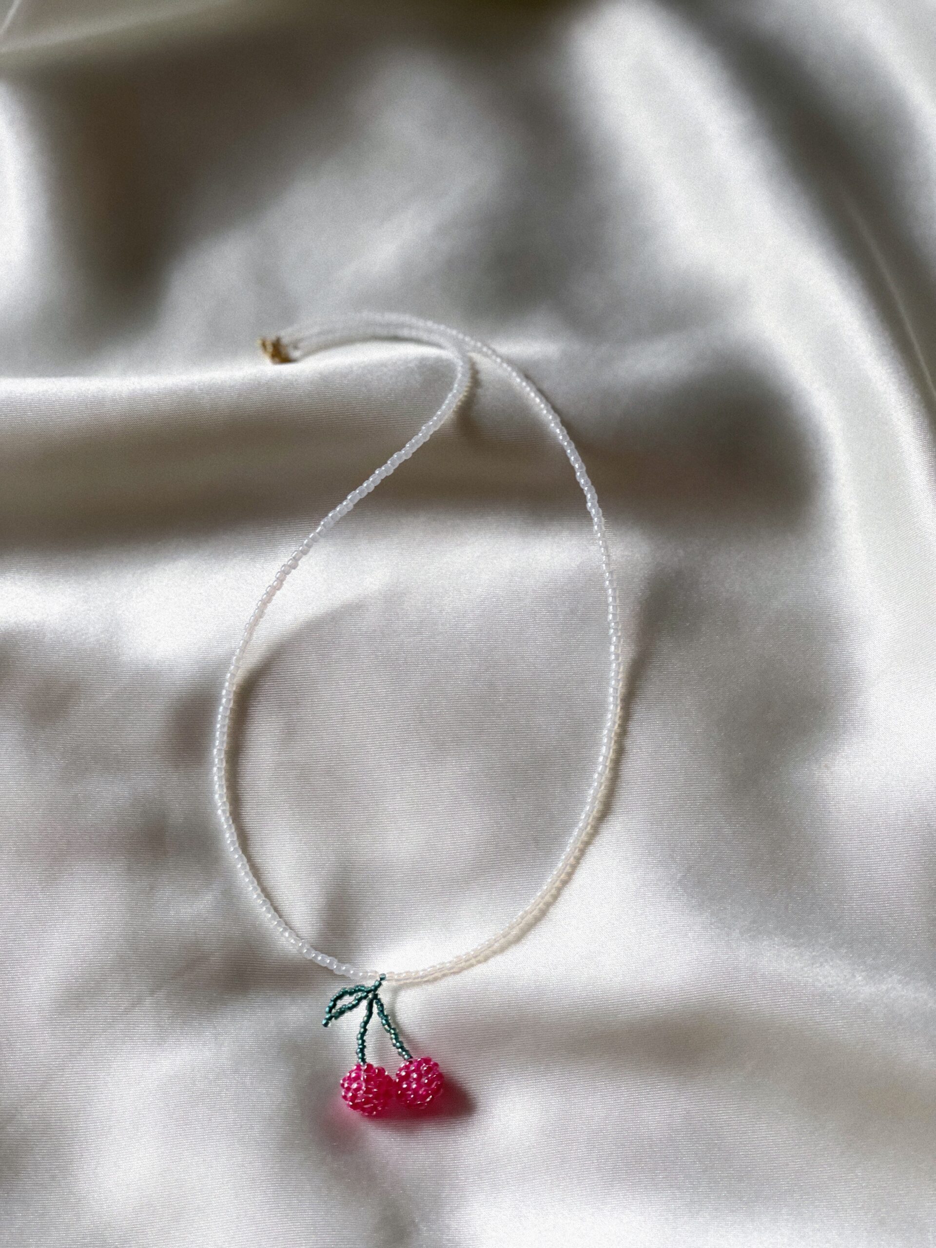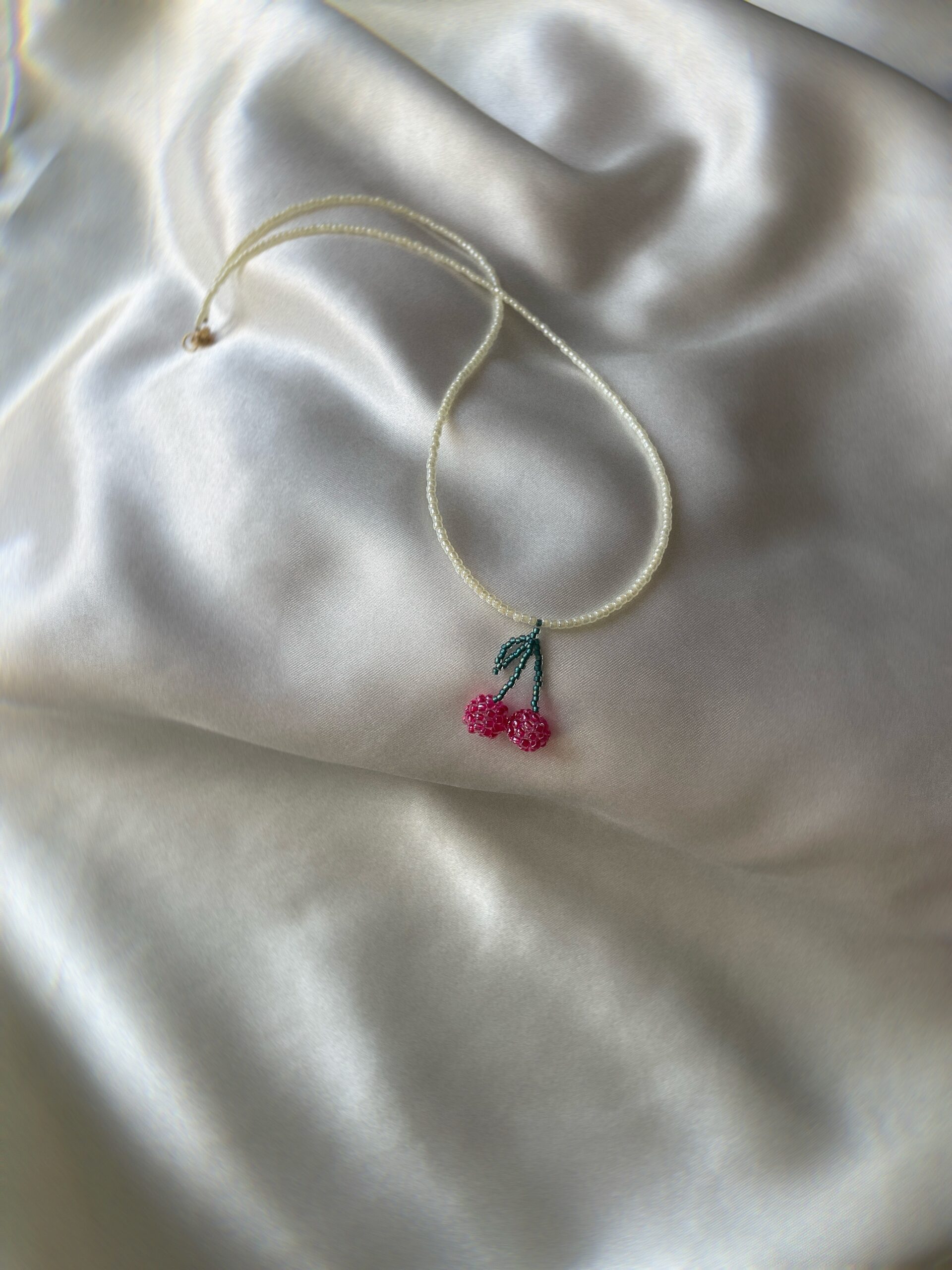 Ręcznie robiony naszyjnik z najlepszej jakości koralików, ozdobiony zawieszką z soczystymi wisienkami. To energetyczny, letni akcent, który ożywia stylizację i przyciąga spojrzenia — idealny dla miłośniczek owocowej biżuterii z charakterem.