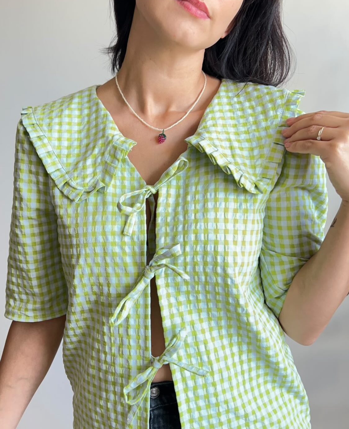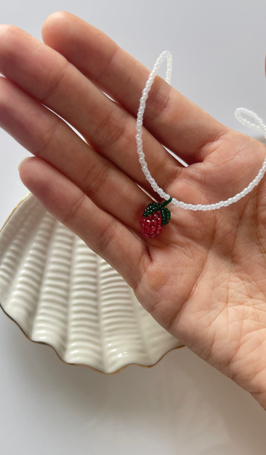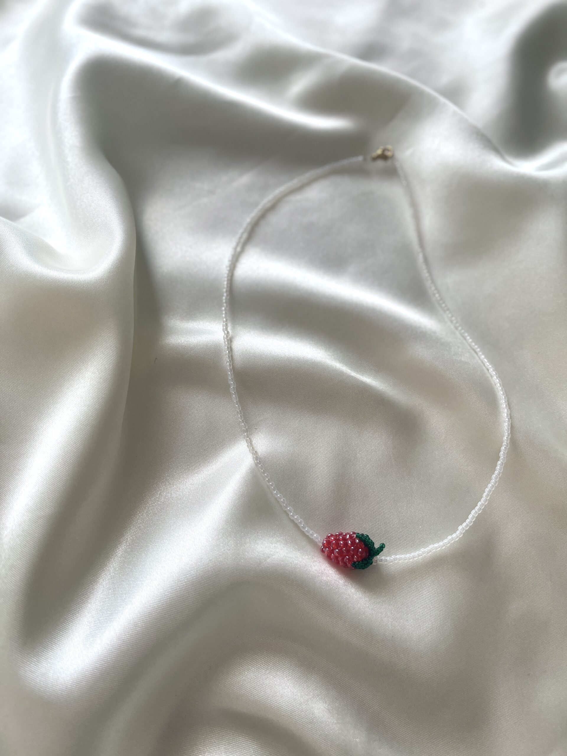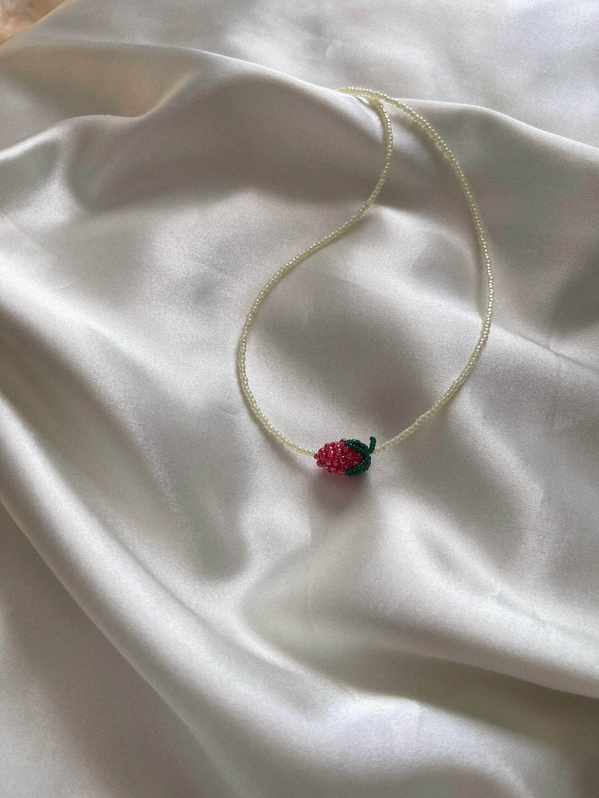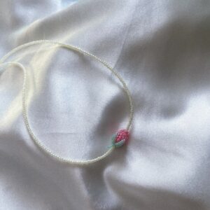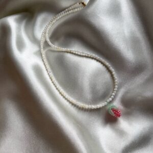 Ręcznie robiony naszyjnik z koralików, ozdobiony uroczą zawieszką w formie truskawki — słodki, letni akcent, który doda uroku i świeżości każdej stylizacji.
