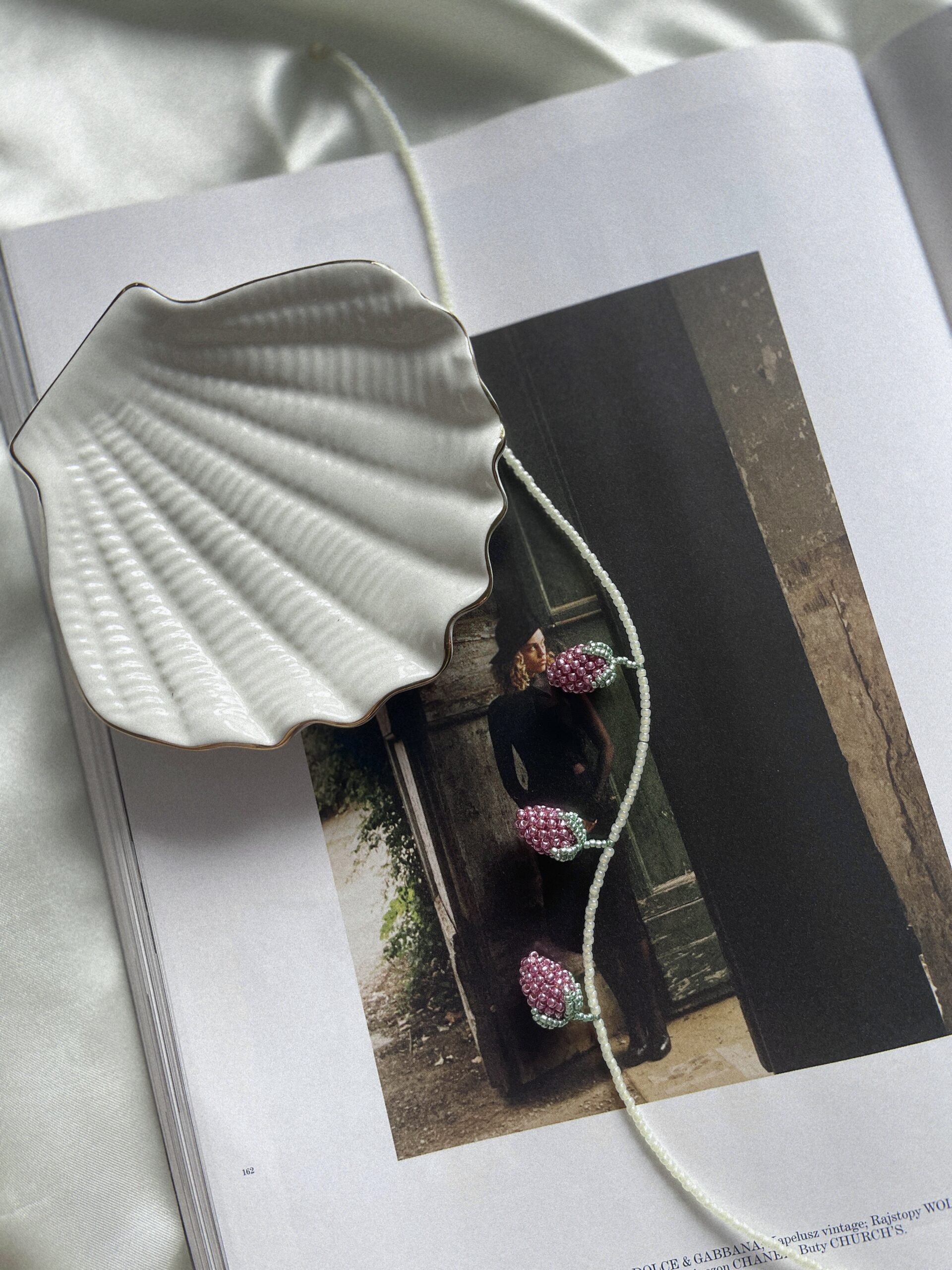 Ręcznie robiony naszyjnik z najlepszej jakości koralików, ozdobiony trzema zawieszkami w kształcie malin z. To wyjątkowa kompozycja dla miłośniczek biżuterii z owocowym akcentem — subtelnej, ale z charakterem.