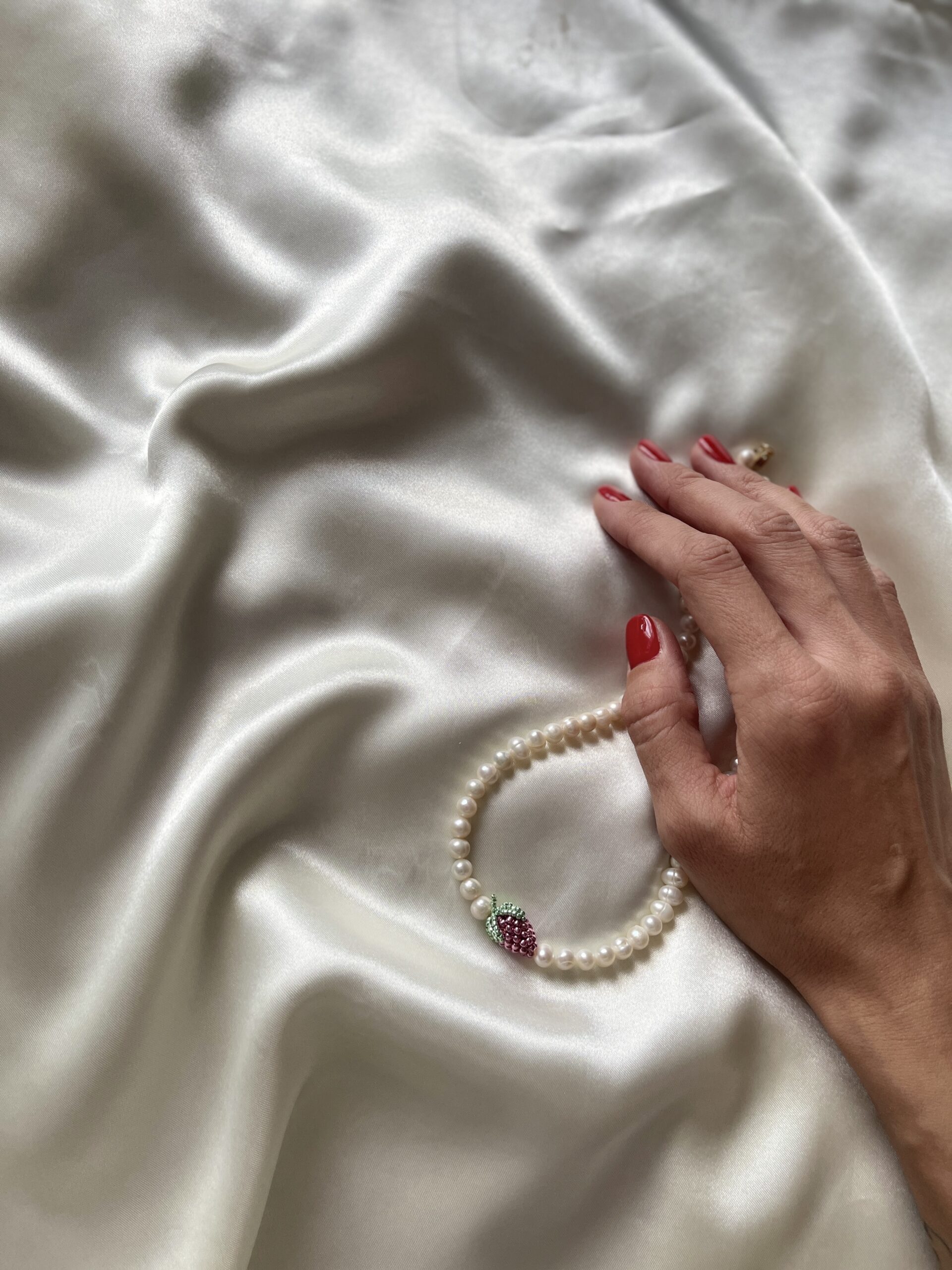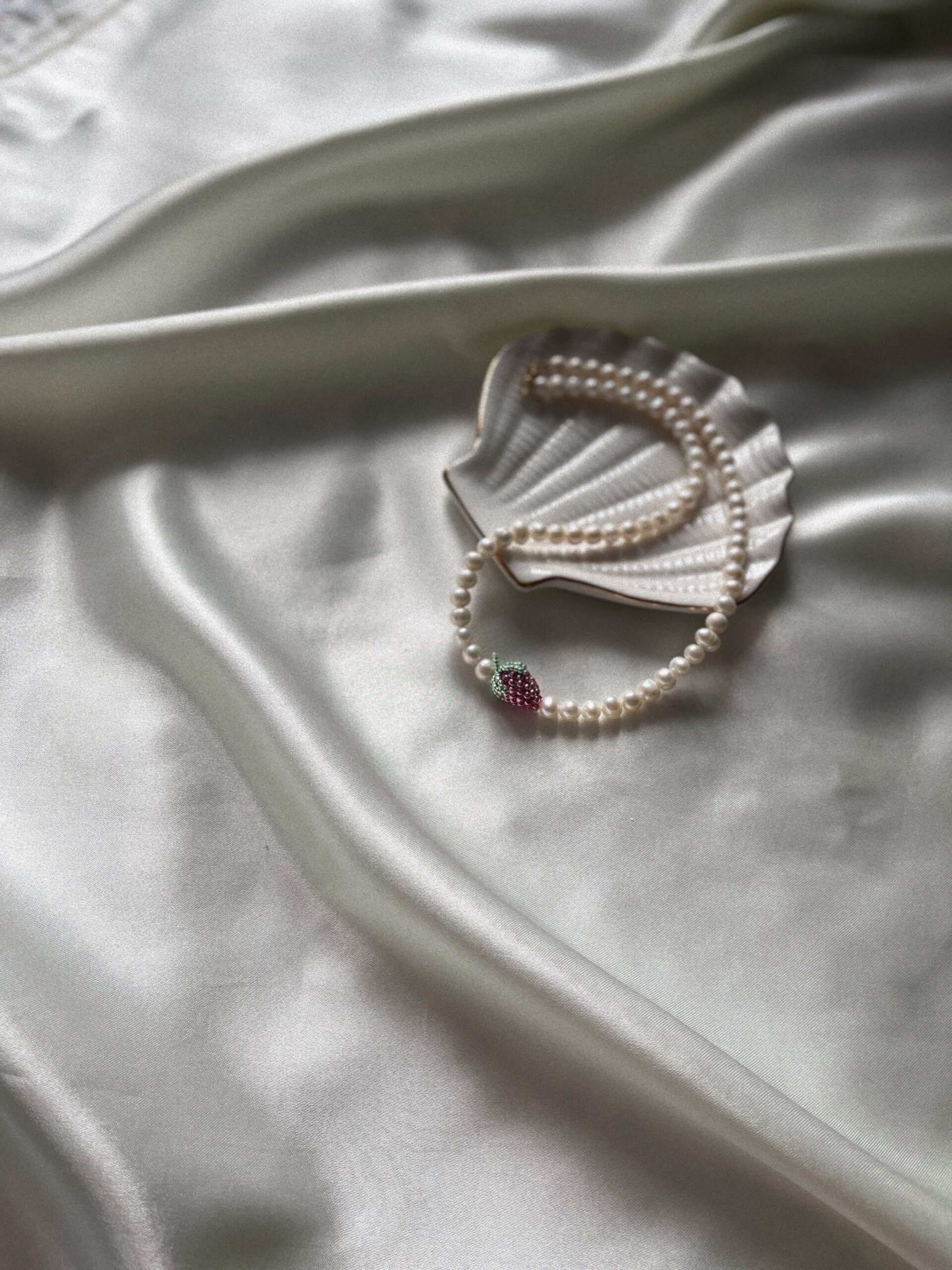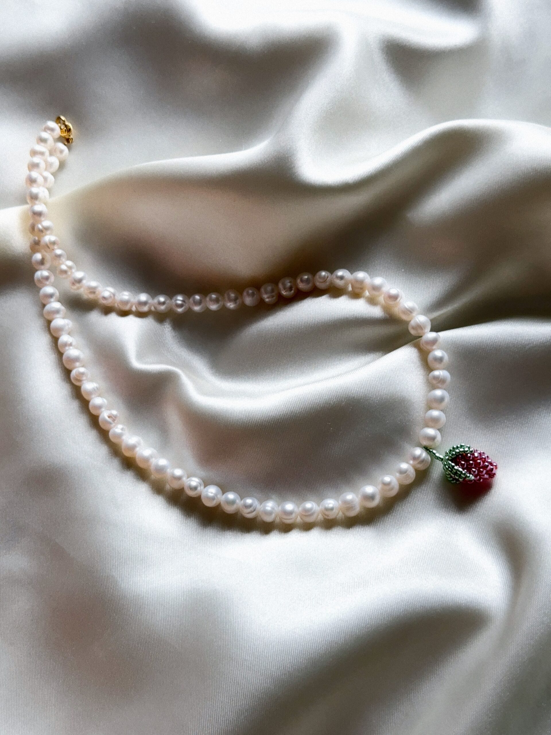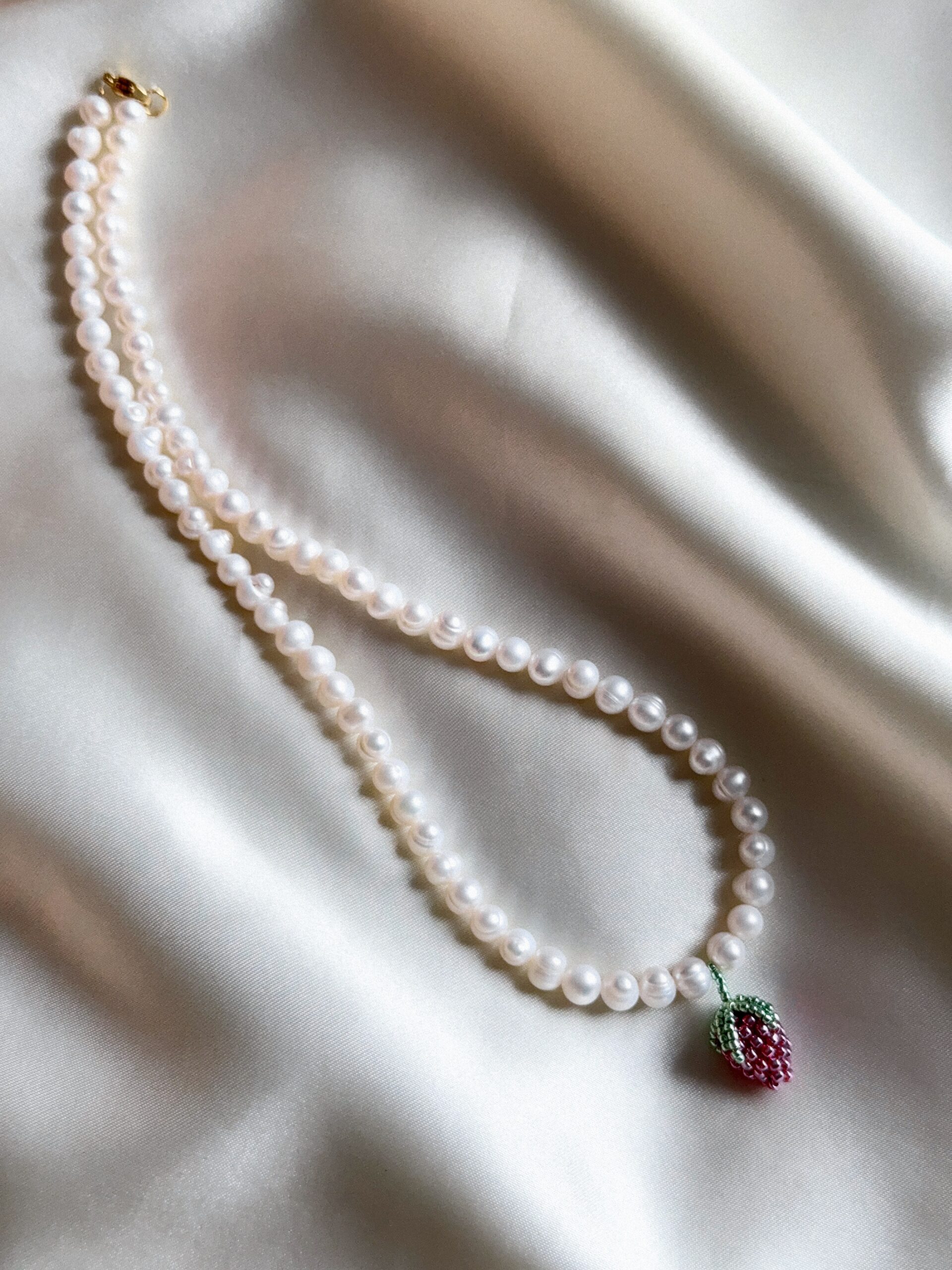 Ręcznie robiony naszyjnik z naturalnych pereł o średniej wielkości, wykończony efektowną zawieszką w kształcie metalicznej maliny. To subtelne, ale wyróżniające się połączenie klasyki z owocowym akcentem. Lśniące perły nadają całości elegancji, a malinka w metalicznym kolorze przyciąga wzrok i dodaje biżuterii niepowtarzalnego charakteru.