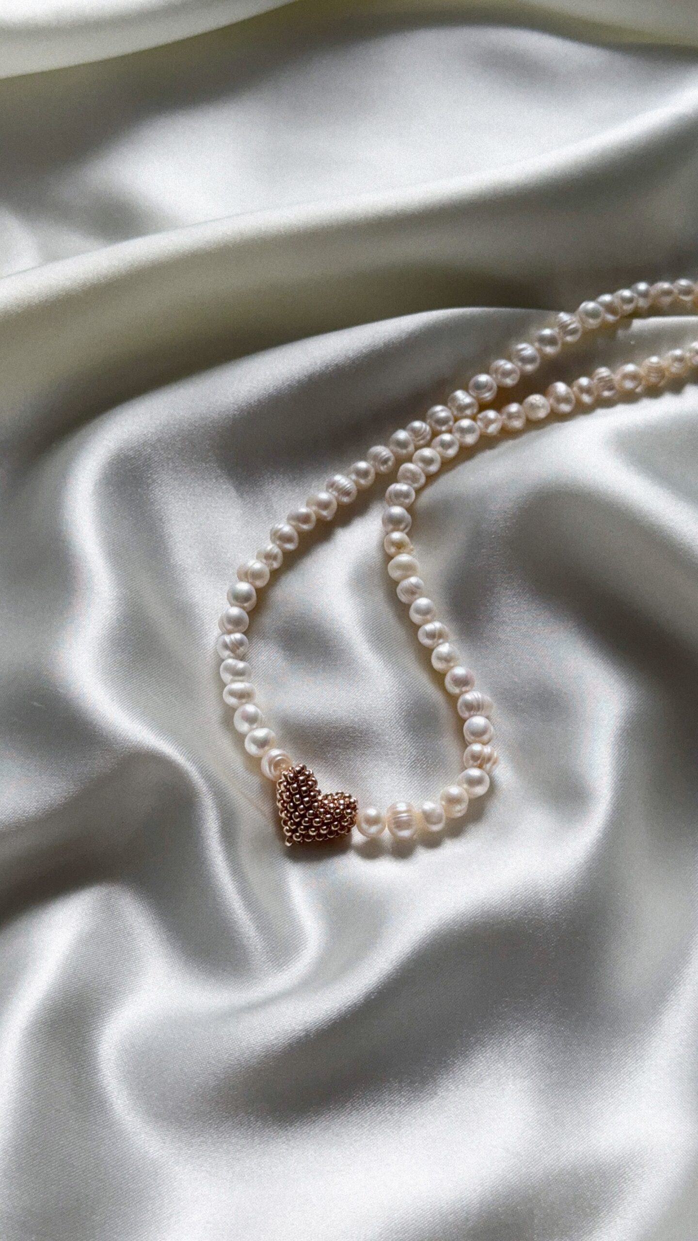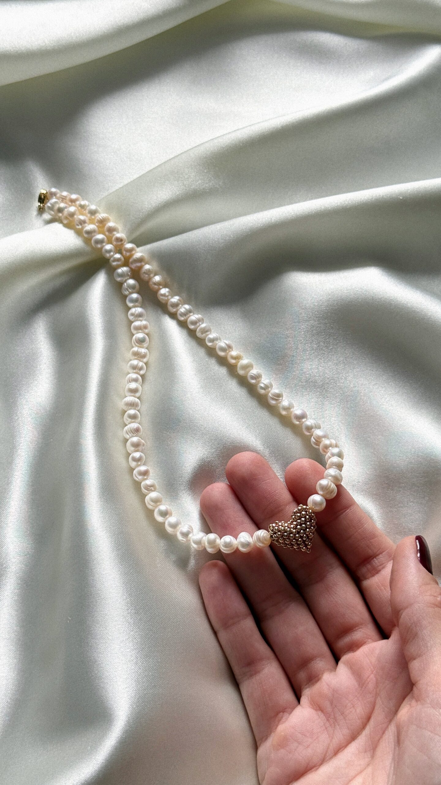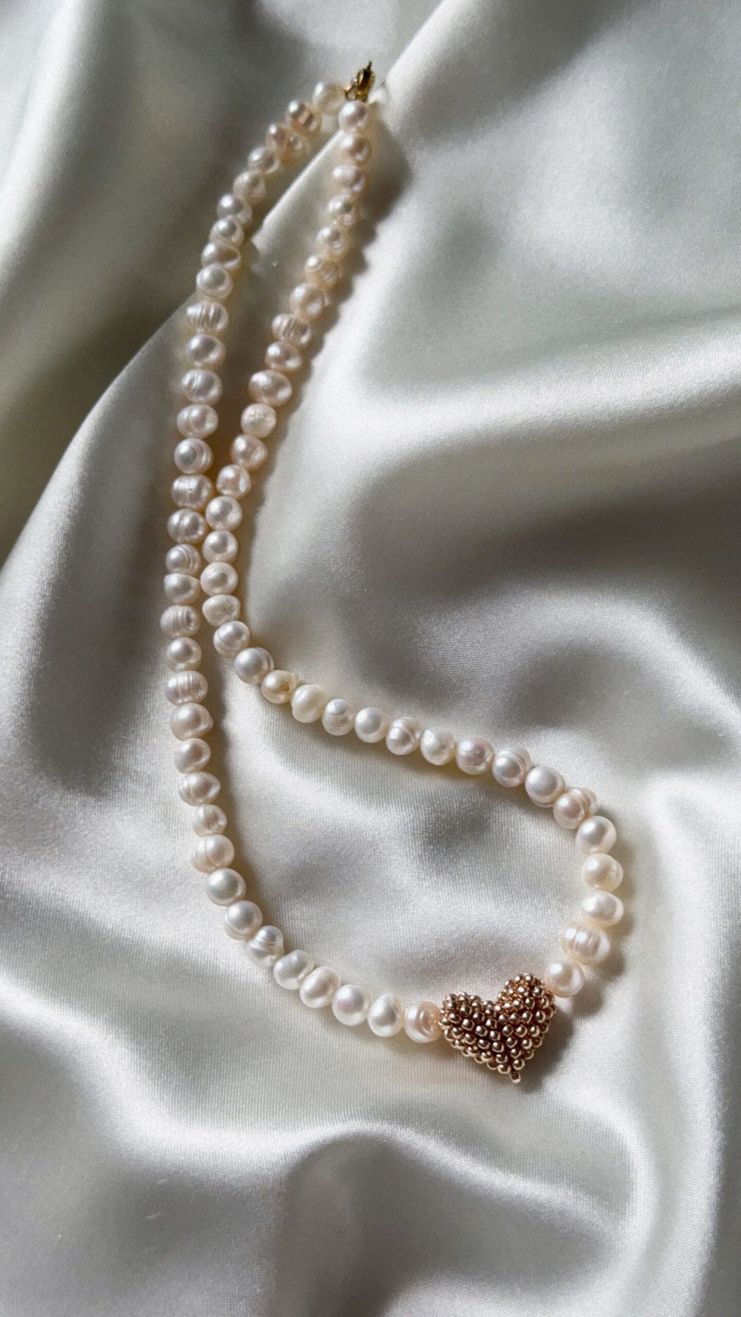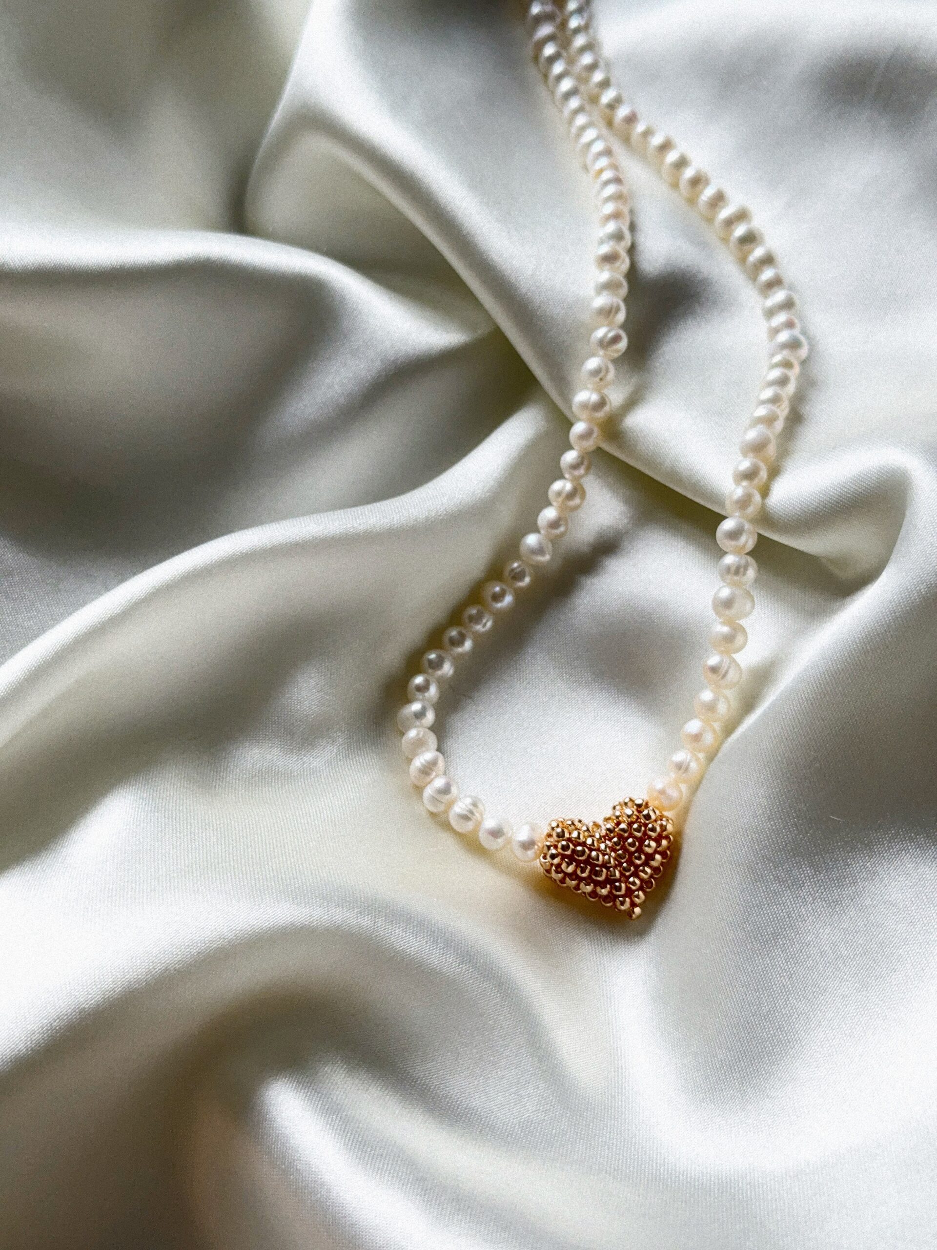 Delikatny, ręcznie robiony naszyjnik z naturalnych pereł średniej wielkości, ozdobiony zawieszką w kształcie złotego serca z drobnych koralików.