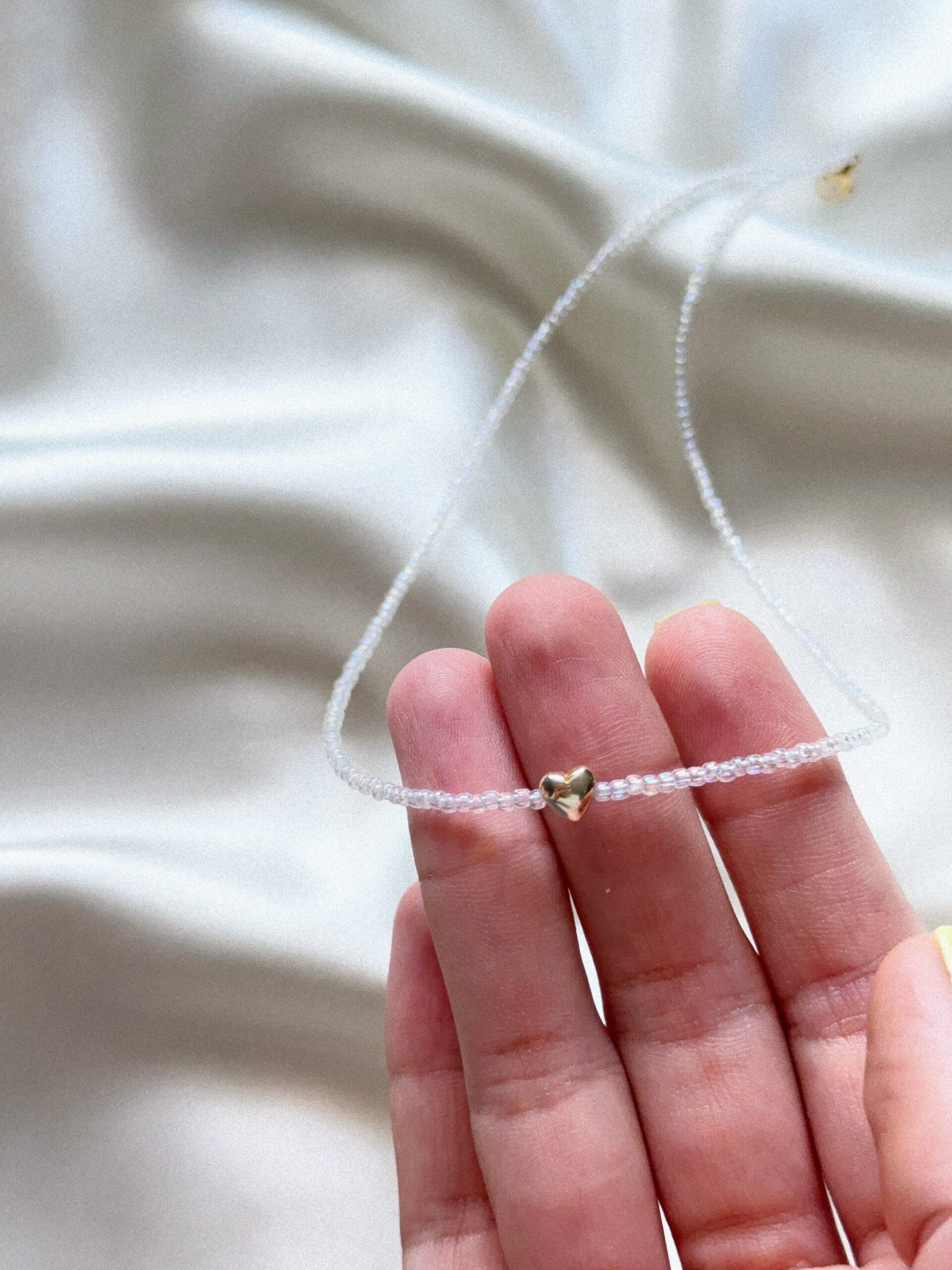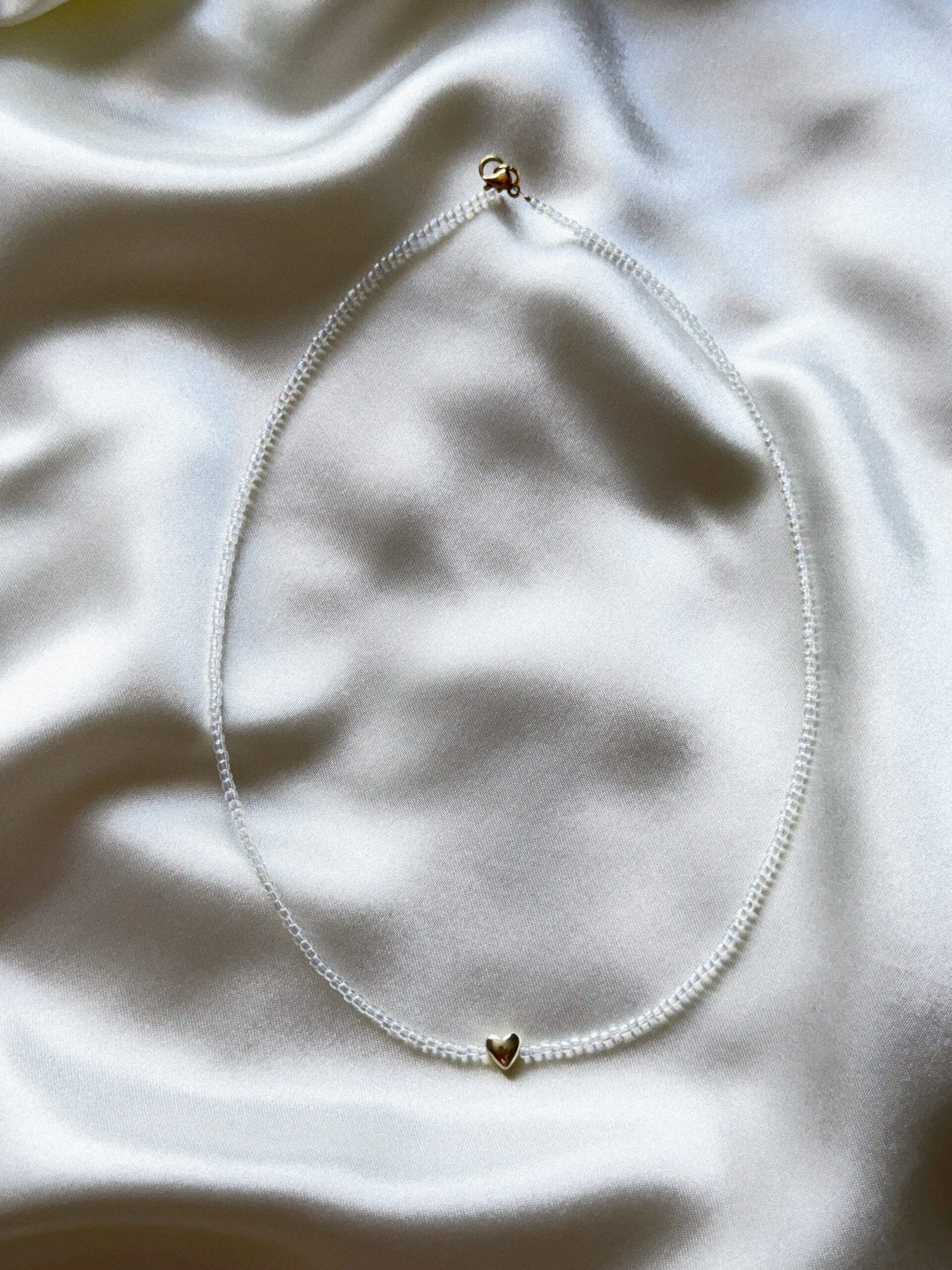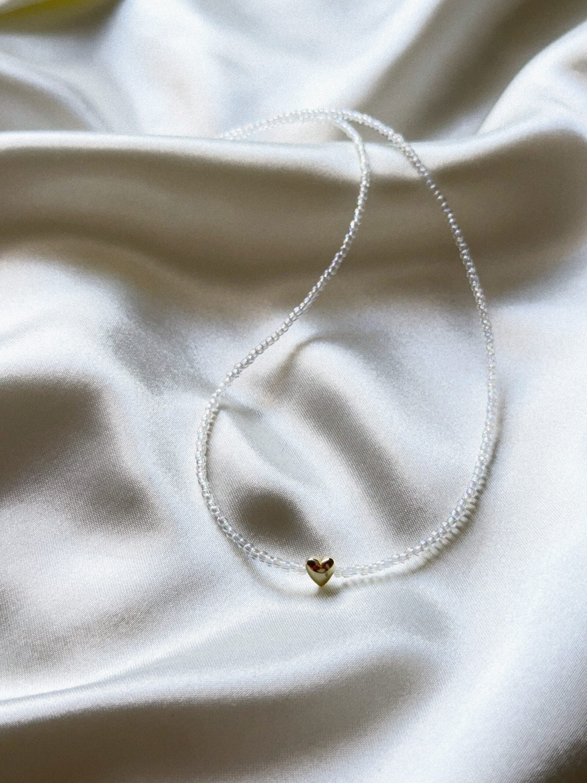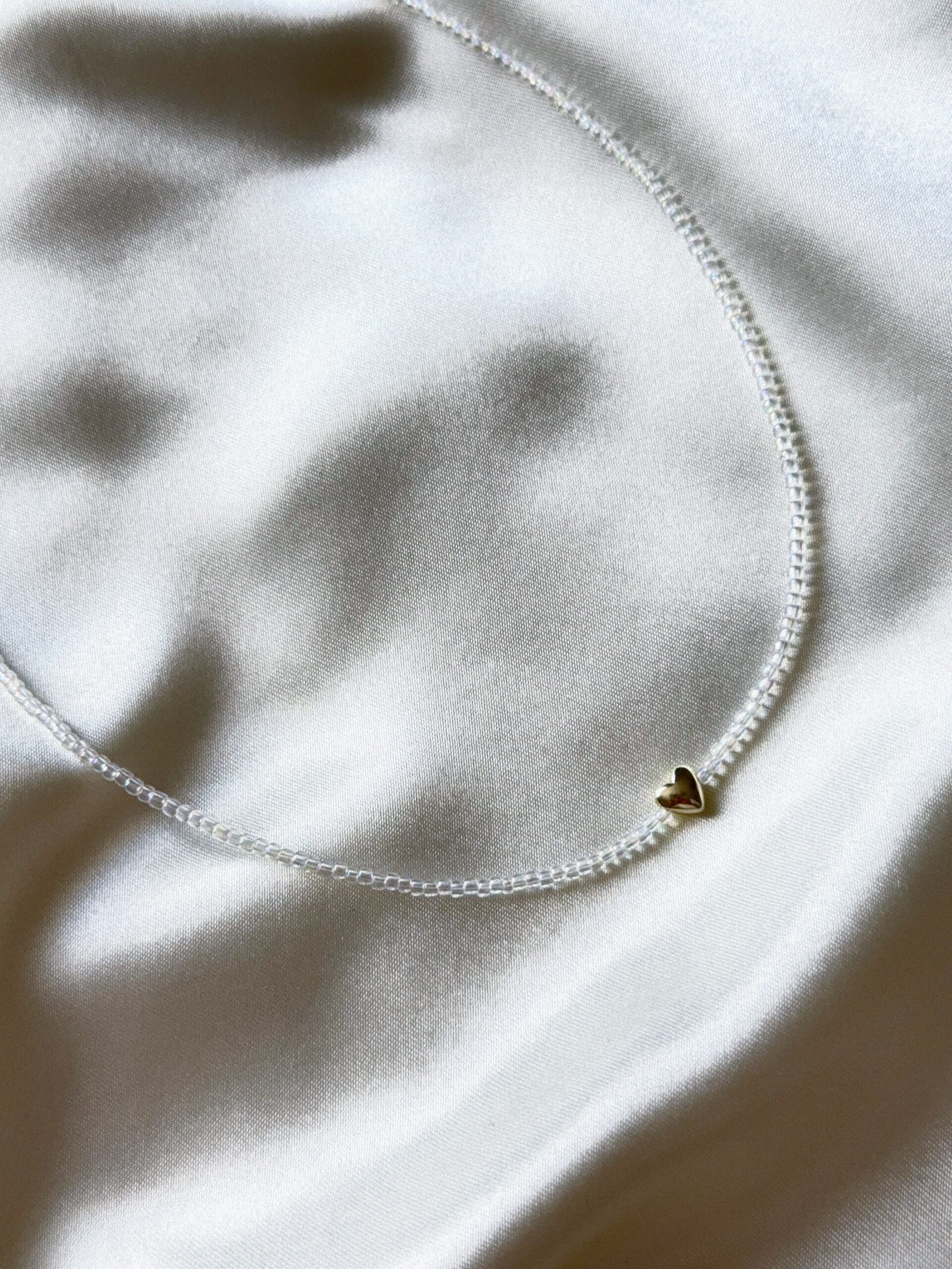 Ręcznie wykonany, subtelny naszyjnik z drobnych koralików, ozdobiony małym serduszkiem z hematytu – kamienia znanego z ochronnych właściwości i zdolności zamiany negatywnej energii w pozytywną. W starożytności był talizmanem wojowników, dziś noszony jest jako amulet przyciągający dobre wibracje.