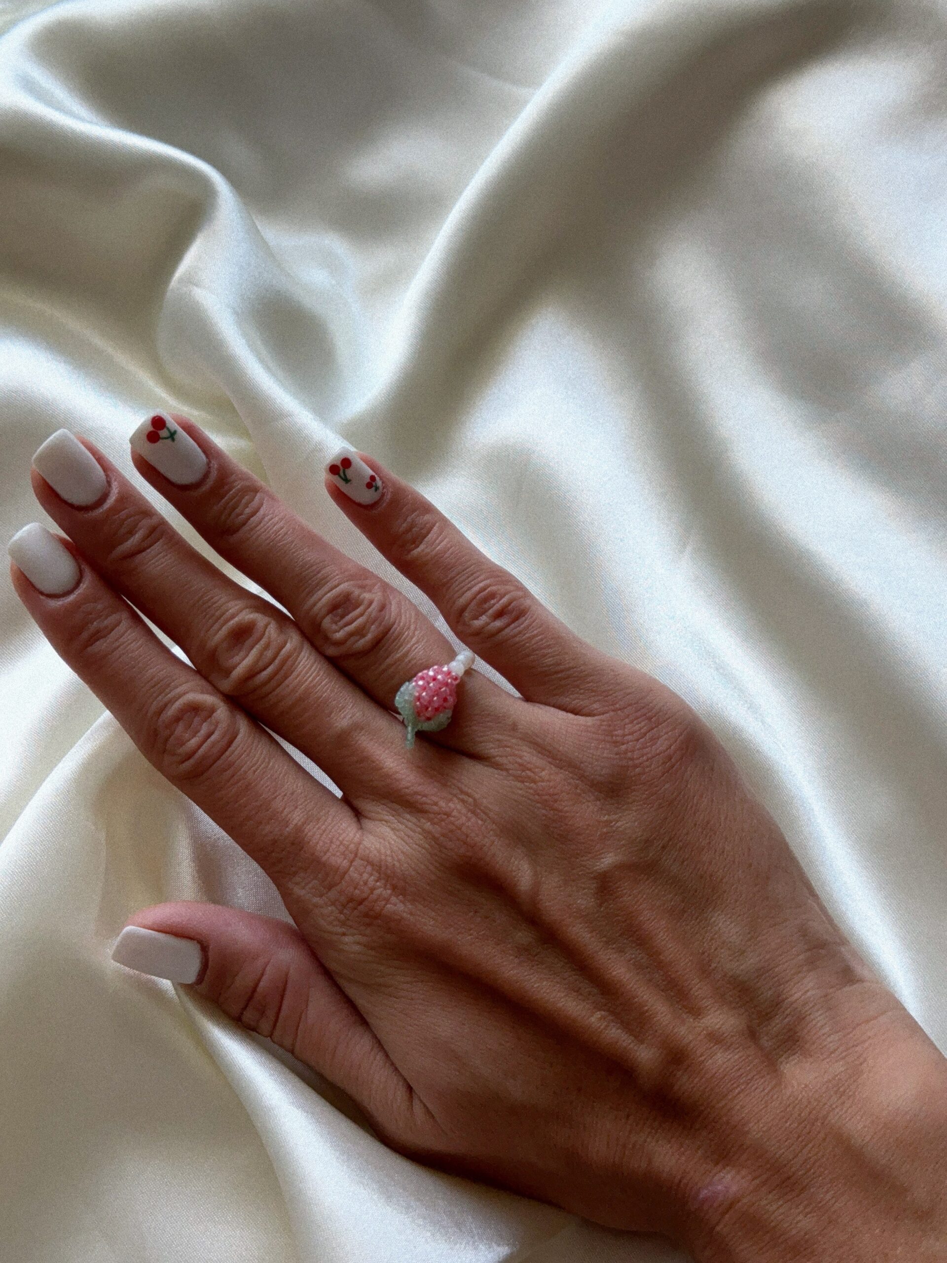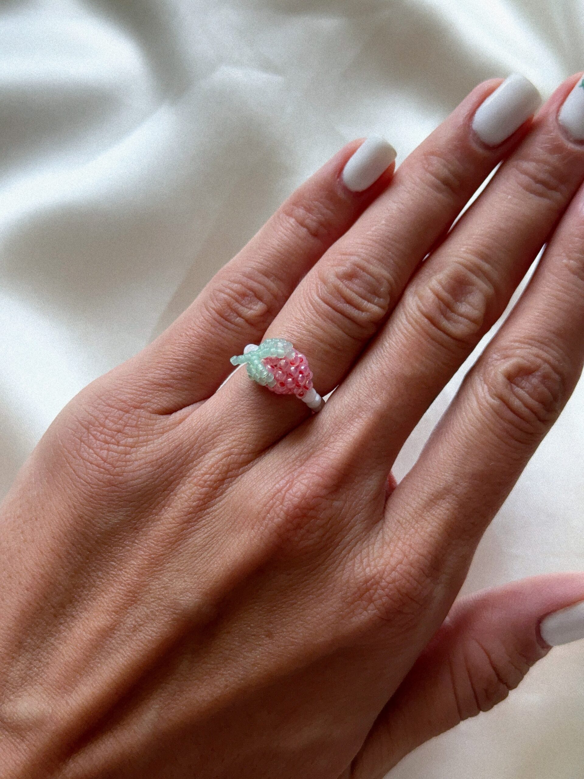 Delikatny, ręcznie robiony pierścionek z masy perłowej, ozdobiony koralikową malinką.