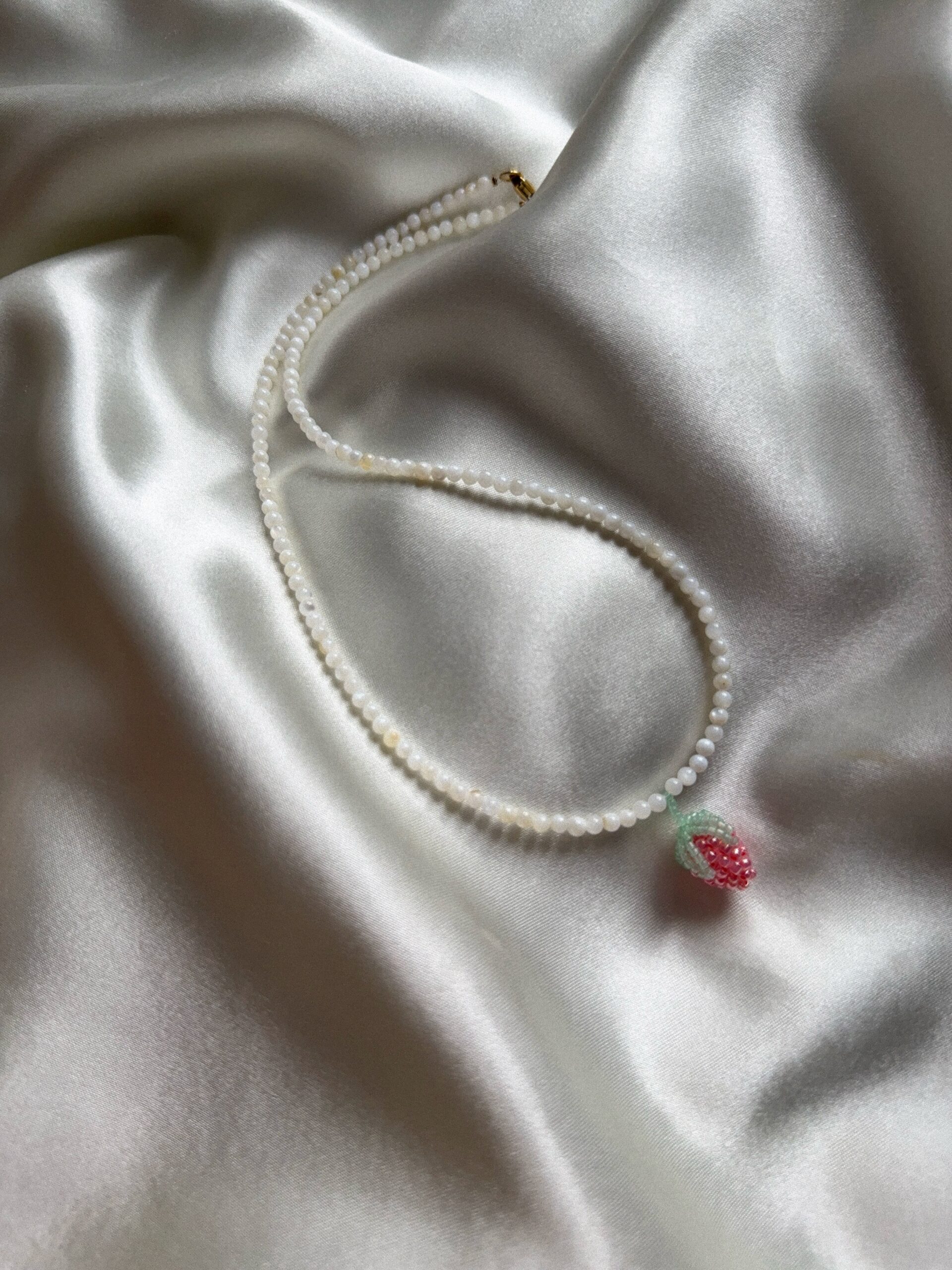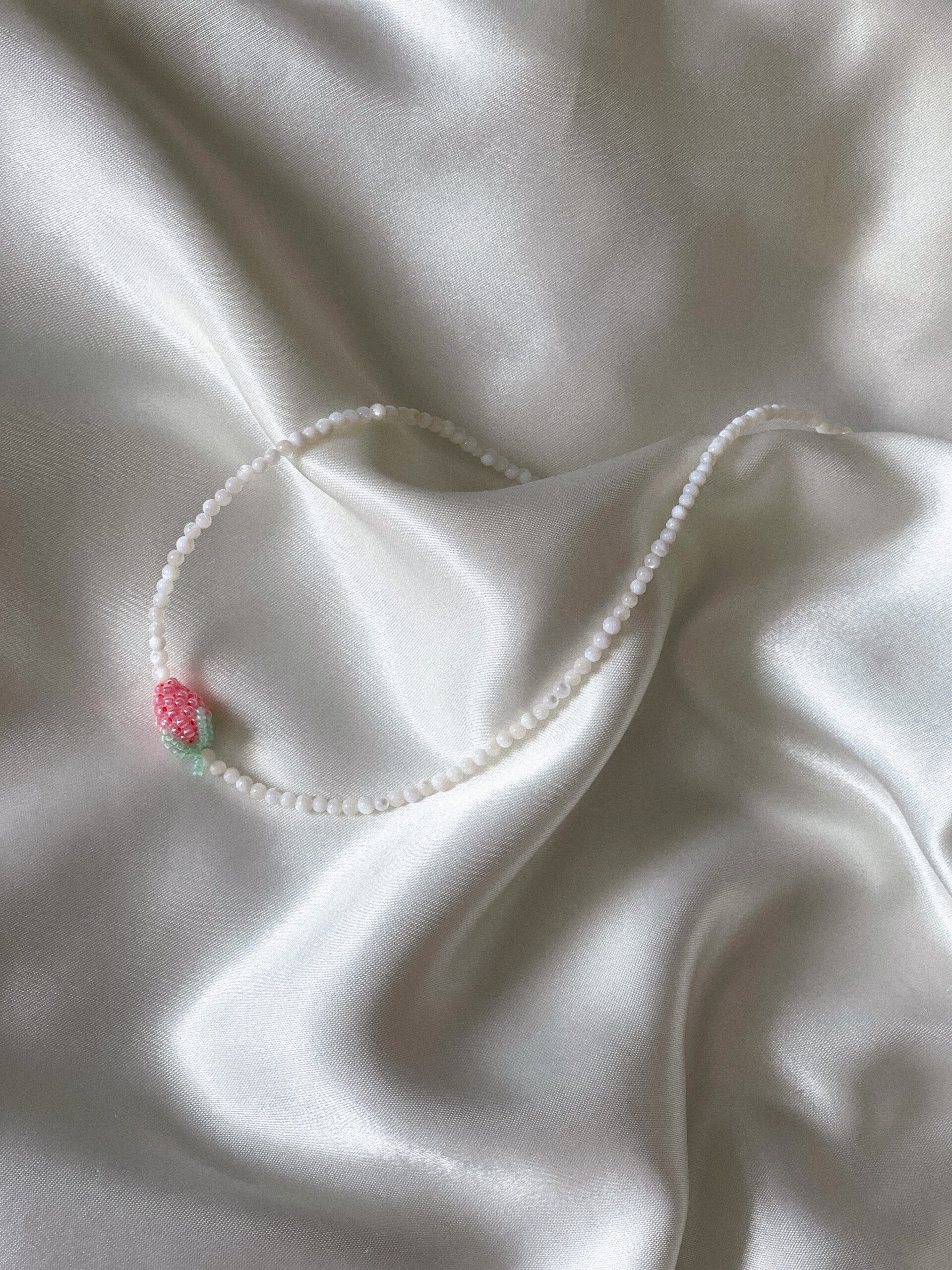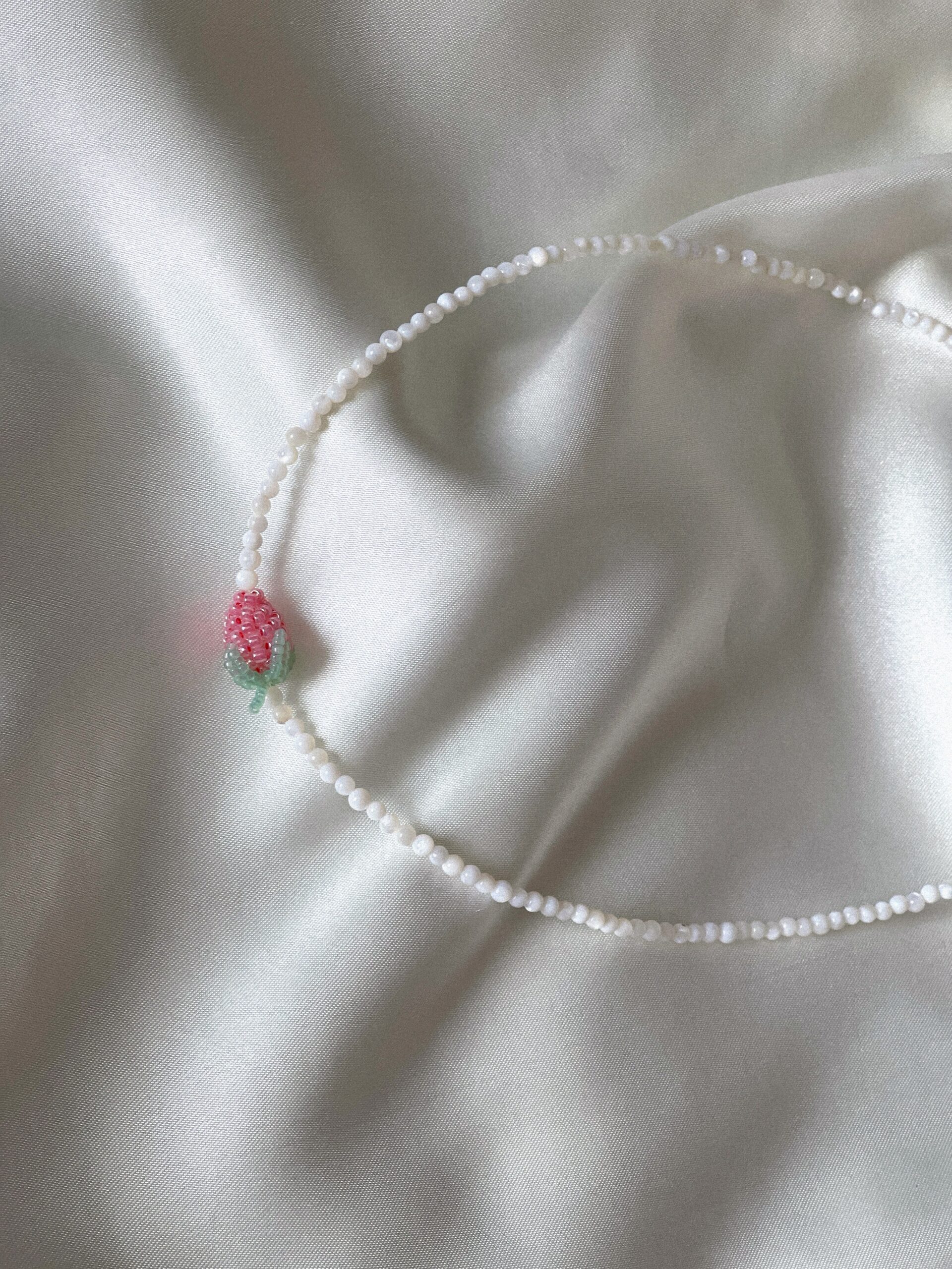 Subtelny i pełen uroku naszyjnik wykonany z naturalnej masy perłowej, ozdobiony maliną z koralików w odcieniach różu o delikatnym połysku. To wyjątkowe połączenie klasycznej perły i słodkiego owocowego detalu sprawia, że naszyjnik przyciąga wzrok, zachowując przy tym lekkość i elegancję.