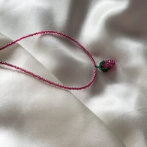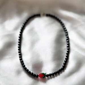 Elegancki, ręcznie robiony naszyjnik z dużych, czarnych koralików, ozdobiony zawieszką w kształcie soczystej, czerwonej truskawki. Połączenie głębokiej czerni z energetycznym akcentem owocu sprawia, że naszyjnik ma wyjątkowy charakter – klasyczny, ale z nutą odważnej świeżości. Truskawka przyciąga wzrok i dodaje całości lekkości oraz odrobiny zabawy, dzięki czemu naszyjnik świetnie sprawdzi się zarówno w codziennych stylizacjach,…
