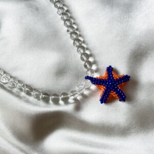 Ręcznie tworzony, wyrazisty naszyjnik z większych koralików o eleganckim połysku – centralną ozdobą jest gwiazda w odcieniach granatu i pomarańczu, stworzona z drobnych koralików. Jej barwy przywodzą na myśl tropikalny zachód słońca, dodając naszyjnikowi wyjątkowej głębi i charakteru. Zapięcie ze stali chirurgicznej gwarantuje trwałość i komfort noszenia, także dla wrażliwej skóry. Długość: 42–43 cm Każdy…