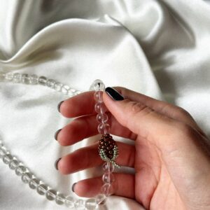 Ręcznie robiony naszyjnik ze szklanych, przezroczystych koralików, ozdobiony większym brązowym owocem. Przejrzyste koraliki pięknie łapią światło, a ciepły, brązowy akcent nadaje całości naturalnego uroku i subtelnej elegancji. Zapięcie wykonane ze stali chirurgicznej jest bezpieczne dla wrażliwej skóry i zapewnia komfort noszenia. Długość standardowa: ok. 42–43 cm. Każdy egzemplarz powstaje ręcznie, dlatego może delikatnie różnić się…