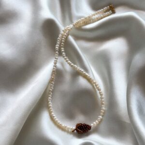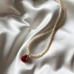 Ręcznie robiony naszyjnik z drobnych, kremowych perełek, ozdobiony ciemnoczerwonym owocem ze złotym listkiem. Połączenie naturalnego połysku perełek z rubinowym akcentem tworzy kompozycję pełną elegancji, delikatności i subtelnego uroku. Zapięcie ze stali chirurgicznej zapewnia trwałość i komfort noszenia — także dla osób o wrażliwej skórze. Długość standardowa: 42–43 cm Każdy model powstaje ręcznie i z dbałością…