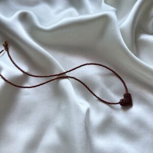 Unikatowy, ręcznie robiony naszyjnik z drobnych brązowych koralików, ozdobiony małym serduszkiem w ciepłym, karmelowo-brązowym odcieniu. Subtelny, ale wyrazisty dodatek, który pięknie prezentuje się solo lub w duecie z innymi naszyjnikami z kolekcji Perelka_mi. Zapięcie wykonane ze stali chirurgicznej w złotym kolorze – trwałe, hipoalergiczne i bezpieczne dla wrażliwej skóry. Długość naszyjnika: ok. 42–43 cm Każdy…