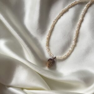 Ręcznie robiony naszyjnik z drobnych perełek, ozdobiony maleńkim brązowym owocem wykonanym z koralików. To połączenie klasycznej elegancji pereł z ciepłym, naturalnym akcentem, który przywodzi na myśl jesienne kolory i miękkie światło słońca. Delikatny, subtelny i pełen uroku – idealny zarówno do codziennych stylizacji, jak i na wyjątkowe okazje. Naszyjnik ma długość 42–43 cm i został…