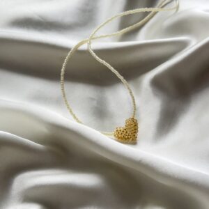 Unikatowy, ręcznie robiony naszyjnik z drobnych, jasnych koralików, ozdobiony ażurowym serduszkiem utkanym z maleńkich złotych koralików. Delikatny, lekki i subtelny – jak szept biżuterii. Pięknie prezentuje się solo, ale też idealnie nadaje się do warstwowych zestawień z innymi naszyjnikami Perelka_mi. Zapięcie wykonane ze stali chirurgicznej w złotym kolorze – trwałe i bezpieczne dla wrażliwej skóry….