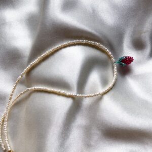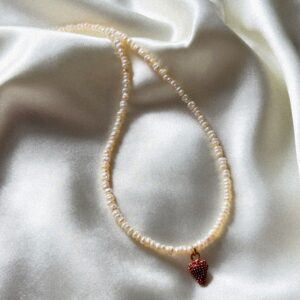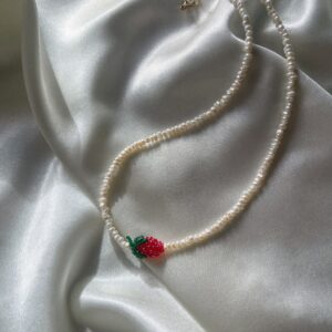 Delikatny naszyjnik wykonany ręcznie z drobnych, naturalnych pereł, ozdobiony emaliowaną zawieszką w kształcie poziomki. Połączenie subtelnej klasyki z uroczym, owocowym akcentem sprawia, że to biżuteria pełna wdzięku — idealna zarówno na co dzień, jak i na wyjątkowe okazje. Zapięcie ze stali chirurgicznej zapewnia trwałość i komfort noszenia, również dla osób o wrażliwej skórze. Długość standardowa:…