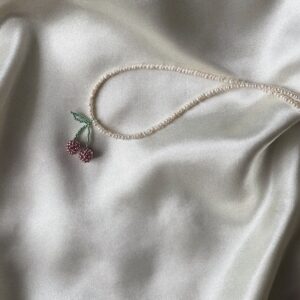 Ręcznie robiony naszyjnik z drobnych naturalnych pereł, ozdobiony zawieszką w kształcie pastelowo różowych wiśni z koralików. To subtelna, a zarazem unikatowa biżuteria, która łączy klasyczną elegancję drobnych pereł z lekkim, owocowym akcentem. Wisienki w delikatnym, metalicznym różu mienią się w świetle, dodając całości romantycznego blasku i odrobiny fantazji. Zapięcie ze stali chirurgicznej zapewnia trwałość i…
