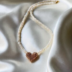 Ręcznie robiony naszyjnik z drobnych, naturalnych pereł, ozdobiony zawieszką w kształcie złotego serca. To subtelna i elegancka biżuteria, w której klasyka pereł spotyka się z nowoczesnym, stylowym akcentem. Złote serce dodaje naszyjnikowi blasku i sprawia, że pasuje zarówno do codziennych stylizacji, jak i wyjątkowych okazji. Zapięcie ze stali chirurgicznej zapewnia trwałość i wygodę także dla…