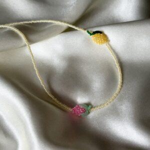 Ręcznie robiony naszyjnik z drobnych koralików, ozdobiony dwoma owocami – różową maliną i cytrynką, wykonanymi ręcznie z maleńkich koralików. To delikatna, a jednocześnie wyrazista biżuteria, która dodaje stylizacji świeżości i lekkości. Owoce pięknie kontrastują z koralikami, tworząc naszyjnik pełen letniego uroku i dziewczęcego charakteru. Naszyjnik ma długość około 42–43 cm, dzięki czemu subtelnie układa się…