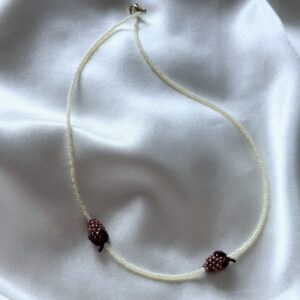 Ręcznie robiony naszyjnik z drobnych kremowych koralików, ozdobiony dwoma brązowymi owocami w formie uroczych żołędzi, wykonanymi ręcznie z maleńkich koralików. To biżuteria pełna naturalnego uroku – delikatna, a zarazem nietuzinkowa. Kremowe koraliki pięknie współgrają z brązowymi akcentami, tworząc subtelną, jesienną kompozycję, idealną zarówno do codziennych stylizacji, jak i bardziej eleganckich zestawów. Naszyjnik ma długość około…