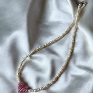 Delikatny, ręcznie wykonany naszyjnik z drobnych, naturalnych pereł, ozdobiony zawieszką w kształcie różowego serduszka z koralików. Zapięcie wykonane ze stali chirurgicznej zapewnia trwałość i komfort noszenia, także dla osób o wrażliwej skórze. Długość naszyjnika: około 42–43 cm Każdy naszyjnik tworzony jest ręcznie i z dbałością o najmniejsze detale, dlatego może nieznacznie różnić się od modelu…