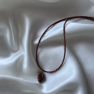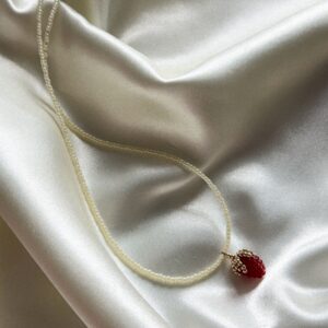 Ręcznie robiony naszyjnik z kremowych koralików, ozdobiony ciemnoczerwonym owocem ze złotym listkiem. Połączenie delikatnych, kremowych koralików z rubinowym akcentem tworzy kompozycję pełną lekkości, elegancji i subtelnego uroku. Zapięcie ze stali chirurgicznej zapewnia trwałość i komfort noszenia — także dla osób o wrażliwej skórze. Długość standardowa: 42–43 cm Każdy model powstaje ręcznie i z dbałością o…