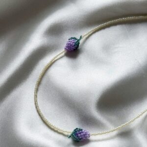 Ręcznie robiony naszyjnik z drobnych koralików, ozdobiony dwoma owocami – jasnymi jeżynkami wykonanymi ręcznie z maleńkich koralików. To delikatna, a jednocześnie wyrazista biżuteria, która doda stylizacji świeżości i subtelnego uroku. Jasne owoce pięknie kontrastują z koralikami, tworząc kompozycję o dziewczęcym, lekkim charakterze. Naszyjnik ma długość około 42–43 cm, dzięki czemu subtelnie układa się na szyi…