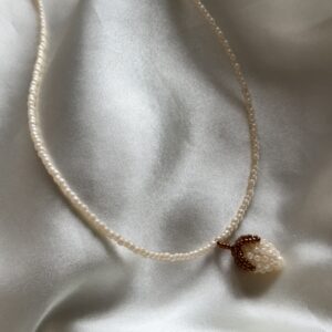 Ręcznie robiony naszyjnik z drobnych koralików, ozdobiony subtelną zawieszką w formie delikatnego, perłowego owocu w jasnobeżowym, waniliowym odcieniu. Całość tworzy lekką, harmonijną kompozycję inspirowaną naturą — ciepłą, spokojną i bardzo kobiecą. Naszyjnik utrzymany jest w jednolitej, kremowo-beżowej kolorystyce, dzięki czemu pięknie dopełnia zarówno codzienne stylizacje, jak i bardziej eleganckie zestawy. Zapięcie ze stali chirurgicznej zapewnia…