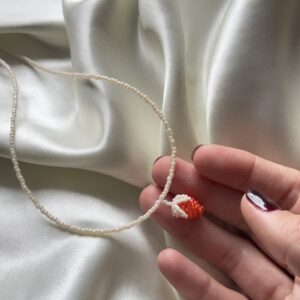 Ręcznie robiony naszyjnik z wysokiej jakości koralików, ozdobiony zawieszką w kształcie czerwonego owocu z delikatnym, jasnobeżowym listkiem. Subtelny detal inspirowany naturą, który przyciąga spojrzenia i dodaje stylizacji wyjątkowego uroku. To kobiecy, lekki akcent, który pięknie dopełni zarówno codzienne, jak i bardziej eleganckie zestawy. Złote koraliki podkreślają ciepły charakter kompozycji, tworząc harmonijną, ponadczasową całość Zapięcie ze…