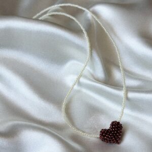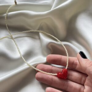Delikatny, ręcznie robiony naszyjnik wykonany z drobnych koralików, ozdobiony uroczym czerwonym serduszkiem z subtelnym połyskiem. Romantyczny, a zarazem minimalistyczny – pięknie prezentuje się solo lub w duecie z owocowym naszyjnikiem z kolekcji Perelka mi. Zapięcie wykonane ze stali chirurgicznej w złotym kolorze – trwałe i bezpieczne także dla wrażliwej skóry. Długość naszyjnika: ok. 42–43…