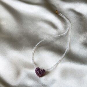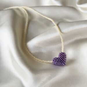 Delikatny, ręcznie robiony naszyjnik wykonany z drobnych koralików, ozdobiony serduszkiem uplecionym z koralików w subtelnym, metalicznym odcieniu fioletu. Serduszko ma delikatniejszy, lekko połyskujący kolor, który dodaje naszyjnikowi elegancji i wyjątkowego charakteru, a jednocześnie pozostaje subtelne i uniwersalne. Naszyjnik pięknie prezentuje się solo, ale również w duecie z owocowymi naszyjnikami z kolekcji Perelka mi. Zapięcie wykonane…