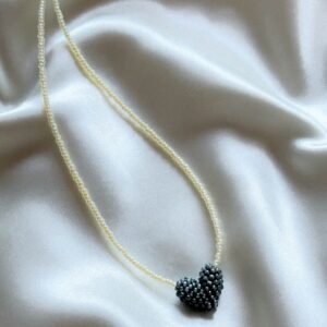 Delikatny, ręcznie robiony naszyjnik wykonany z drobnych koralików, ozdobiony czarnym serduszkiem uplecionym z koralików. Romantyczny, a zarazem minimalistyczny – pięknie prezentuje się solo lub w duecie z owocowym naszyjnikiem z kolekcji Perelka_mi. • Zapięcie wykonane ze stali chirurgicznej w złotym kolorze – trwałe i bezpieczne także dla wrażliwej skóry • Długość naszyjnika: ok. 42–43 cm…